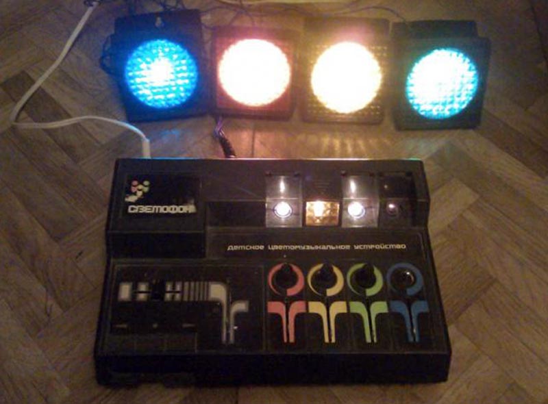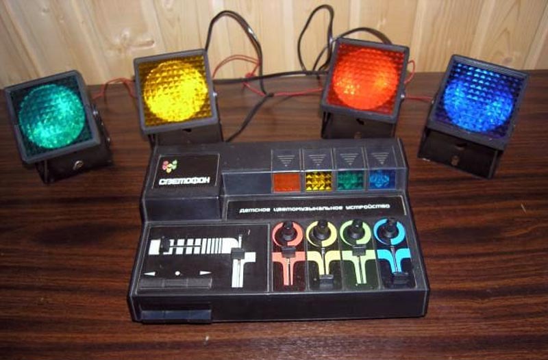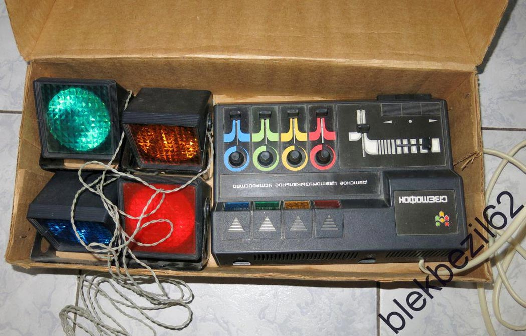Детское цветомузыкальное устройство *Светофон* выпускался с 1986 года. ЦМУ предназначено для цветового сопровождения музыкальных программ. 4 канала, режим *бегущий огонь*, регулировка яркости каждого канала. Фонари низковольтные (лампочки 13.5 В).