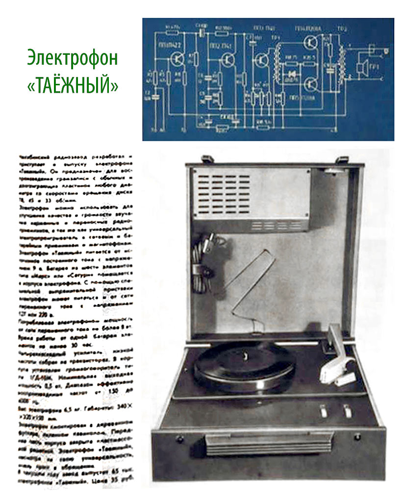 Переносной транзисторный электрофон *Таёжный* выпускался с 1965 года Челябинским радиозаводом. Электрофон работает от 6-ти батарей А-373 или от сети переменного тока с помощью отдельного БП. Электрофон трёхскоростной, собран на 5-ти транзисторах. Максимальная выходная мощность - 0,5 Вт. Диапазон воспроизводимых частот 150...8000 Гц. Имеется регулятор тембра по ВЧ и вход для внешнего источника сигнала. Габариты модели 340 х 220 х 130 мм. Вес 6,5 кг.