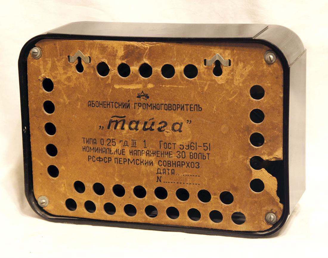 Абонентский громкоговоритель "Тайга" с 1956 года выпускал Пермский телефонный завод. Абонентский громкоговоритель "Тайга" предназначен для воспроизведения радиовещания, передаваемой по радиотрансляционным сетям с напряжением 30 вольт. Потребляемая мощность 0,25 Вт. Диапазон воспроизводимых звуковых частот 200...4000 Гц. Входное сопротивление около 6 кОм. Габариты АГ - 260х120х78 мм. Масса - 750 гр.