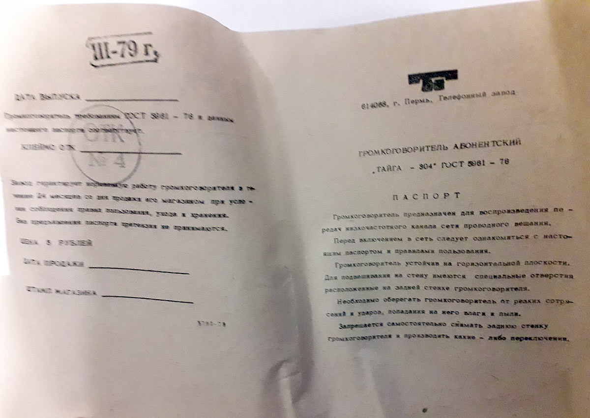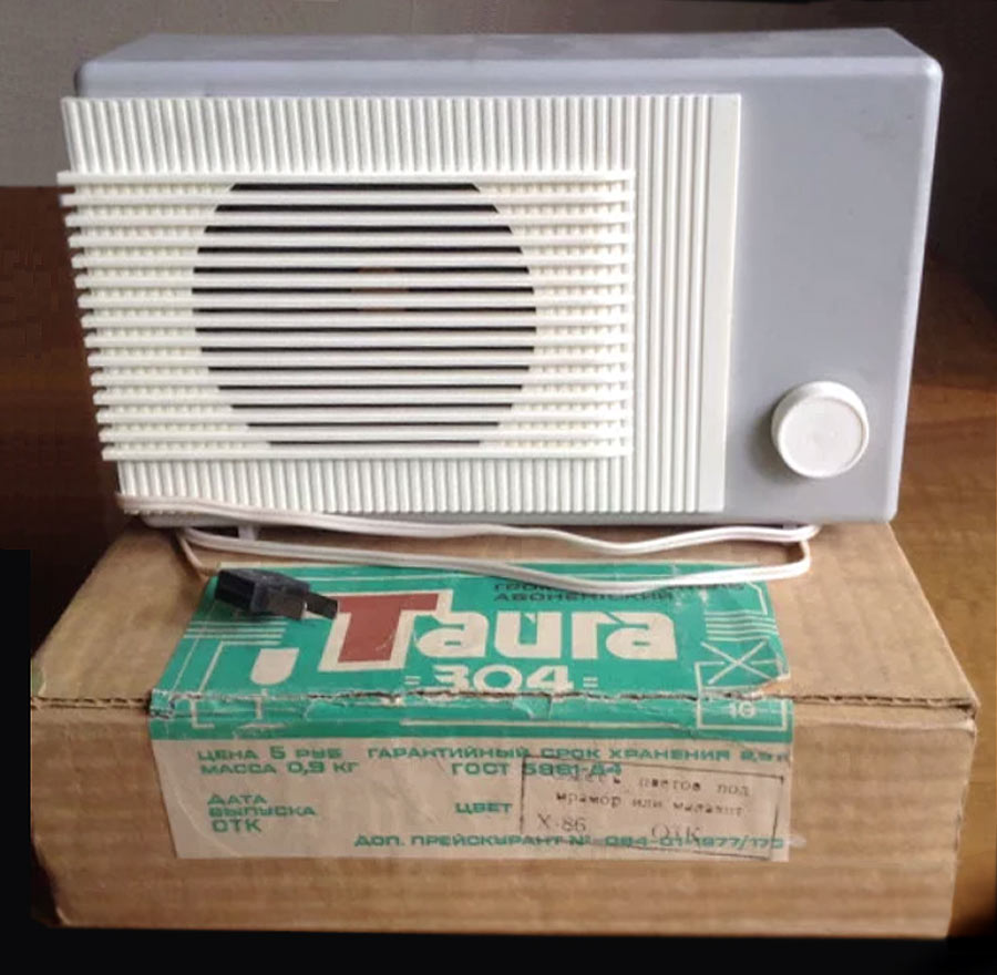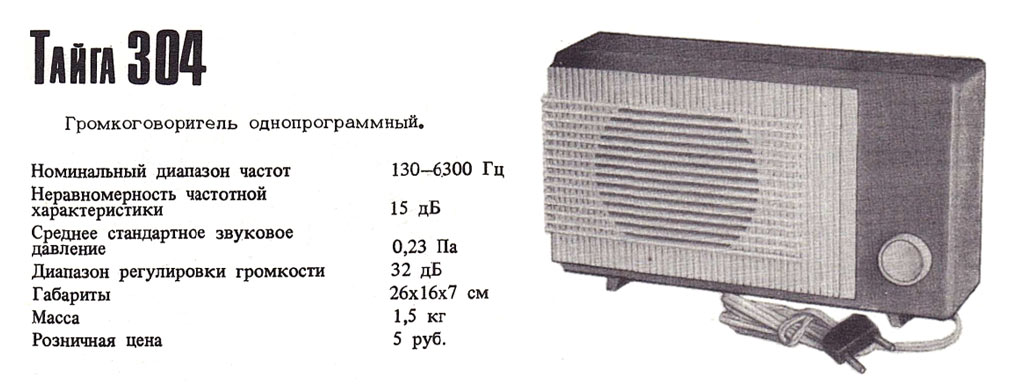 Абонентский громкоговоритель "Тайга-304" возможно с 1976 года выпускал Пермский телефонный завод. АГ предназначен для работы от радиотрансляционной сети с напряжением в 30 вольт. АГ выполнен в бакелитовом (чёрного цвета) или пластмассовом (разных цветов) корпусе с пластмассовой накладкой. Диапазон воспроизводимых звуковых частот 160...10000 Гц. Габариты АГ - 260х160х70 мм, масса 1,5 кг. Цена 5 рублей. Выпускался до начала 90-х годов.