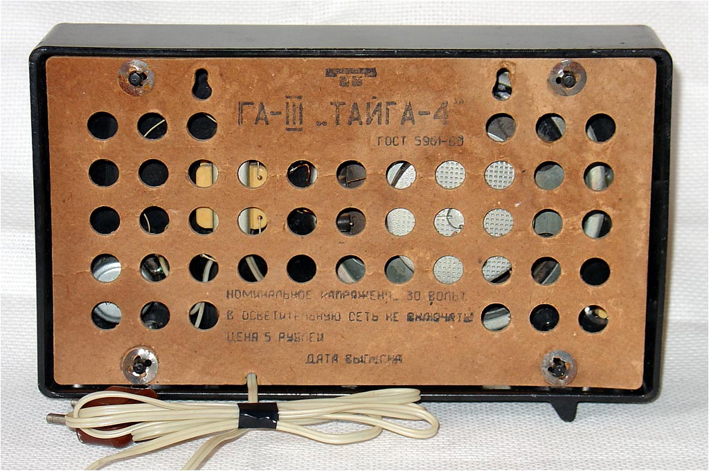 Абонентский громкоговоритель "Тайга-4" с начала 1972 года выпускал Пермский телефонный завод. Громкоговоритель рассчитан на работу в радиотрансляционной линии с напряжением 30 вольт. Подводимая мощность 150 мВт. Габариты громкоговорителя - 200х166х70 мм. Масса - 1 кг.