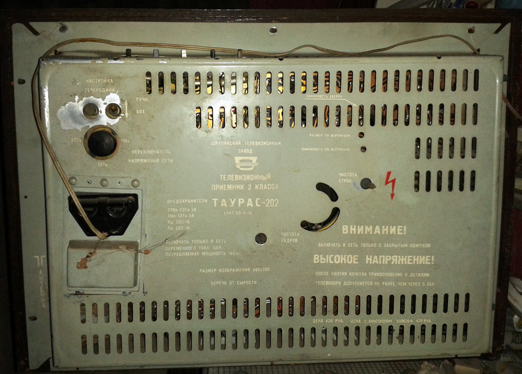 Телевизор *Таурас-202* с 1970 года выпускал Шауляйский телевизионный завод. **Таурас-202** унифицированный телевизионный приёмник 2-го класса (УЛТ-59-II-1) выпускался в настольном и напольном (на ножках) оформлении с вариантами отделки корпуса и передней панели. В телевизоре применен кинескоп 59ЛК2Б или 59ЛК2Б-С, с размером экрана по диагонали 59 см и углом отклонения электронного луча 110 градусов. Телевизор обеспечивает: приём телевизионных передач в любом из 12 каналов, подключение магнитофона для записи звукового сопровождения или его прослушивания на головные телефоны при отключенных динамиках, возможность регулировки громкости и яркости на расстоянии (до 5 м) при помощи проводного пульта ДУ, подключение приставки двух-языкового сопровождения. Пульт ДУ и приставка не в комплекте. АПЧГ обеспечивает переключение каналов без регулировок. АРУ обеспечивает устойчивый приём. Влияние помех сведено к минимуму с АПЧ и Ф. Размер изображения 380х485 мм. Чувствительность 50 мкВ. Разрешающая способность - 450...500 линий. Выходная мощность канала звука 1,5 Вт. Телевизор питается от сети 127 или 220 в. Потребляемая мощность - 180 Вт. В телевизоре использовано 17 радиоламп, 20 полупроводниковых приборов, два громкоговорителя. Габариты телевизора - 703 х 510 х 430 мм. Его масса без ножек 36 кг.