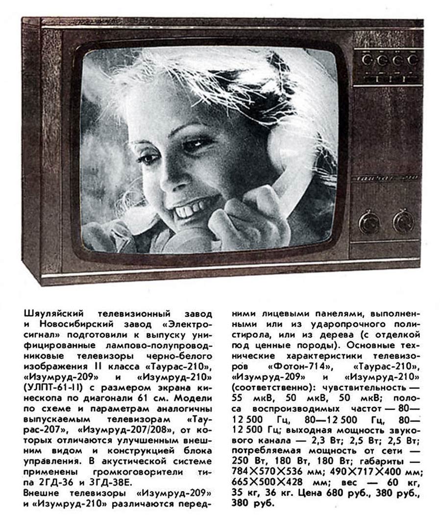Телевизор ч/б изображения *Таурас-210* с 1978 года выпускал Шауляйский телевизионный завод. Унифицированный лампово-полупроводниковый телевизор второго класса *Таурас-210/Д* (УЛПТ-61-II-28) обеспечивает приём на любом из 12 каналов МВ диапазона, а при установке блока СКД-1 и на любом канале ДМВ диапазона. В телевизорах с индексом *Д* блок *СКД-1* уже установлен. Имеется возможность прослушивания звукового сопровождения на головные телефоны при отключенных громкоговорителях. В телевизоре конструктивно заложена возможность дистанционного управления яркостью, громкостью и отключением громкоговорителей. Кинескоп 61ЛКЗБ с размером экрана по диагонали в 61 см. Канал звукового сопровождения работает на два громкоговорителя, боковой 3ГД-38С и фронтальный 2ГД-36. Чувствительность телевизора - 50 мкВ. Чёткость по вертикали 500, по горизонтали 450 линий. Максимальная выходная мощность - 2,5 Вт. Диапазон воспроизводимых звуковых частот - 100...10000 Гц. Потребляемая мощность 180 Вт. Габариты телевизора - 685х525х420 мм. Его масса - 36 кг. Розничная цена телевизора с ножками 296 рублей.