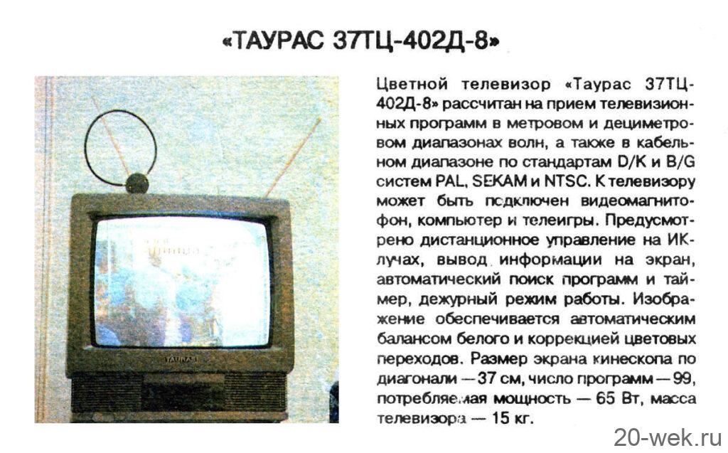 Цветной телевизор *Таурас 37ТЦ-402Д-8* подготовил к выпуску с 1994 года Шауляйский телевизионный завод.