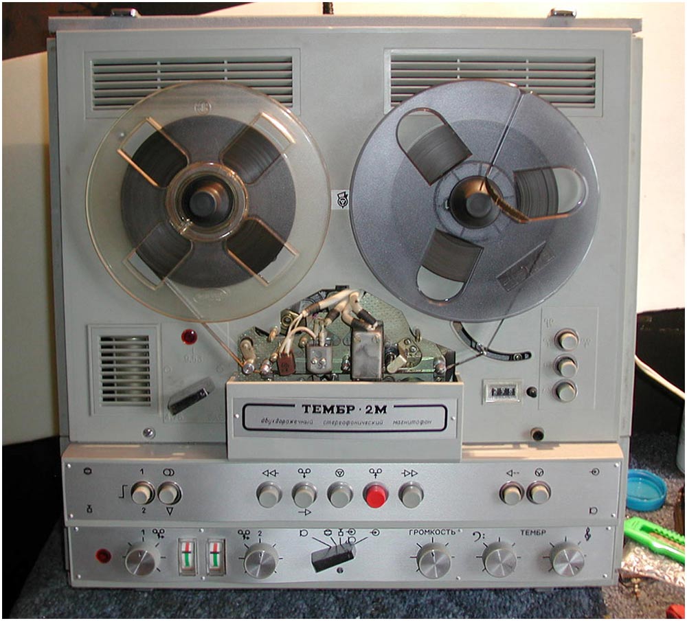 Стереофонический магнитофон *Тембр-2М* выпускал с 1977 года Горьковский завод имени Петровского. Трёхскоростной транзисторный магнитофон предназчен для записи и воспроизведения фонограмм. В комплект входит усилитель *П-70* (он есть тут на сайте) с двумя акустическими системами. Магнитофон имеет контрольные громкоговорители. Краткие характеристики: Скорость протяжки ленты: 4,76, 9,53 и 19,05 см/сек. Номинальная выходная мощность на собственную АС - 2 Вт. Рабочий диапазон частот соответственно скорости: 63...6300, 63...12500 и 40...16000 Гц. Габариты магнитофона - 485х445х225 мм. Масса - 25 кг. Цена комплекта 665 рублей.