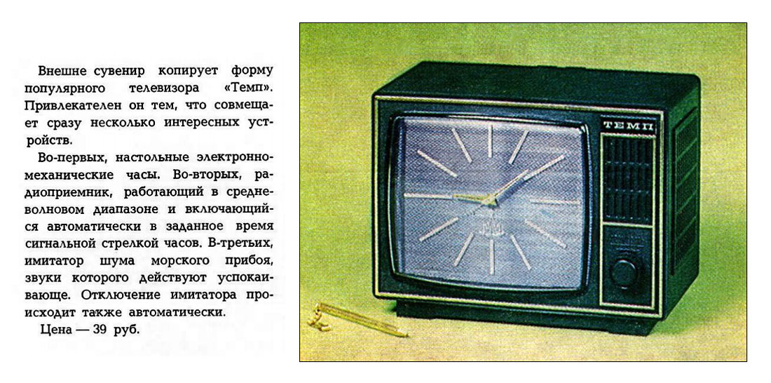 Сувенирный радиоприёмник *Темп* выпускался с 1983 года Московским ПО *Темп*. Сувенир выпускался в 2-х вариантах исполнения, в первом с радиоприёмником, генератором шума и механическими часами, во втором - с радиоприёмником и цветомузыкальной установкой из 4-х цветов.