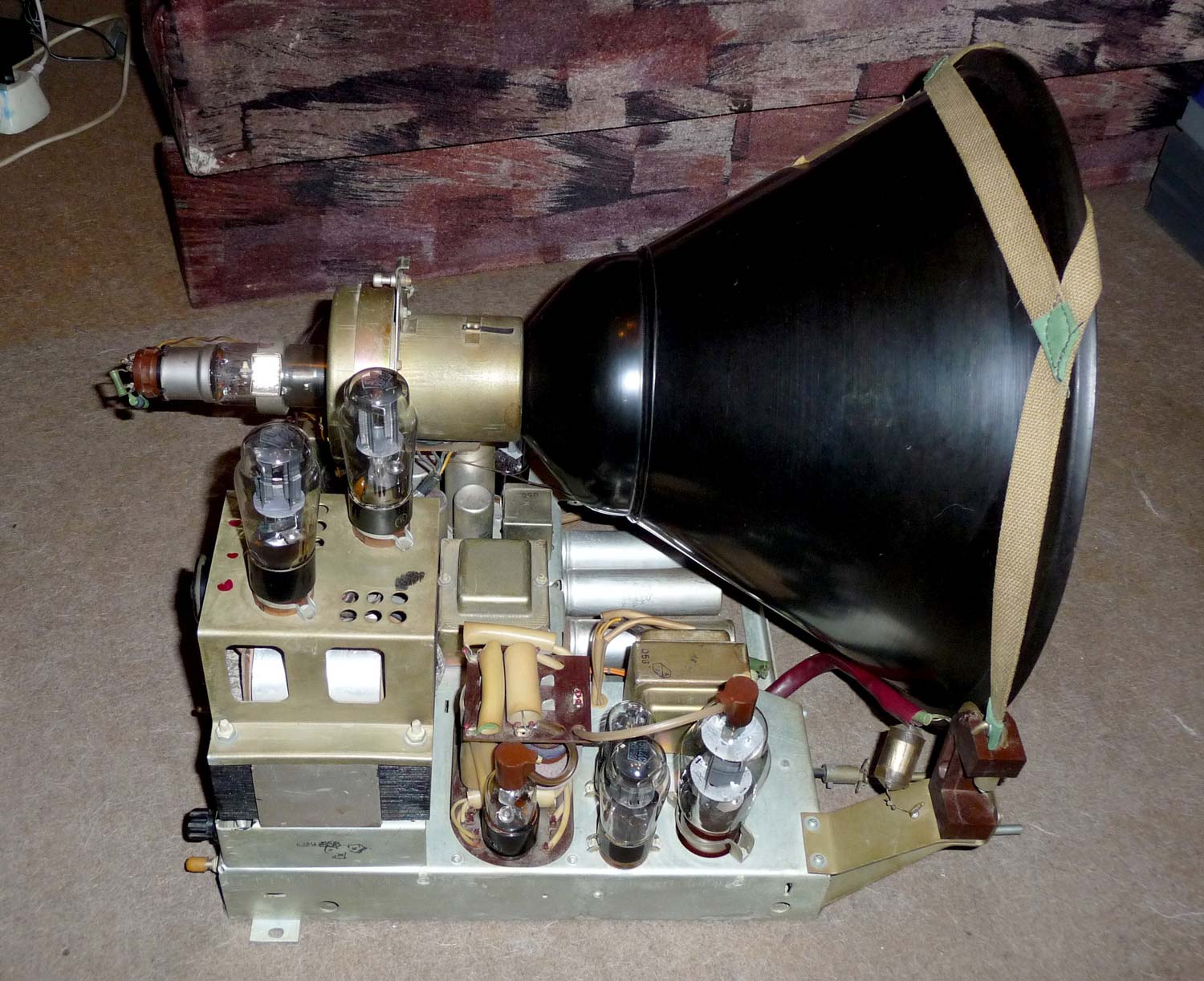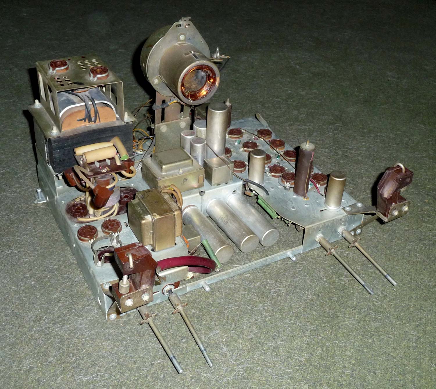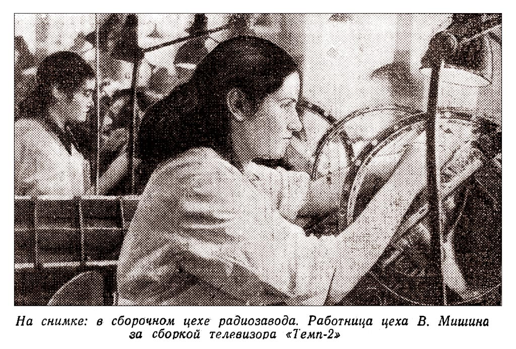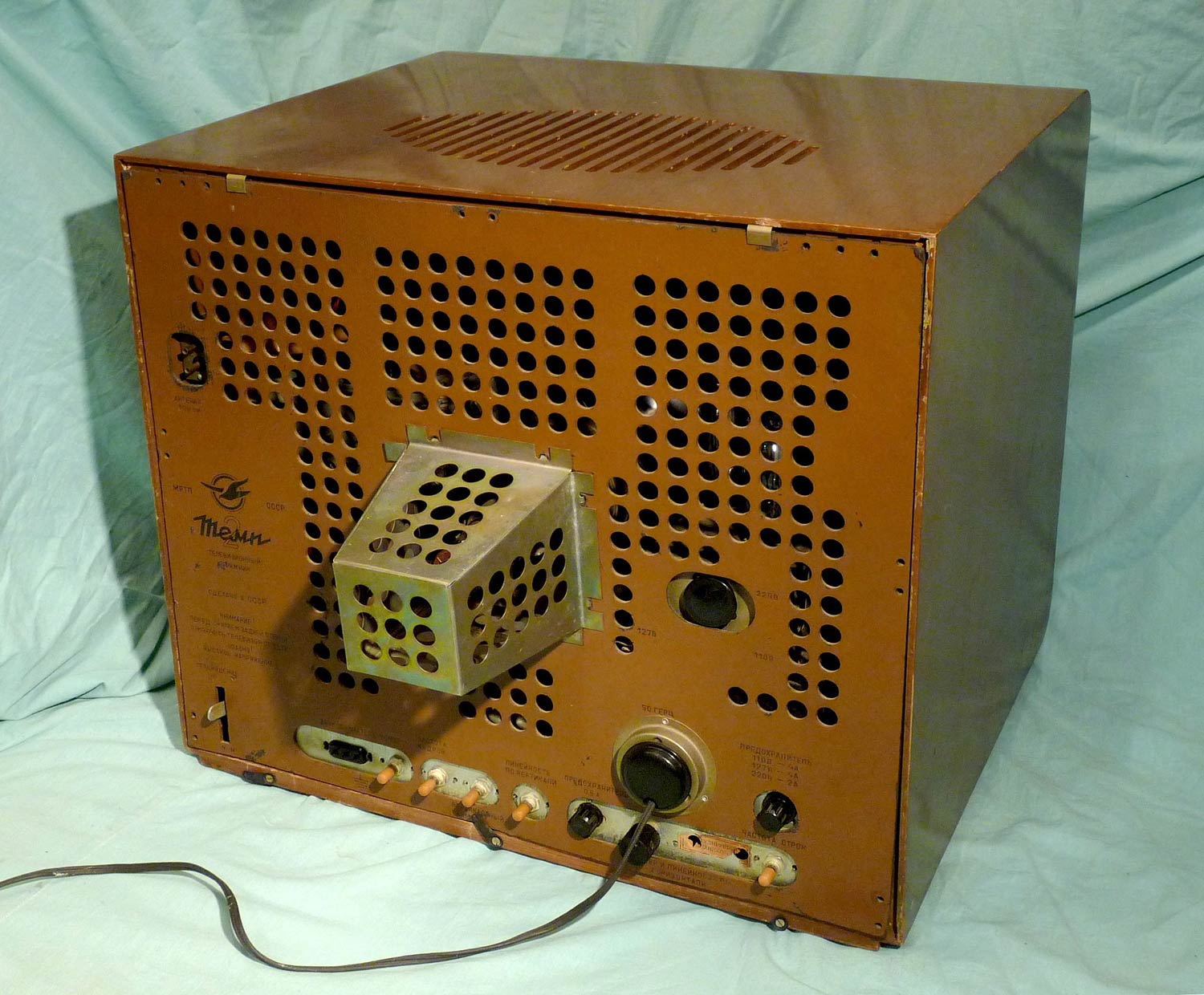 Телевизор ч/б изображения *Темп-2* с октября 1955 по декабрь 1956 года включительно выпускал Московский радиозавод. Телевизор второго класса **Темп-2** имеет ряд конструктивных и схемных особенностей по сравнению с телевизором **Темп**, но конструкция, оформление и все параметры остались прежними. Аппарат работает в любом из 5 каналов, принимает ЧМ радиостанции в трёх поддиапазонах, воспроизводит граммофонную и магнитную запись. Питание от сети 110, 127, 220 В. Собран он в деревянном полированном футляре размером 525х575х475 мм, имитированном под ценные породы дерева. Вес аппарата 44 кг. На передней панели под защитным стеклом расположен экран трубки 40ЛК1Б. Под экраном размещены четыре основные ручки управления. Справа футляра выведена сдвоенная ручка: наружная - настройки приёмника **подстройка** и внутренняя **переключатель поддиапазонов** служащие для настройки гетеродина и переключения каналов. Восемь вспомогательных ручек выведены на заднюю стенку. Две ручки регулировки линейности изображения и размера по горизонтали выведены на шасси под шлиц. Устанавливают эти регуляторы на заводе и заклеивают бумагой. При эксплуатации ими обычно не пользуются. Задняя часть аппарата закрыта съёмной стенкой с прорезями для доступа к гнёздам, переключателям и ручкам управления. На задней стенке укреплена колодка с шнуром сети, при её снятии - автоматически отключается питание. Для воспроизведения звука на отражательной доске с левой стороны футляра установлены два громкоговорителя. Телевизор рассчитан на соединение с антенной 300-омным симметричным кабелем КАТВ-300. Ввод антенны включается при помощи специальной антенной колодки СДН идущей в комплекте с ТВ. При наличии антенны с вводом из несимметричного 75-омного коаксиального кабеля PK-1 используется устройство СДН и гнездо с штеккером. Для приёма ЧМ используется ТВ антенна. Телевизор собран на 22 лампах. Чувствительность 250 мкВ. Потребляемая мощность 240 Вт, приёме радио 150 Вт. Радио №4/1965, ст.30
