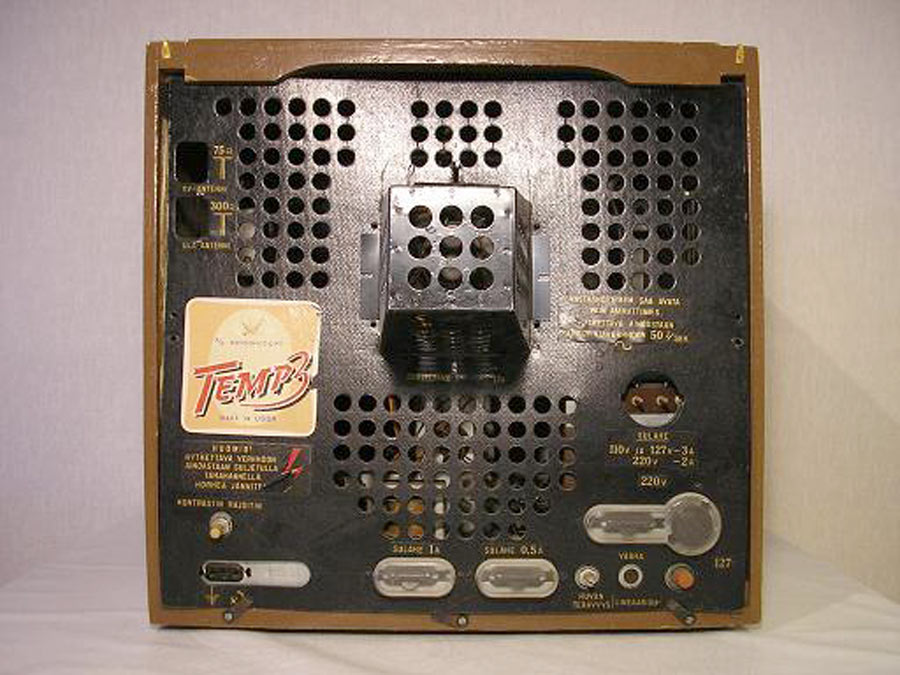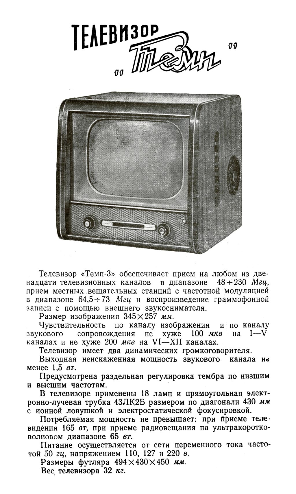 Телевизионный приёмник чёрно-белого изображения *Темп-3* с 1957 по 1960 год выпускал Московский радиозавод. Телевизор второго класса **Темп-3** является дальнейшей модернизацией моделей **Темп**. В телевизор внесены существенные изменения которые улучшили качество изображения и звука, удобство в эксплуатации. Телевизор работает в любом из 12-ти каналов. Кроме того, телевизор рассчитан на приём ЧМ станций в диапазоне 64,5...73 Мгц и для воспроизведения грамзаписи и записи звука на магнитофон. В телевизоре применено 18 ламп, прямоугольный кинескоп 43ЛК2Б, 13 диодов, что позволило сделать его экономичным. Питание от сети переменного тока, потребляемая мощность 165 при приёме ТВ и 65 Вт радио. При приёме слабых сигналов имеется возможность перехода на инерционную схему синхронизации делающую изображение более устойчивым и менее зависящим от помех. Для приёма на ЧМ в телевизоре имеется специальная внутренняя антенна. При включении ЧМ диапазона работают лишь 5 ламп. Чувствительность - 200 мкВ. Номинальная выходная мощность 2 Вт. ТВ смонтирован в деревянном полированном футляре размером 495х480х450 мм. Вес ТВ 32 кг. Экран закрыт съёмным небьющимся стеклом. Под экраном находятся сдвоенные ручки для управления, слева выключатель, яркость и контрастность, справа громкость и настройка ЧМ. Между ними - шкала. У телевизора было несколько оформлений. За всё время выпуска телевизор претерпел три модернизации схемы. Экспортный вариант телевизора *Темп-3* по оформлению схож с телевизором *Темп-4* выпускавшийся позднее. Опыт ремонта Радио№7/1964, ст. 28