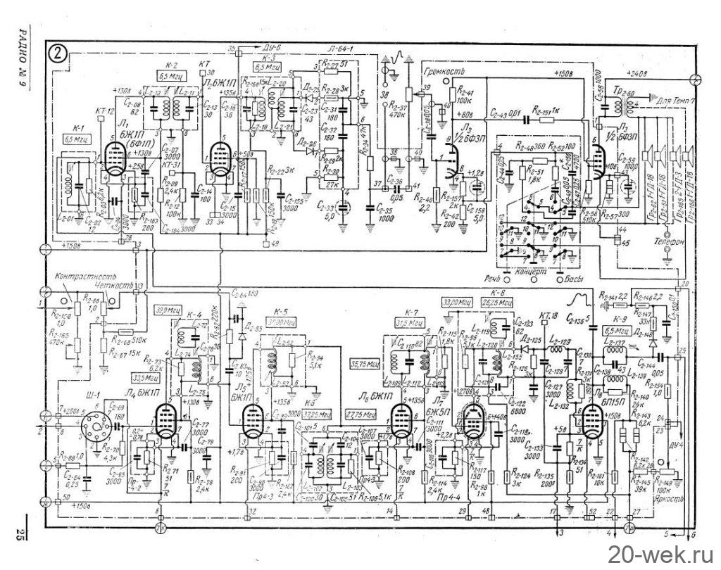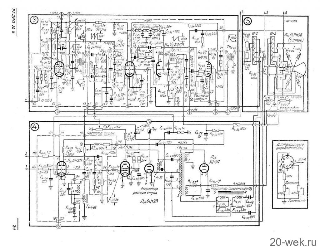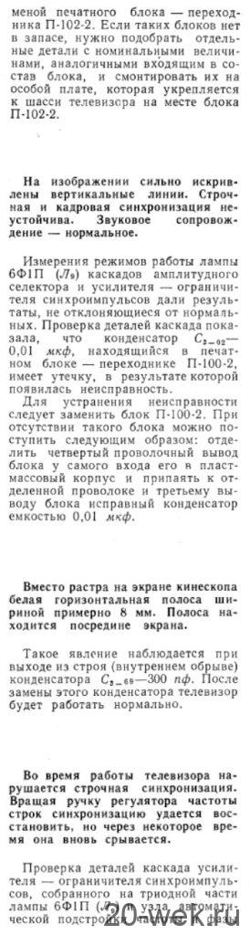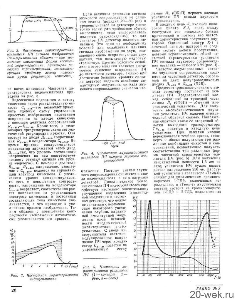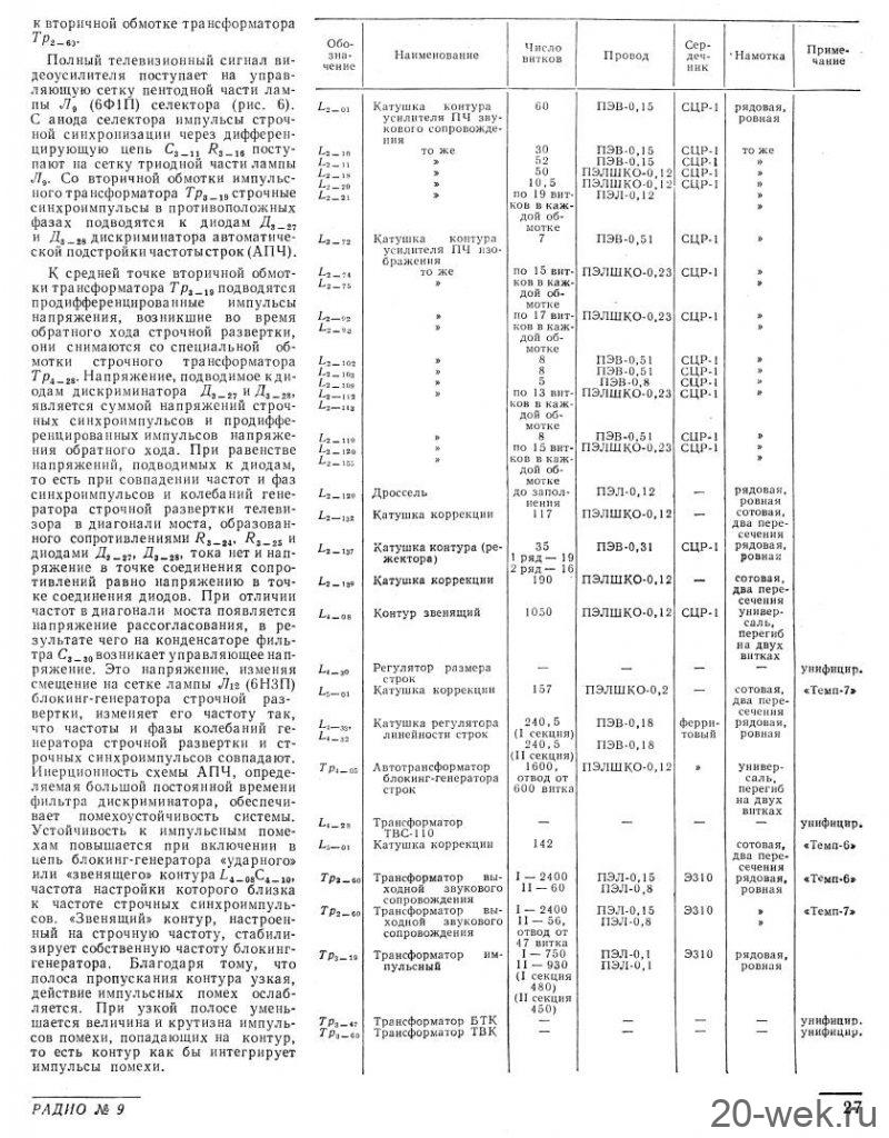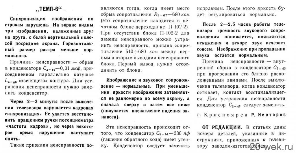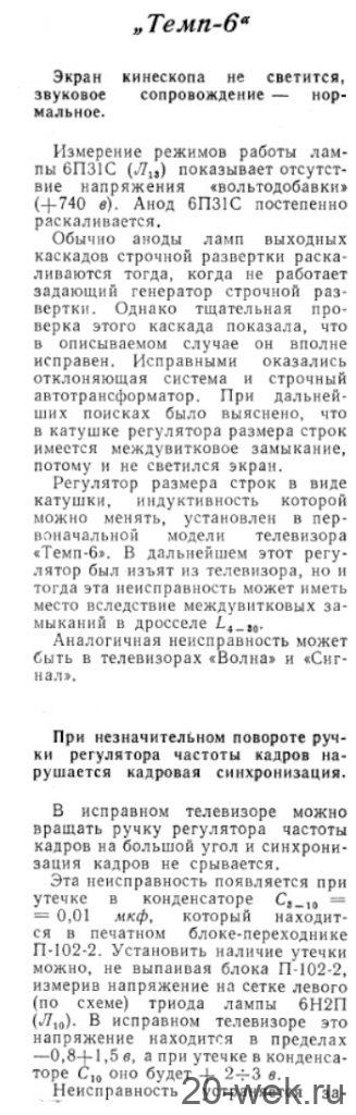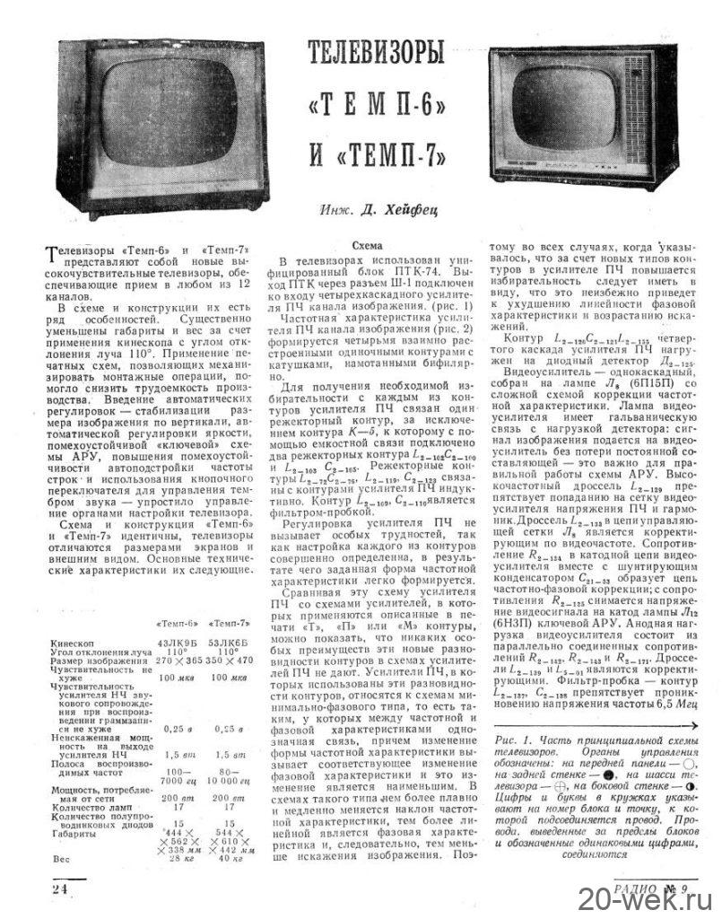 Телевизионные приёмники ч/б изображения *Темп-6* (С) и *Темп-7* (С) с 1960 года выпускал Московский радиозавод. Эти телевизоры воплотили в себе все последние достижения отечественной и зарубежной телевизионной техники начала шестидесятых. Они ни в чём не уступали лучшим зарубежным образцам, а по многим параметрам и превосходили их. Телевизоры созданы конструкторским бюро Московского радиозавода под руководством Д.С.Хейфеца. Модели представляют собой 17 ламповые 12 канальные телевизоры. Отличие в кинескопах и оформлении. В телевизоре **Темп-6** установлен кинескоп 43ЛК9Б с размером изображения 270х365 мм. В телевизоре **Темп-7** кинескоп 53ЛК6Б, с размером изображения 350х470 мм. Телевизоры имеют общую схему, конструкцию и характеристики. В телевизоре **Темп-7** за счёт большего футляра и улучшенной АС, где один громкоговоритель расположен в нижней части футляра, а другой сбоку, диапазон частот 80...8000 Гц, у телевизора **Темп-6** он 100...7000 Гц. В его АС также работают два громкоговорителя, но они находятся спереди. Номинальная выходная мощность 1 Вт. Чувствительность 100 мкВ. Такая чувствительность в сочетании с АПЧ и Ф и АРУ позволяет получить уверенный приём программ на наружную антенну в радиусе до 70 км. Потребляемая мощность 200 Вт. Имеется возможность подключения головных телефонов и звукоснимателя. Предусмотрен ППДУ для управления яркостью изображения и громкостью звука (в комплект не входит). Футляры деревянные, фанерованы ценными породами дерева. Габариты модели **Темп-6** - 444х562х338 мм. Вес 28 кг. Цена 336 рублей. Габариты телевизора **Темп-7** - 544х610х442 мм. Вес 43 кг. Цена 480 рублей. Телевизоры экспортировались в страны Европы (индекс Е) и Америки (индекс А). За годы производства (1960...1964) телевизоров **Темп-6** было изготовлено 320.000 экземпляров, **Темп-7** 13.500 экземпляров. С 1962 года Шауляйский телевизионный завод так же выпускал телевизор **Темп-6**. В конце 1964 года телевизор **Темп-7** модернизирован в модель **Темп-7Б**, но сведений об этом не нашлось. Описание и схема Радио №9/1961 ст. 24 Опыт ремонта Радио №7/1964, ст.29 Опыт ремонта Радио №12/1964, ст.29 Радио №11/1965, ст.33 Радио №1/1966, ст.28