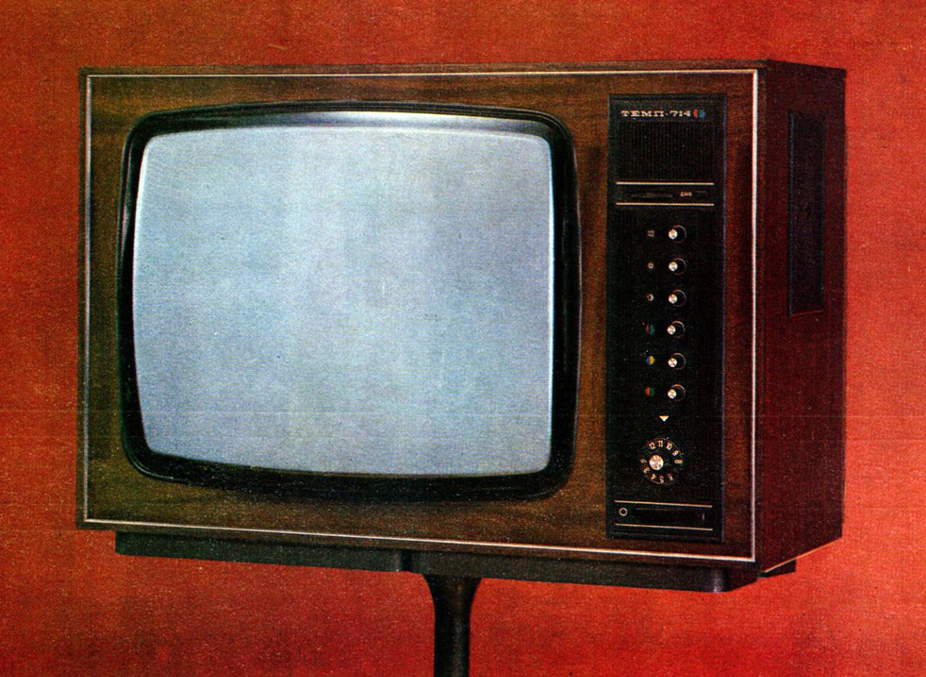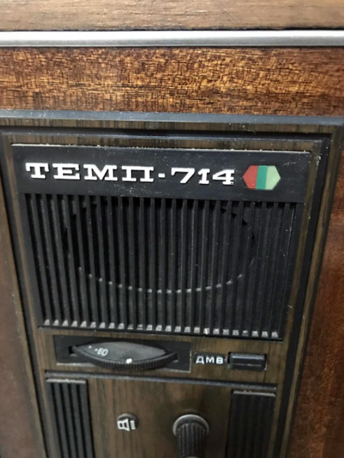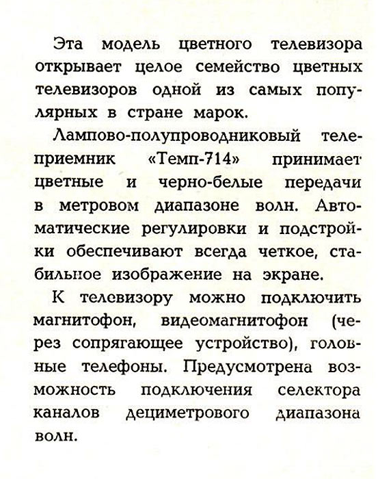 Телевизионный приёмник цветного изображения *Темп-714* (тип УЛПЦТ-61-II-11) с 1977 года выпускал Московский радиозавод. **Темп-714** - это унифицированный лампово-полупроводниковый цветной телевизор 2-го класса на кинескопе 61ЛК3Ц. Он обеспечивает приём телевизионных передач ч/б и цветного изображения в зоне уверенного приёма телевизионного центра или ретрансляционной станции на любом из 12 каналов МВ. При установке селектора каналов СК-Д-1 и на любом из каналов ДМВ диапазона. В телевизоре предусмотрены: возможность подключения магнитофона на запись звукового сопровождения передач; прослушивание звукового сопровождения головными телефонами с отключенными громкоговорителями в АС ТВ. Телевизор обладают высокой чувствительностью и эффективно действующей схемой АРУ. Повышению качества принимаемого изображения способствует наличие АПЧГ, исключая необходимость подстройки при переключении каналов. Размер изображения 362x482 мм. Чувствительность 50 мВ. Разрешающая способность совмещённого чёрно-белого изображения 450 линий. Номинальная выходная мощность канала звука 2,3 Вт. Диапазон воспроизводимых частот 80...12500 Гц. Звук воспроизводится громкоговорителями 2ГД-36 и ЗГД-38Е. Потребляемая от сети мощность 250 Вт. В телевизоре используются 7 радиоламп, 47 транзисторов и 70 полупроводниковых диодов. Габариты телевизора 550x773x540 мм. Масса 60 кг. С 1978 года завод выпускал телевизор *Темп-718* практически не отличающийся от описанного выше.