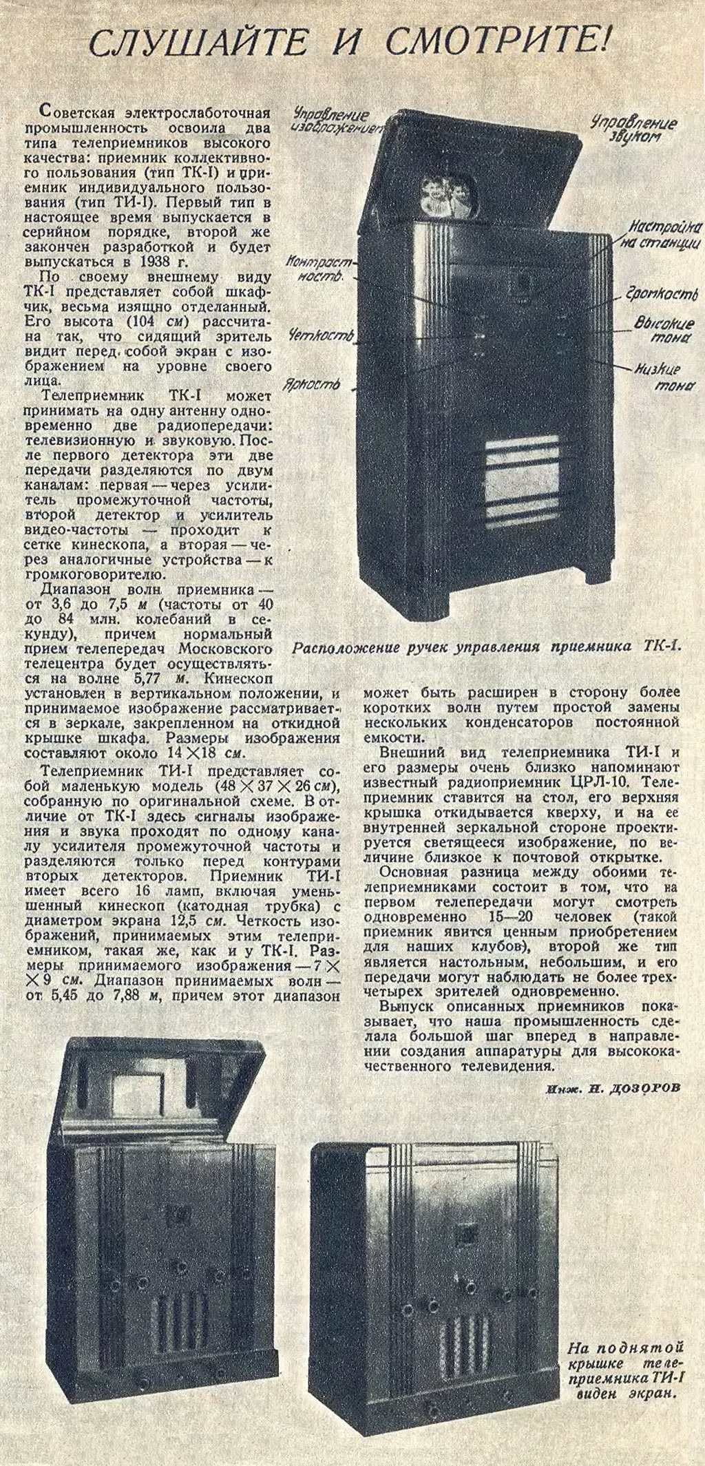 Телевизор *ТИ-1* разработан в конце 1937 года инж. А.А.Расплетиными в НИИС и собран в количестве нескольких экземпляров центральным НИИ связи в Москве. Телевизор Индивидуальный *ТИ-1* по габаритам сравним с радиоприёмником *СИ-235*. Как выяснилось в процессе экспериментов телевизор оказался неприспособленным для массового производства из-за нестабильности строчной и кадровой развёрток, плохой чувствительности и др. В 1938 году схема телевизора была доработана, устранены недостатки и под наименованием *ТИ-2* было выпущено так же только несколько образцов. В течении 1939 года был разработан наиболее совершенный телевизор *ТИ-3*, который мог принимать программы телевидения с числом строк изображения от 240 до 441 на кинескопе диаметром 17 сантиметров. Телевизор мог принимать и программы радиовещания в диапазоне от 15 до 2000 метров. После выпуска опытных экземпляров и испытаний телевизор *ТИ-3* был намечен для серийного производства и начал с 1940 года выпускаться на Ленинградском заводе *Радист* и частично на заводе Козицкого под наименованием *17ТН-1*. Внизу описание телевизора в журналах *Техника Молодёжи № 3 за 1938 год и *Техника Молодёжи № 7-8 за 1939 год.
