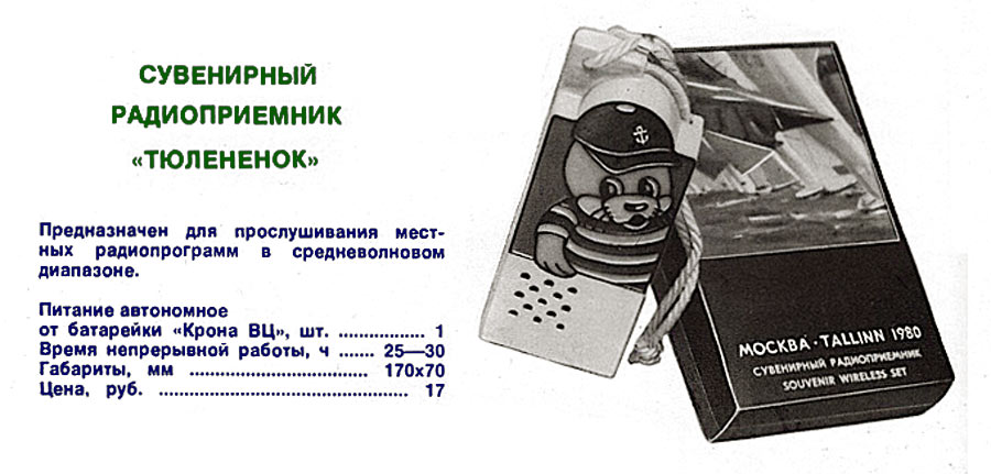 Сувенирный радиоприёмник *Тюленёнок* выпускал с 1980 года *Таллинский Электротехнический завод имени Ханса Пегельмана*. Выпуск приурочен к Олимпийским играм 1980 года в Москве. Приёмник предназначен для прослушивания радиовещательных станций в диапазоне СВ. Чувствительность приёмника 10 мВ/м. Селективность 12 дБ. Диапазон воспроизводимых звуковых частот 450...2700 Гц. Номинальная выходная мощность 60 мВт. Питание от батареи Крона ВЦ. Время непрерывной работы от новой батареи не менее 25 часов. Габариты модели 170х70х22 мм. Масса - 270 гр. Цена 17 рублей.