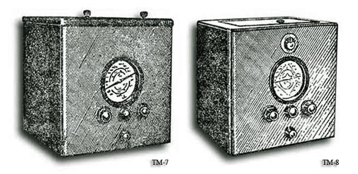 Радиоприёмники *ТМ-7* и *ТМ-8* выпускались с 1938 года Александровским радиозаводом № 3. Радиоприёмники **ТМ-7** и **ТМ-8** предназначены для использозания на вещательных радиотрансляционных узлах. В небольшом количестве они были реализованы и в розничной торговле. Как к приёмникам трансляционных узлов, к ним предъявлялись следующие требования: при хорошей чувствительности и избирательности иметь на выходе мощность, достаточную для передачи по воздушной или кабельной линии и возбуждения предварительного усилителя узла. Для этого достаточна выходная мощность порядка 200...250 милливатт. Так как приёмники предназначены для приёма радиовещательных станций в любых пунктах Союза ССР, то они должны быть всеволновыми. Ко времени выпуска этих приёмников, наиболее подходящим по своим показателям был приёмник **СВД-М**. На его базе и стали выпускаться эти приёмники. Этим объясняется то, что оба приёмника как по схеме, так и по конструкции почти идентичны с приёмником **СВД-М** и обладают примерно теми же параметрами. Основное отличие заключается в том, что в них отсутствует последняя ступень усиления мощности. Между собой они различаются тем, что **ТМ-8** предназначен для питания от сети переменного тока, а **ТМ-7** от аккумуляторных батарей, поэтому в нём отсутствует блок выпрямителя. Кроме того, для экономии аккумуляторов в схеме модели **ТМ-7** отсутствует оптический индикатор настройки лампа 6Е5, который имеется в схеме приёмника **ТМ-8**. Приёмники оформлены в железных ящиках, окрашенных снаружи в чёрный цвет, а изнутри алюминиевой краской. Шасси, аналогичны шасси приёмниа **СВД-М** и укреплены в футлярах на резиновых амортизаторах. Верхняя крышка футляра открывается и предоставляет доступ к верхней части шасси. Задняя стенка футляра перфорирована (для вентиляции). На переднюю сторону выведены ручки управления: это переключатель диапазонов, ручка настройки, регулятора громкости и тембра по ВЧ. В приёмнике **ТМ-8** последняя ручка является также выключателем питания. На заднюю сторону выведены гнёзда антенны, земли, звукоснимателя, а также выходные гнёзда приёмника. Выходная мощность обоих приёмников на сопротивление 600 ом и при клирфакторе 5% равна 200 мВт. ПЧ равна 445 кгц. Диапазон принимаемых радиочастот и волн: А - 150...400 кГц (2000...750 м). Б - 540...1500 кГц (556...200 м). Г - 3500...9000 кГц (85,7...33,3 м). Д - 8,2...18 мГц (36,6...16,7 м). Чувствительность по высокой частоте при 30% модуляции и выходной мощности 0,02 ватта, на всех диапазонах около 50 мкв. Чувствительность по НЧ (напряжение на гнёздах звукоснимателя) при номинальной выходной мощности 200 мв. Ослабление сигнала при расстройке приёмника на 10 кгц: на диапазонах А, Б в 10 раз, Г, Д в 5 раз. Ослабление зеркальной помехи на диапазонах А, Б в 1000 раз, Г, Д в 55 раз. Частотная характеристика по низкой частоте от входа звукоснимателя, до выхода радиоприёмника прямолинейна в пределах от 60 до 6000 гц. Приёмник **ТМ-8** потребляет 75 вт. Приёмник **ТМ-7** требует 6,5 в по накалу, при токе 2,65 а, а по аноду 240 в, при токе в 75 ма.