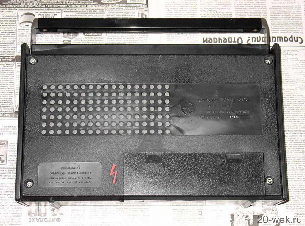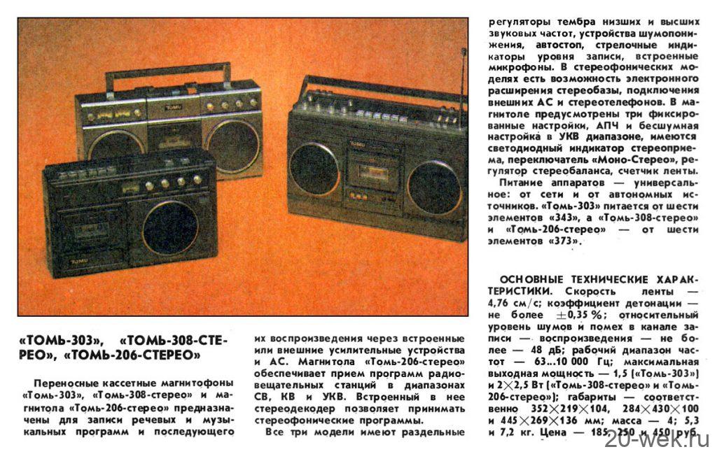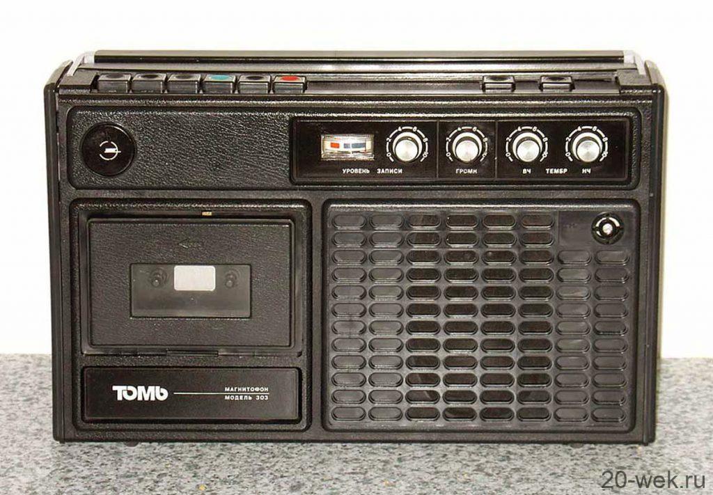 Портативный магнитофон "Томь-303" с 1981 года выпускал Томский радиотехнический завод. Магнитофон предназначен для записи фонограмм с микрофона и внешних источников сигнала и их воспроизведение. Магнитофон позволяет осуществлять запись или воспроизведение и во время движения, обеспечивая основные параметры. Имеется отключаемое устройство СШП при воспроизведении. Питание МГ осуществляется от сети, через встроенный блок питания или от 6 элементов А-343. Коэффициент детонации ±0,35%. Рабочий диапазон частот звука на ЛВ - 63...10000 Гц. Относительный уровень шумов и помех канала З/В -48 дБ. Коэффициент гармоник 4%. Номинальная выходная мощность 0,5, максимальная 1,5 Вт. Потребляемая от сети мощность 10 Вт. Габариты аппарата - 352 х 219 х 104 мм. Масса - 4 кг. С 1987 года завод выпускал магнитофоны ''Томь М-303'' с таким же и другим оформлением передней панели и разнообразной цветовой гаммой футляров