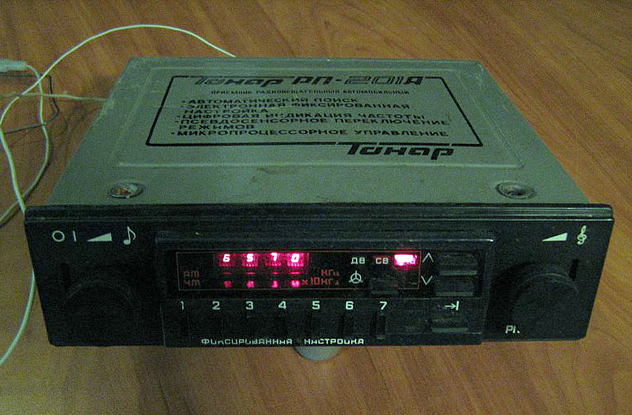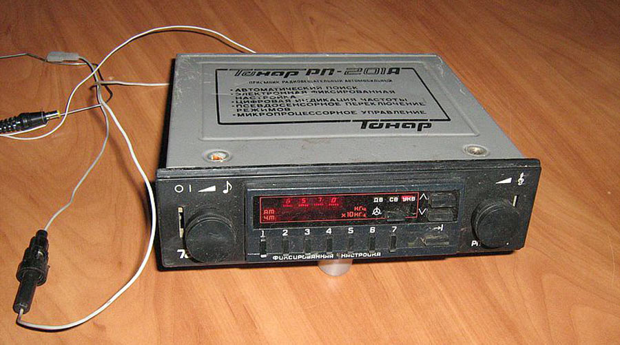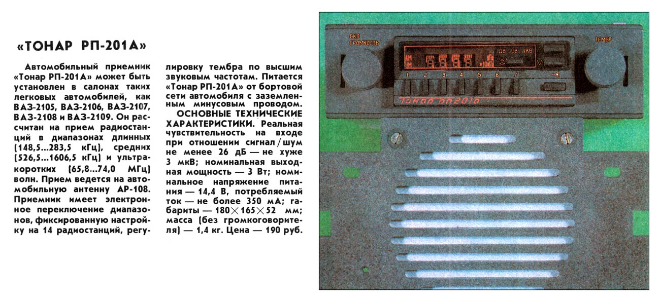 Радиоприёмник автомобильный *Тонар РП-201А* с 1990 года выпускал Молодечненский завод *Спутник*. Устанавливается в автомобили ВАЗ, работает в диапазонах ДВ, СВ и УКВ на автомобильную антенну АР-108. Переключение диапазонов электронное, фиксированная настройку на 14 станций, регулировка тембра ВЧ. Питание от бортовой сети. Чувствительность 3 мкВ. Номинальная выходная мощность 3, максимальная 7 Вт. Потребляемый ток от 50 до 350 мА. Габариты модели 180 х 165 х 52 мм. Масса (без АС) 1,4 кг. Цена 190 рублей.