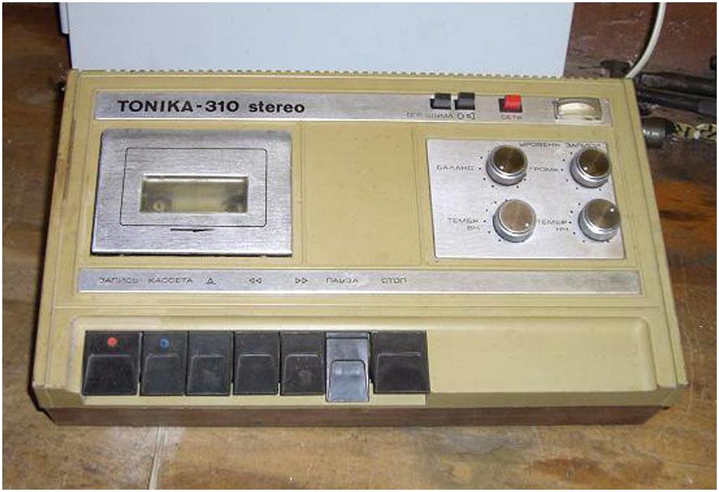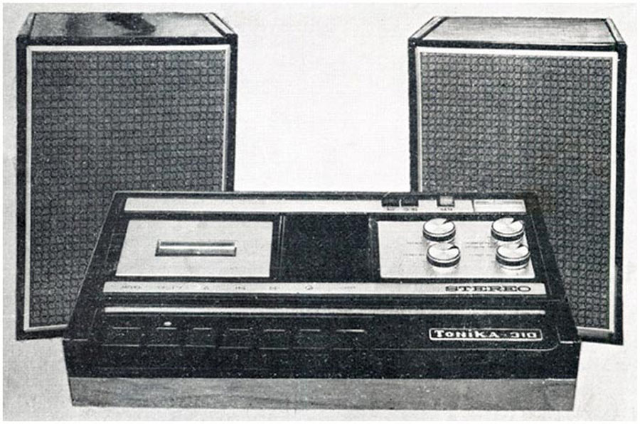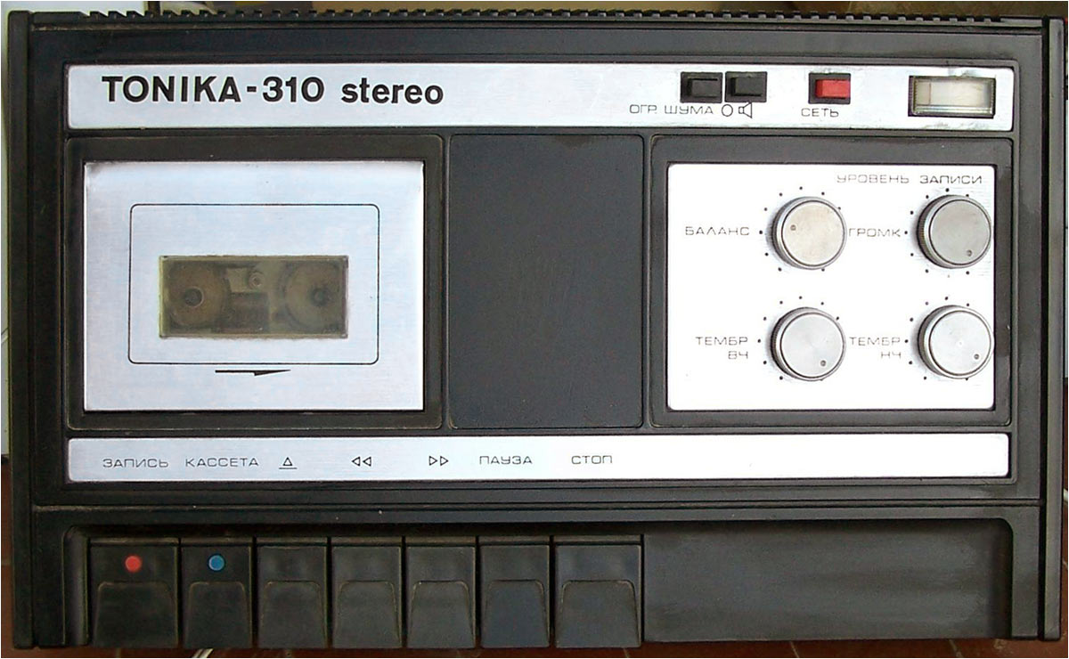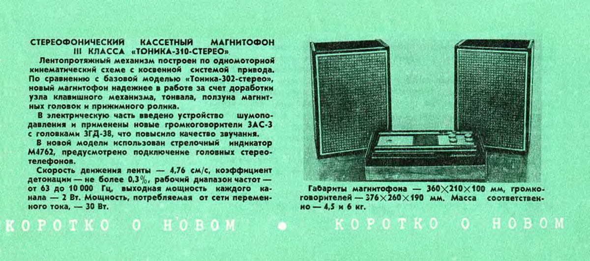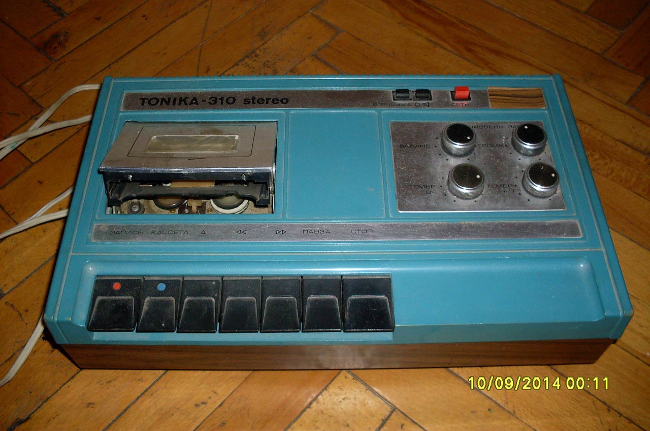 Кассетный стереофонический магнитофон *Тоника-310 стерео* с 1976 года выпускал Вильнюсский ПСЗ *Вильма*. Аппарат предназначен для записи и воспроизведения фонограмм и последующего их воспроизведения. Работает магнитофон с двумя АС, в каждой из которых стоит по одному громкоговорителю 3ГД-38Е. В магнитофоне имеется отключаемая система шумоподавления, стрелочный индикатор уровня записи, он выставляется в левом канале, затем добавляется уровень правого и с его превышением, регулятором правого канала уменьшают уровень до прежнего. Есть регулировка тембра ВЧ и НЧ, гнездо стереотелефонов с отключением АС и без. ЛПМ собран по на двигателе-трансформаторе. Корпус магнитофона полистироловый, декорированный дюралевыми пластинами, ручками из металла с имитацией нижней части футляра под ценные породы дерева. Коэффициент детонации ± 0,3%. Максимальная выходная мощность 2х2,5 Вт. Среднее звуковое давление 2х0,6 Па. Диапазон рабочих частот на ЛВ - 63...10000 Гц. Потребляемая мощность 30 Вт. Габариты магнитофона 360х210х100 мм. Масса с АС 4,5 кг.