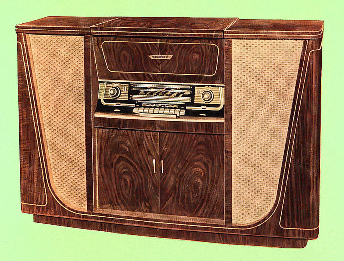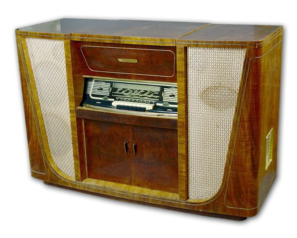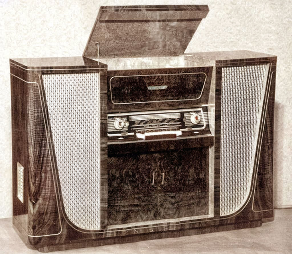 Радиола *Топаз* в 1958 года разработана Рижским Государственным электротехническим заводом ВЭФ. Радиола имеет двухканальный усилитель мощности звука (отдельно для НЧ и ВЧ), который нагружен акустикой, состоящей из семи динамиков, расположенных в трёх направлениях. По фронту расположены два низкочастотных громкоговорителя 5ГД-10, среднечастотный 3ГД-7 и два высокочастотных ВГД-1. По бокам каждого акустического отделения находятся ещё по одному ВГД-1. Радиола высшего класса построена на 15 лампах, приёмник имеет автоподстройку. Клавиши управления расположены в двух рядах, ближе к шкале: клавиши переключения диапазонов, включения/выключения питания, включения проигрывателя. Дальше от шкалы размещены клавиши тон-регистра и клавиши управления автоподстройкой. Радиола состоит из отдельных блоков и оснащена дистанционном управлением. Под шасси радиолы встроен шкаф для хранения грампластинок. В радиоле имеется встроенная магнитная антенна, а также диполь УКВ. Диапазоны частот: ДВ 150...415 кГц, СВ 520...1600 кГц, КВ1 - 11,49...12,14 МГц, КВ2 - 9,36...9,87 МГц, КВ3 - 6,94...7,35 МГц, КВ4 - 5,89...6,3 МГц, УКВ европейский - 87,5...100 МГц. Номинальная выходная мощность НЧ канала 4 Вт, ВЧ канала 3 Вт. Полоса воспроизводимых звуковых частот в диапазонах ДВ, СВ, КВ от 40 до 6500 Гц, в диапазоне УКВ от 40 до 15000 Гц, в режиме воспроизведения грамзаписи 50...10000 Гц. Потребляемая мощность 130 (140) Вт. Масса радиолы 80 кг.