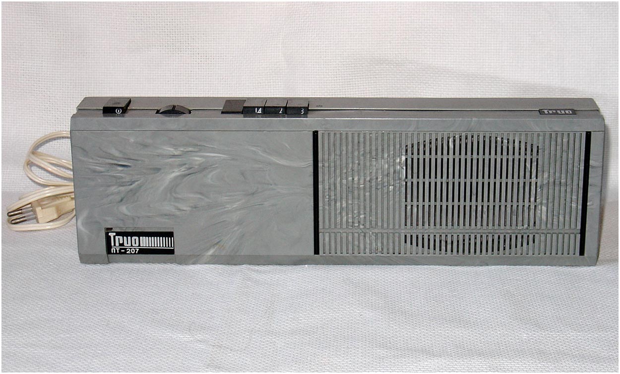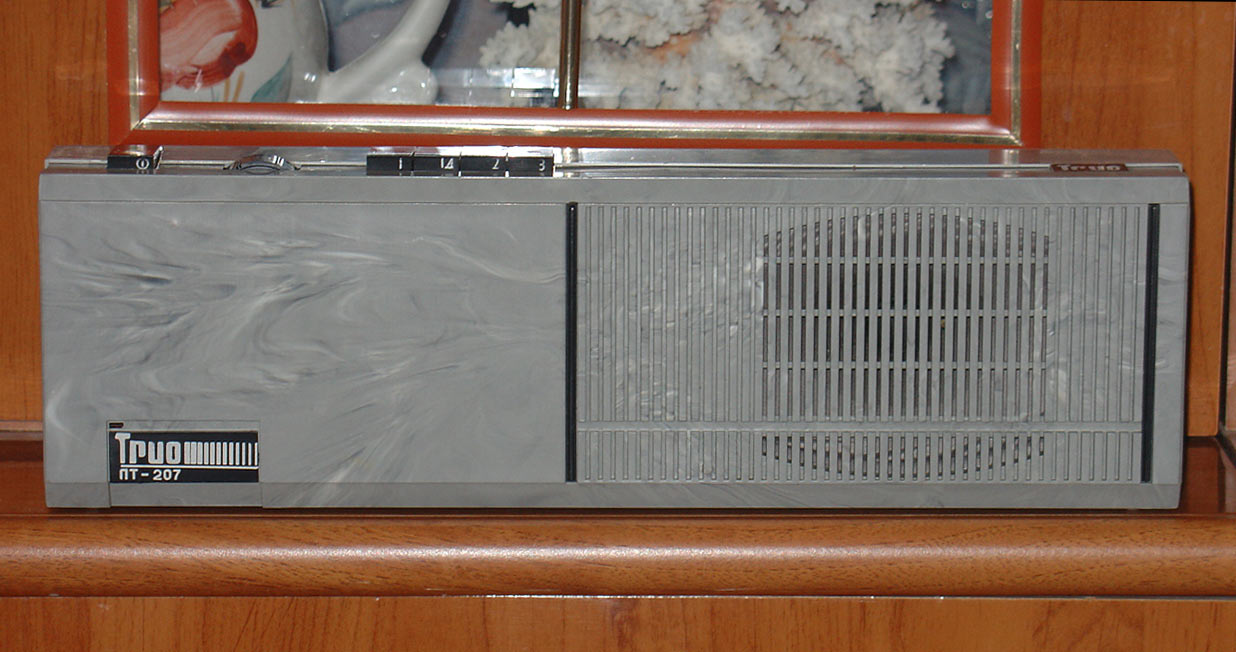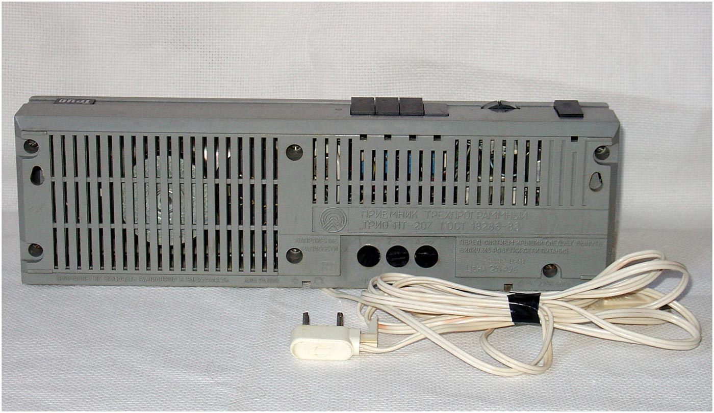 Приёмник трёхпрограммный *Трио ПТ-207* с 1989 года выпускал Владикавказский завод Радуга. ПТ **Трио ПТ-207** предназначен для работы в радиосетях трёхпрограммного сетевого вещания. Напряжении в радиотрансляционной линии 30 (15) В. Диапазон воспроизводимых частот по НЧ каналу по звуковому давлению 100...12500 Гц, по ВЧ каналам 100...7000 Гц. Номинальная выходная мощность 1,2 Вт. Потребляемая мощность 4 Вт. Габариты ПТ - 115х360х65 мм. Масса 1,6 кг. Первоначальная цена 25 рублей. Позже цена на ПТ менялась многократно.