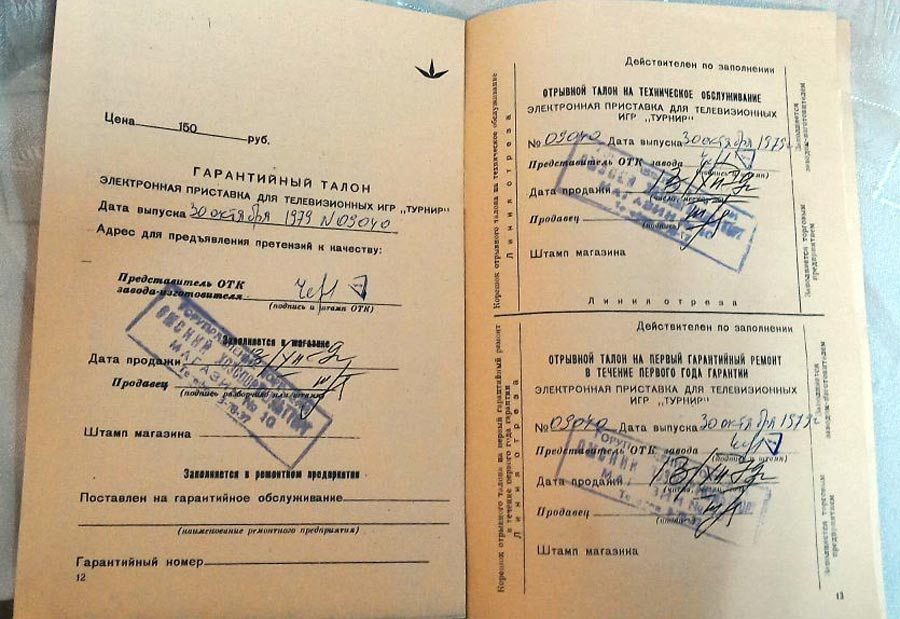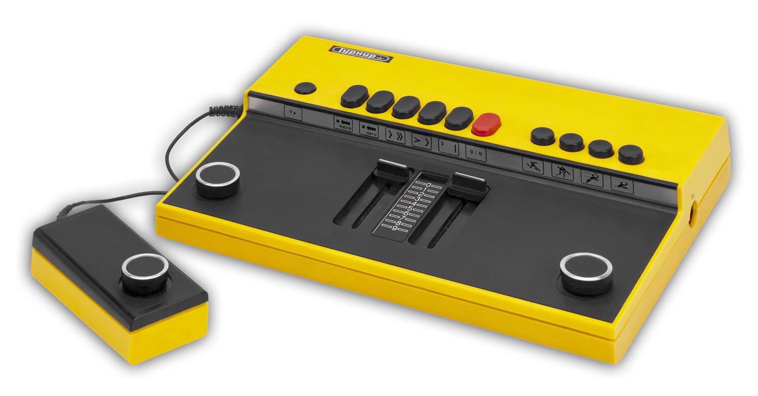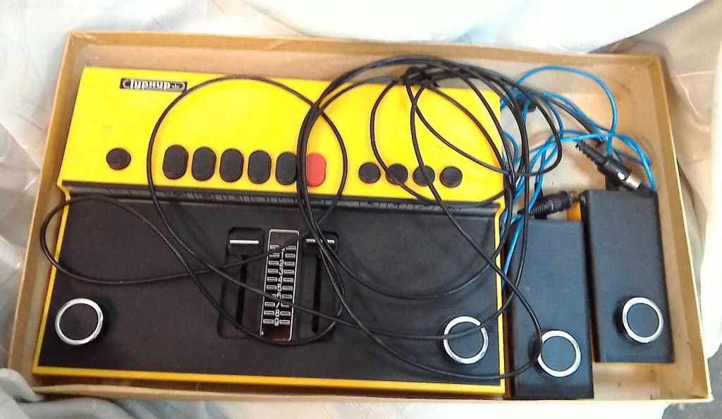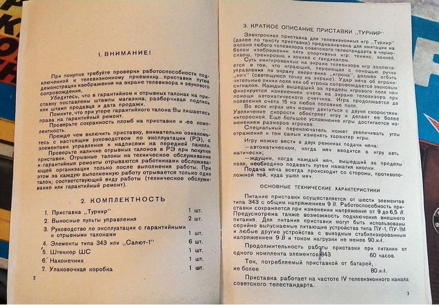 Приставка к телевизору для телеигр *Турнир* выпускалась с 1978 года. *Турнир* это небольшая приставка к телевизору, которая позволяет имитировать на телевизионном экране такие спортивные игры, как теннис, хоккей, сквош и др. Счет очков в партии ведется автоматически на экране телевизора. Изменяя скорость полета мяча, размер ракеток, углы отскока мяча, можно усложнить каждую игру. Звуковое сопровождение ударов мяча делает каждую игру еще более привлекательной. Приставка *Турнир* подключается к антенному входу любого телевизора, включенного на работу в 4-м канале. Питается приставка от шести элементов 343 или от выпрямителя напряжением 9 В. Масса приставки 2,5 кг. У приставки современный внешний вид, её корпус из ударопрочного полистирола. С приставкой в кругу семьи можно организовать интересные спортивные состязания для детей и для взрослых. Цена приставки 150 рублей.