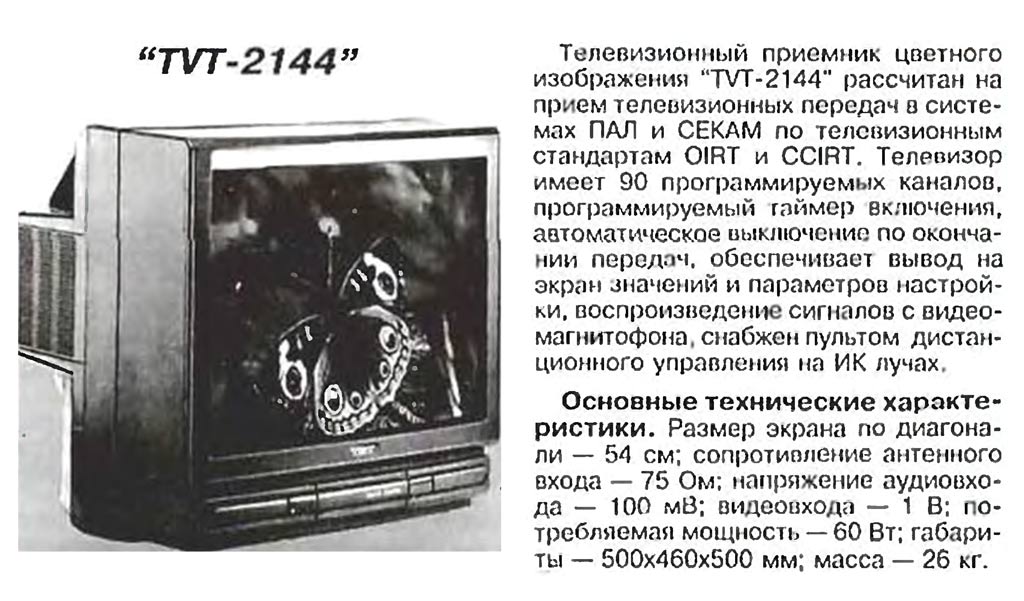 Телевизор цветного изображения *ТВТ-2144* (TVT-2144) выпускал с 1995 года Фрязинский телевизионный завод. Информация о телевизоре в Радио за 1995 год.