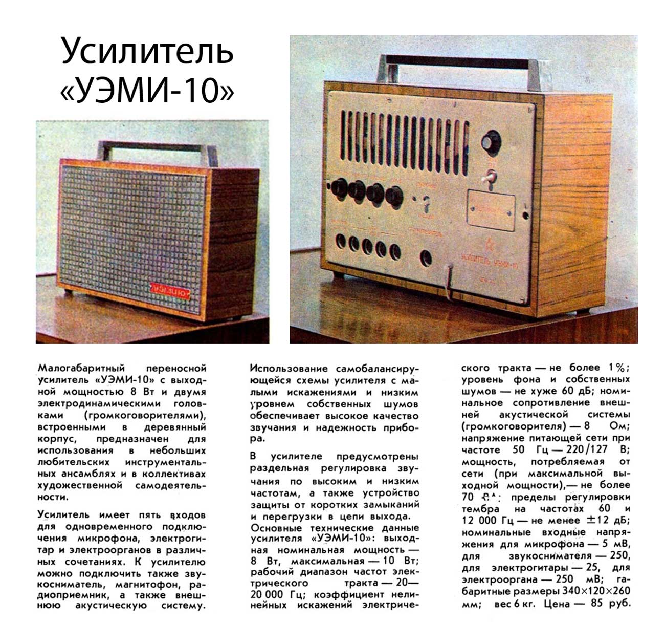 Усилитель низкой частоты *УЭМИ-10* выпускался с 1975 года. Усилитель эстрадный музыкальный индивидуальный *УЭМИ-10* предназначен для усиления и воспроизведения электрических сигналов с электромузыкальных инструментов и микрофона. Номинальная выходная мощность 8 Вт, максимальная 10 Вт. Диапазон усиливаемых частот по напряжению 20...20000 Гц, по звуковому давлению 80...10000 Гц. КНИ - 1%. Уровень фона - 60 дБ. Входное сопротивление внешней АС - 8 Ом. Потребляемая от сети мощность 60 Вт. Габариты усилителя - 335 х 120 х 255 мм. Масса 6 кг.