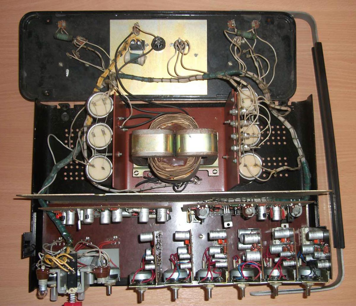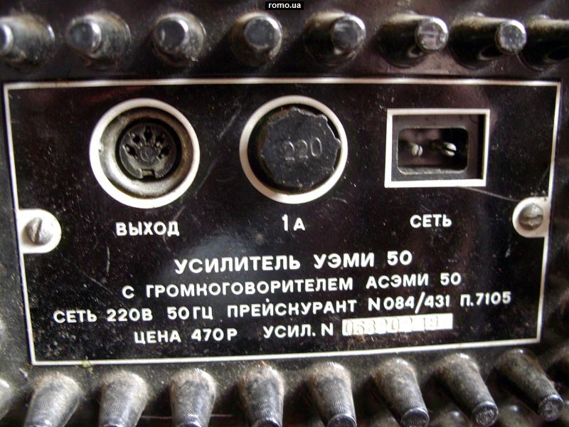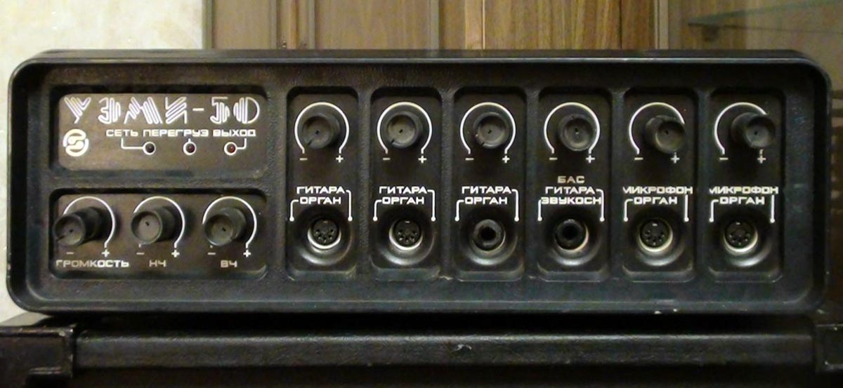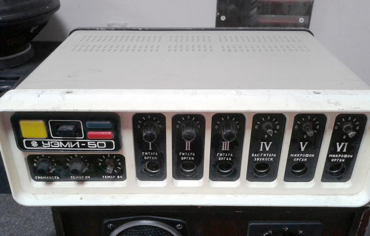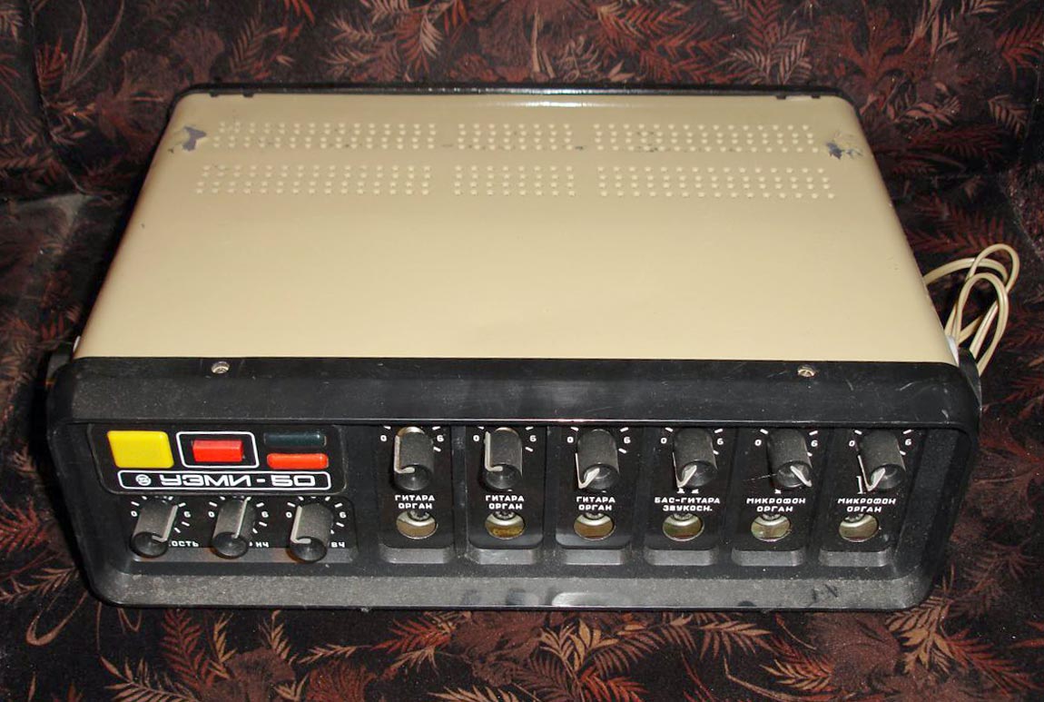Эстрадный усилитель *УЭМИ-50* выпускался с 1980 года. Описание из рекламного проспекта. Усилитель *УЭМИ-50* с громкоговорителем *АС-50* - это модернизированный эстрадный усилитель улучшенной конструкции и акустики. Высоким качеством и силой музыкального звучания, надежностью и удобством в эксплуатации отличается переносный эстрадный усилитель УЭМИ-50. Усилитель позволяет одновременно подключать микрофоны, электрогитары и электроорганы, а также звукосниматель, магнитофон или радиоприемник. Модернизированный, имеется ввиду предыдущий ламповый усилитель, так же с наименованием *УЭМИ-50*. Транзисторный усилитель *УЭМИ-50* с 1985 года выпускался в другом оформлении передней панели. Технические характеристики: Подключение шести источников сигнала с активным микшированием любого из них. Номинальная выходная мощность 50, максимальная 60 Вт. Диапазон воспроизводимых частот, в том числе и АС - 50...18000 Гц. Уровень фона и собственных шумов не хуже -60 дБ. Коэффициент гармонических искажении не более 1%. Номинальное сопротивление усилителя и АС - 6 Ом. Габариты усилителя - 370х180х162 мм, АС - 300х500х700 мм. Масса усилителя - 9 кг, АС - 25 кг.