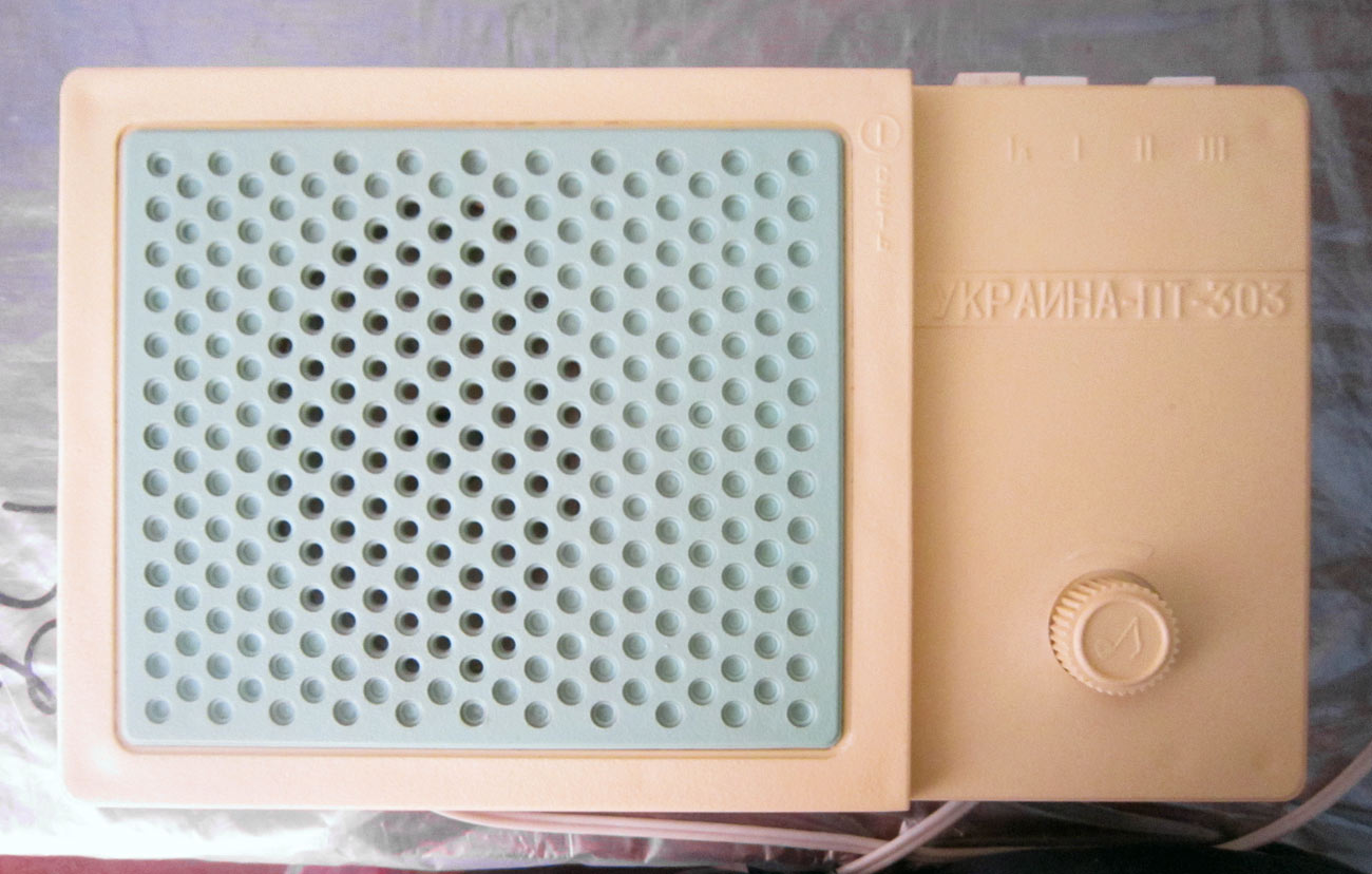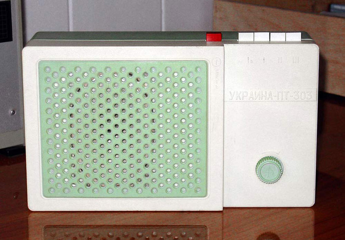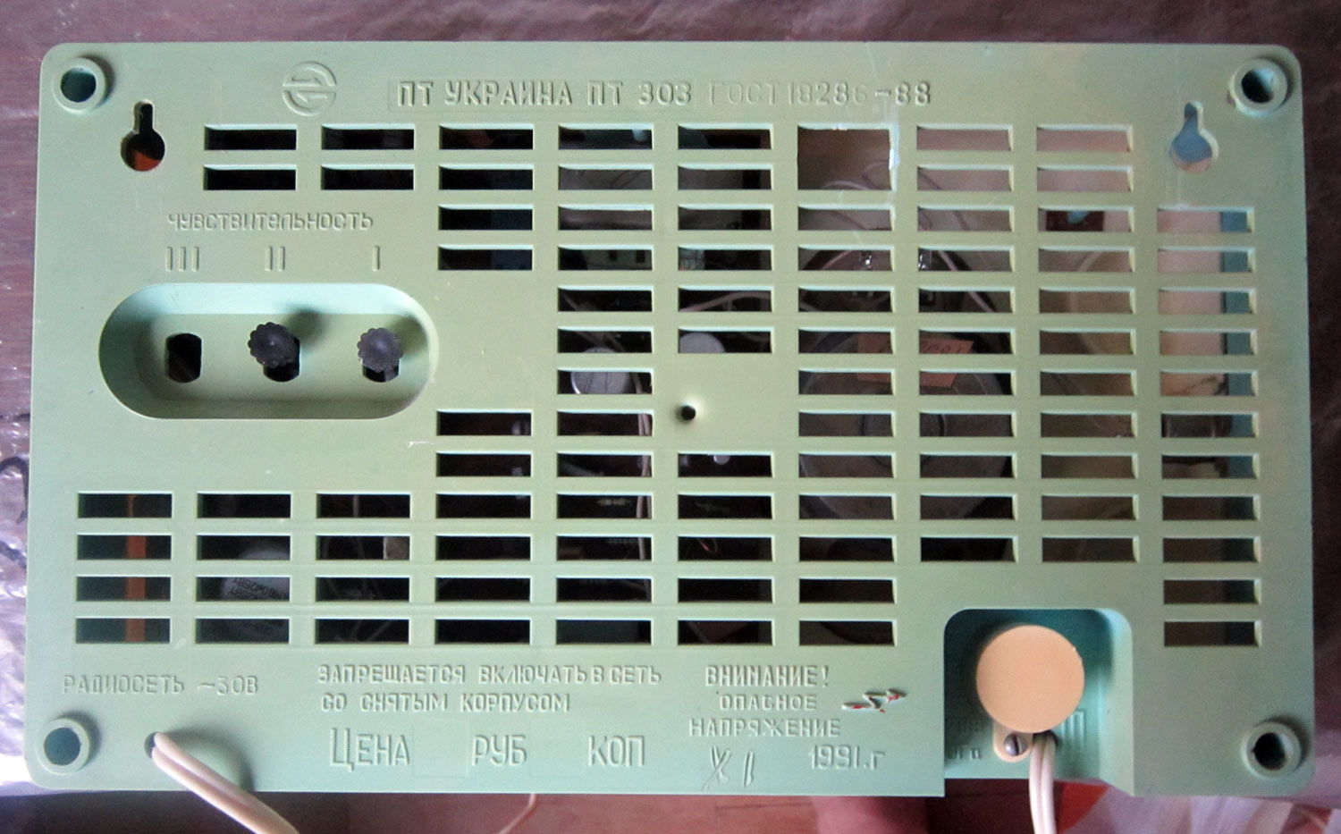 Приёмник трёхпрограммный *Украина-303* с I-кв 1983 года выпускал Макеевский завод электробытовых изделий *Импульс*. ПТ **Украина-303** предназначен для прослушивания любой из трёх программ, передаваемых по уплотнённой системе 3-х программного проводного вещания. ПТ работает с напряжением в трансляционной сети 30 В. Диапазон воспроизводимых частот звука НЧ канала 160...8000, ВЧ каналов 150...6300 Гц. Номинальная выходная мощность - 300 мВт, максимальная до 700 мВт. Имеется возможность дополнительного усиления первого НЧ канала. Потребляемая мощность 4 Вт. Габариты ПТ - 280х187х98 мм. Масса - 2,2 кг. С 1988 года ПТ выпускался под наименованием *Украина ПТ-303*.
