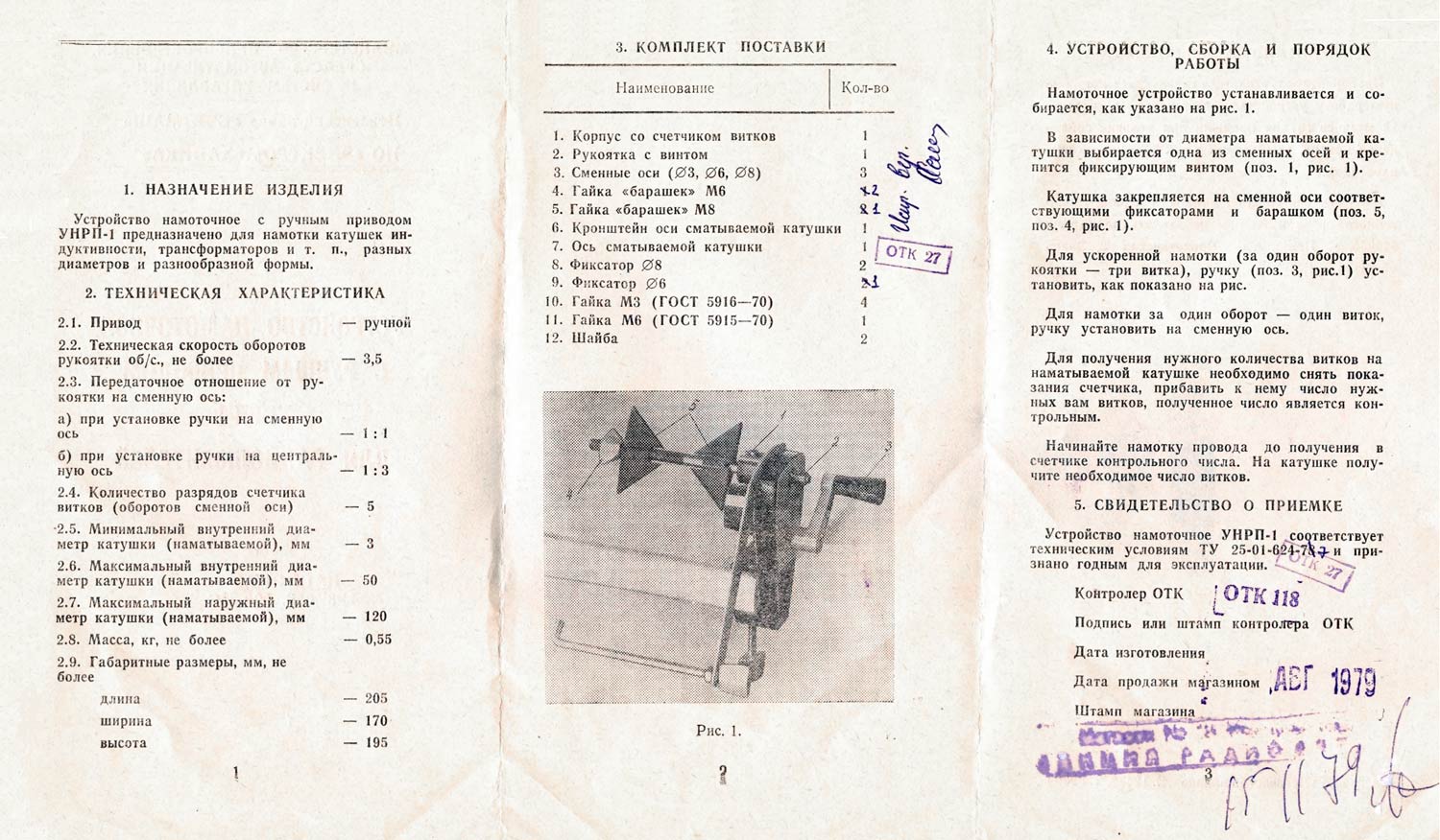Устройство намоточное с ручным приводом *УНРП-1* для радиолюбителей выпускалось возможно с 1977 года Пензенским заводом *СЧЁТМАШ*.