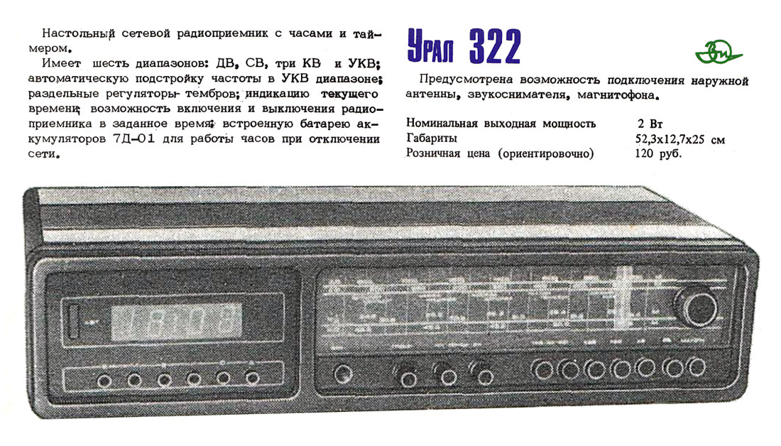 Стационарный транзисторный радиоприёмник *Урал-320* с 1983 года выпускал Сарапульский завод имени Орджоникидзе. Радиоприёмник рассчитан на приём в диапазонах ДВ, СВ, КВ (3 поддиапазона) и УКВ. В нём имеется АПЧ в диапазоне УКВ, раздельная регулировка тембра по НЧ и ВЧ, внутренняя магнитная антенна для приёма в диапазонах ДВ и СВ. Реальная чувствительность в диапазонах: ДВ и KB - 200 мкВ, СВ - 150 мкВ и УКВ - 5 мкВ. Селективность в диапазонах ДВ, СВ 30 дБ. Номинальная выходная мощность 2 Вт. Диапазон воспроизводимых звуковых частот в тракте АМ - 125...3550 Гц, УКВ-ЧМ - 125...10000 Гц. Потребляемая мощность 15 Вт. Габариты приёмника - 523х127х238 мм. Масса - 5,5 кг. Розничная цена 100 рублей. Приёмник выпускался по 1986 год включительно. Выпущено около 100 тысяч экземпляров. Завод так же подготовил к выпуску с 1983 года радиоприёмник *Урал-322*, который отличался от описанного наличием электронных часов и таймера, выносом громкоговорителя на верхнюю панель и соответственно оформлением. В производство этот приёмник не пошёл.