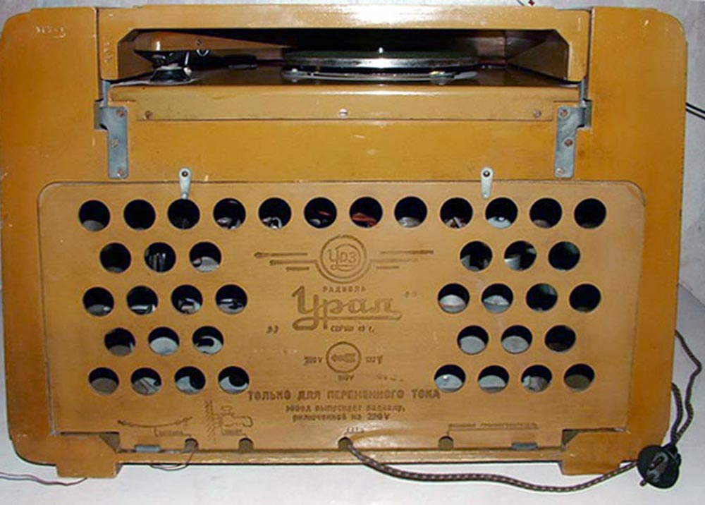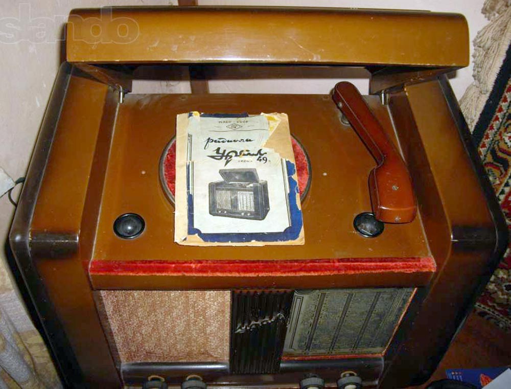 Радиола сетевая ламповая *Урал-49* с начала 1949 года выпускалась на Сарапульском заводе имени Серго Орджоникидзе и на Заводе № 626 НКВ (Свердловский завод Автоматики). Внешний вид и конструкция радиолы **Урал-49** стали основой для создания последующих радиол серии **Урал**. Радиола **Урал-49** состоит из 6-ти лампового приёмника и электропроигрывателя на 78 об/мин. Диапазоны частот до 1951 года: ДВ 150...410 кГц, СВ 520...1500 кГц, КВ 4,5...15,5 МГц. Выходная мощность 2 Вт, при коэффициенте искажений 7%. Полоса пропускания всего тракта обеспечивает воспроизведение диапазона звуковых частот 100...4000 Гц. АРУ обеспечивает изменение напряжения на выходе на 10 дБ при изменении на входе на 26 дБ. Потребляемая мощность 100 Вт (при асинхронном двигателе 110 Вт) и 80 Вт при приёме. При переключении на работу ЭПУ освещение шкалы и индикатора выключается. Габариты радиолы 549х393х310 мм, его вес 24 кг. В начале 1950 года радиола модернизирована в **Урал-49М**. Изменена электрическая схема, в которой некоторые элементы и лампы заменены другими. Изменены диапазоны. СВ диапазон расширен до 1600 кГц, а КВ диапазон 4...12,1 МГц подогнан под будущий ГОСТ 1951 г. ЭПУ первых радиол состояло из синхронного электродвигателя типа СМ-1 и электромагнитного звукоснимателя AM, смонтированых на панели из дерева. Включение звукоснимателя и двигателя производилось отдельным переключателем. Электродвигатель был подключен к силовому трансформатору так что при переключении на любое из питающих напряжений к нему всегда подводилось 110 вольт. В модернизированной радиоле ЭПУ изменено. В нём применён асинхронный электродвигатель типа ДАГ с диском и электромагнитный звукосниматель ЗС. Введён автостоп, связанный с рычагом звукоснимателя и автоматически подающий питание на двигатель в зависимости от положения звукоснимателя относительно грампластинки. ЭПУ собрано на шасси из металла. Внешнее оформление и характеристики базовой и модернизированной радиол одинаковы. В начальный период модернизации были радиолы имевшие комбинированные элементы, например диапазон 19 метров и новый электродвигатель. Свердловская радиола отличалась логотипом УРЗ (Уральский Радио Завод) и чёрной шкалой, а вверху, около индикатора точной настройки, на фоне красного знамени был черный силуэт памятника Я.М.Свердлову. Отмечу, что Свердловский завод № 626 НКВ (УРЗ) выпускал эти и последующие модели радиол в разы меньшим количеством, чем Сарапульский радиозавод.