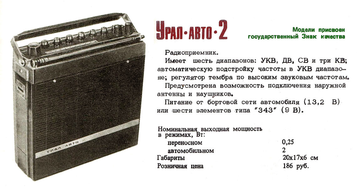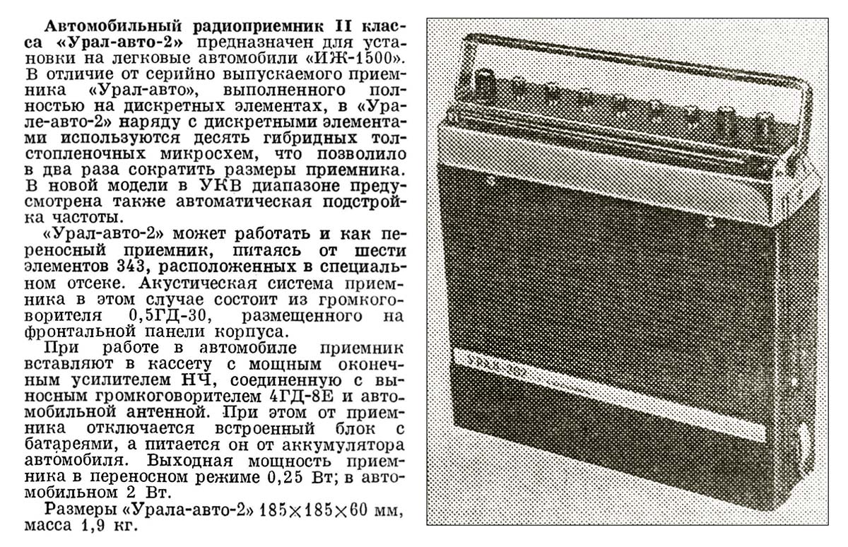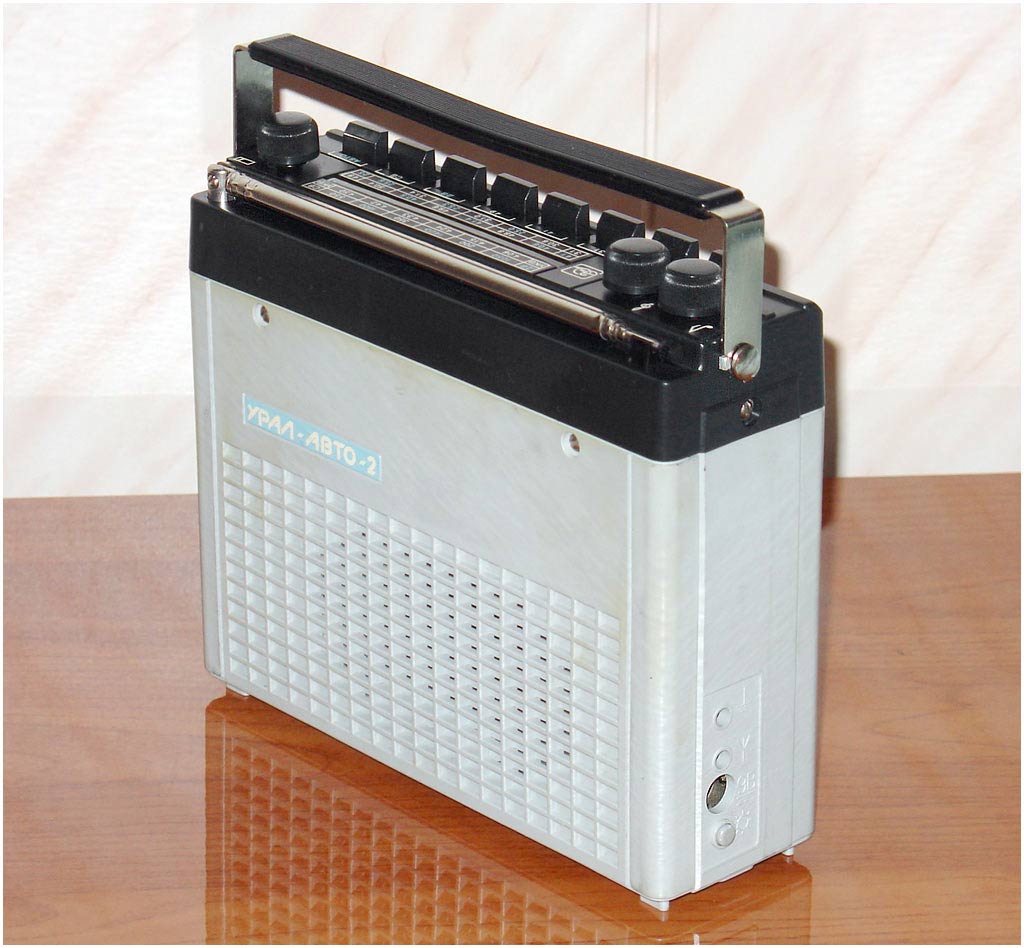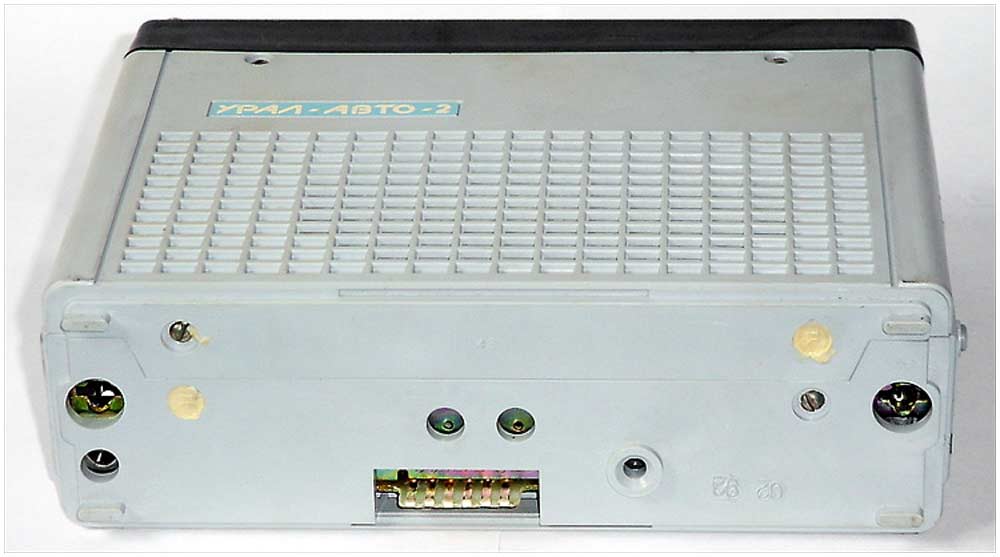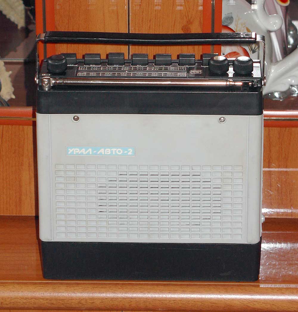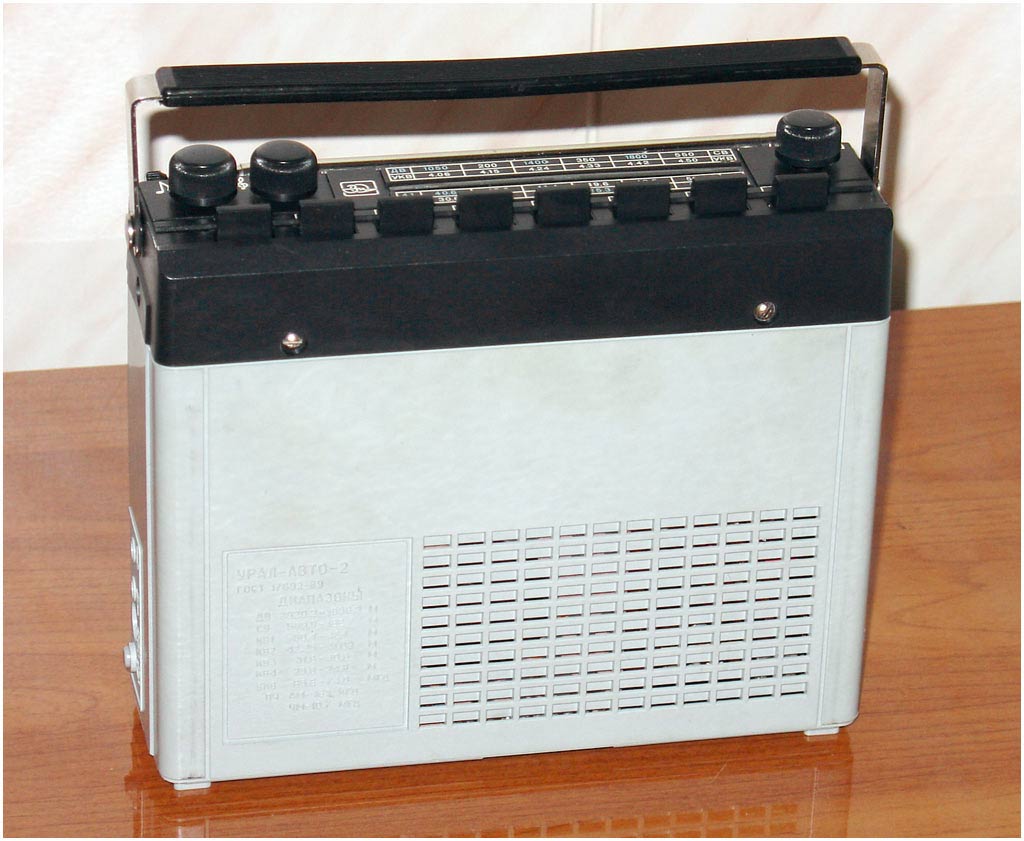 Радиоприёмник автомобильный *Урал-авто-2* с 1973 года выпускал Сарапульский завод им. Оджоникидзе. По заказу Ижевского автозавода разработан и производился автомобильно носимый приёмник на 10 микросхемах **Урал-авто-2**, другое более редкое наименование *Урал-авто-202**. Модель является модернизацией приёмника **Урал-авто** и рассчитан на установку в автомобили ИЖ-1500. Однако его можно было использовать в любых легковых или грузовых автомобилях с напряжением бортовой сети 12...15 вольт. Радиоприёмник рассчитан на приём радиовещательных станций в диапазонах: ДВ, СВ, КВ (49, 31, 25 м) и УКВ. В автомобильном режиме приёмник работает в специальной кассете и с помощью разъёмов подключается к антенне, громкоговорителю и бортовой сети. В переносном режиме приём в диапазонах ДВ, СВ ведется на магнитную антенну, а в KB и УКВ на телескопическую. При этом приёмник питается от 6 элементов 343. Чувствительность в автомобильном режиме в диапазонах: ДВ 200 мкВ, СВ 75 мкВ, KB 50 мкВ, УКВ 5 мкВ, в переносном режиме: ДВ 2 мВ/м, СВ 1 мВ/м, KB 200 мкВ/м, УКВ 20 мкВ/м. ПЧ AM тракта - 465 кГц, ЧМ - 10,7 МГц. Избирательность по соседнему каналу в диапазонах АМ при расстройке ±10 кГц - 40 дБ. Усредненная крутизна скатов резонансной характеристики в диапазоне УКВ-ЧМ 0,17 дБ/кГц. Выходная мощность в авторежиме 2/4 Вт, в переносном 0,25/0,5 Вт. Полоса ЗЧ при работе на внутренний громкоговоритель 0,5ГД-30 - 200...4000 Гц в АМ и 200..10000 Гц в ЧМ тракте. При работе на внешний громкоговоритель 4ГД-8Е, полоса ЗЧ 125...7100 Гц и 125...10000 Гц. Приёмник имеет регулировку тембра ВЧ глубиной 10 дБ. Время работы от батарей 343 при средней громкости 50 часов. Габариты переносного приёмника 195х60х190 мм, автомобильного 195х60х145 мм. Масса 1,9 кг. Радиоприёмник **Урал-авто-2** выпускался вплоть до начала 1992 года, претерпев модернизацию внешнего вида.