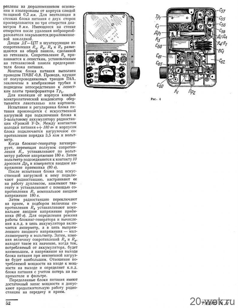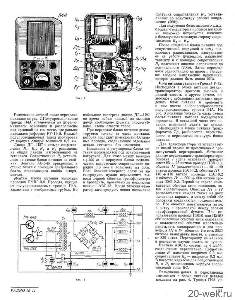 Радиостанции *Урожай У-1* и *Урожай У-2* выпускали с 1947 и 1954 года Омский радиозавод им. Козицкого и Егоршинский радиозавод. Радиостанция **Урожай У-1** предназначена для радиосвязи в сельском хозяйстве. Она работает в диапазоне 2000...3000 КГц и выпускалась в нескольких сериях по частотам. Каждая радиостанция имеет две фиксированные частоты стабилизированные кварцами, поэтому при работе настройка не требовалась. Радиостанция допускает симплексную и дуплексную связь. Симплексная работа производится на одной частоте. Дуплексная связь ведется как по обычному телефону. В этом случае передатчики радиостанций работают на разных частотах, отличающихся на 456 кгц. Для работы нужны 2 антенны: для приёма и передачи. Возможно присоединение радиостанции к телефонной сети. Радиостанция обеспечивает уверенную связь на расстоянии до 30 км. Мощность излучения составляет 0,75 Вт. Питание от аккумуляторной батареи 12 В. Анодное напряжение получается от вибропреобразователя. С 1954 года выпускалась модернизированная радиостанция **Урожай У-2** на пальчиковых радиолампах которая могла питаться так же и от сухих батарей. Доработка блока питания (Радио №11/1960 ст.50):