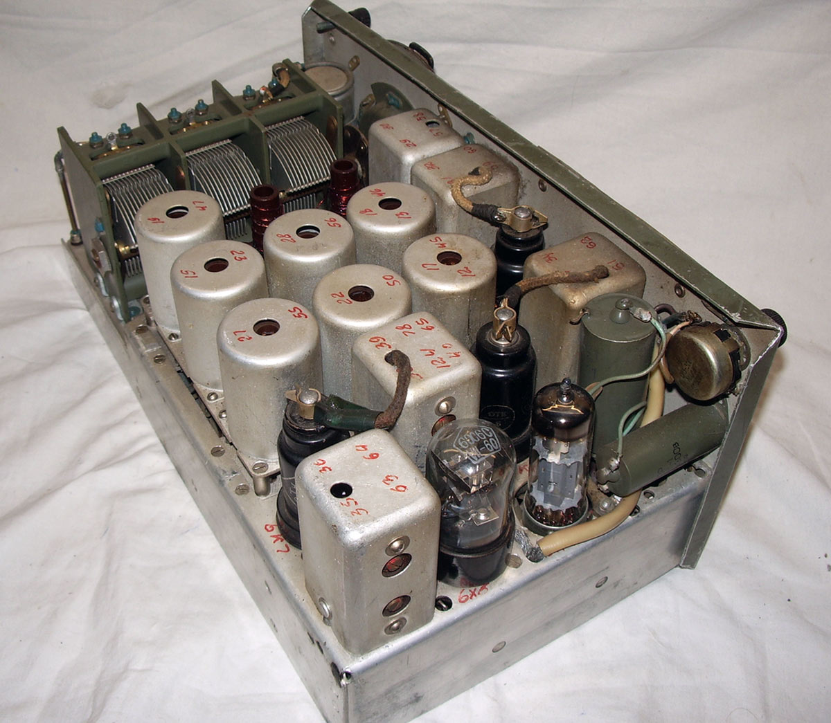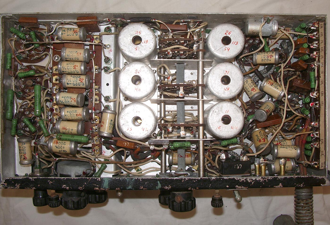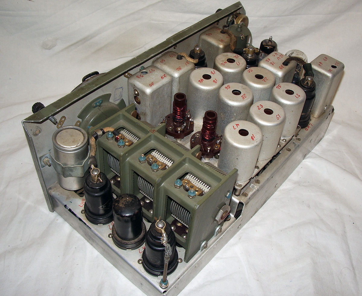 Универсальный КВ радиоприёмник *УС-П* выпускался возможно с 1948 года. Приёмник предназначен для приёма радиостанций работающих АМ, тональной модуляцией и телеграфом (CW). Он стал модернизацией приёмников **УС** и **УС-1**. Приёмник был создан для военной авиации, но применялся как связной и даже как трансляционный. Он представляет собой супергетеродин с одним преобразованием частоты, имеет диапазон от 173 кГц до 12 МГц разбитый на пять поддиапазонов. Градуировка на поддиапазонах **I** 173...350 кГц и **II** 350...875 кГц отсутствует, её заменяет точная шкала разбитая на 180 градусов. Диапазоны 3 - 4 - 5 имеют перекрытие 900..2150 кГц, 2150...5000 кГц и 5000...12000 кГц. Аппарат имеет каскад УВЧ на лампе 6К7, преобразователь с гетеродином на лампах 6А7 и 6К7, два каскада УПЧ на 2-х лампах 6К7. ПЧ = 112 кГц. Каскады охвачены системой АРУ с задержкой. На 5-м поддиапазоне УВЧ отключает схему АРУ и работает с максимальным усилением. Детектор и АРУ собраны на лампе 6Х6С. УНЧ собран на лампе 6К7, которая нагружена на автотрансформатор с отвода которого через ёмкость подаётся сигнал на телефоны. Чувствительность приёмника 10 мкВ в АМ режиме и 4 мкВ в CW. Избирательность по соседнему каналу при приёме в CW превышает 90 дБ, при приёме АМ около 60 дБ. Питание осуществляется от умформера который от напряжения 25,5 В постоянного тока обеспечивает напряжение 220 В по цепям анода и 6,3 В по накалу, при токе 0,6 А. Размеры приёмника 113х331х204 мм. Вес без умформера 5,6 кг. Надписи на ручках управления выполнены радиоактивной краской, фон которой превышает естественный в 15...30 раз и постоянно светящейся в темноте красивым зеленоватым светом, впрочем впоследствии надписи выполнялись обычной белой краской.