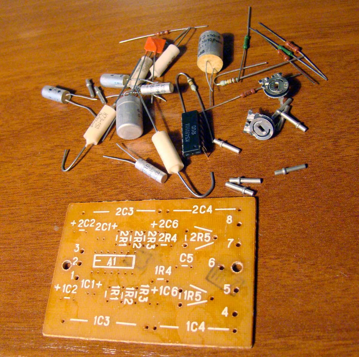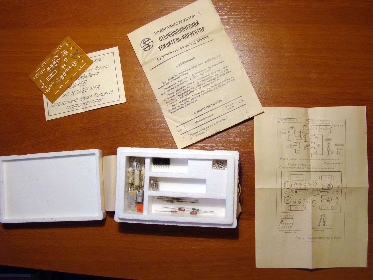 Радиоконструктор *Стереофонический усилитель-корректор* выпускался с начала 1986 года. Радиоконструктор позволяет собрать корректирующий усилитель для электромагнитной головки электропроигрывателя или электрофона. Необходимость в применении такого усилителя вызвана тем что нобходимо компенсировать подъём на высших частотах, полученный в процессе записи программы на пластинку и несколько уменьшить частотные искажения вносимые электромагнитной головкой. Диапазон частот усилителя-корректора 20...20000 Гц. Отношение сигнал-шум 68 дБ. Коэффициент гармоник 0,05 %. Входное сопротивление 300 кОм. Сопротивление нагрузки 10 кОм. Габариты собранной платы - 105х130х55 мм. Её масса - 150 гр.