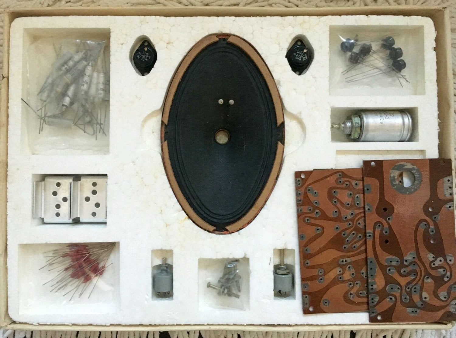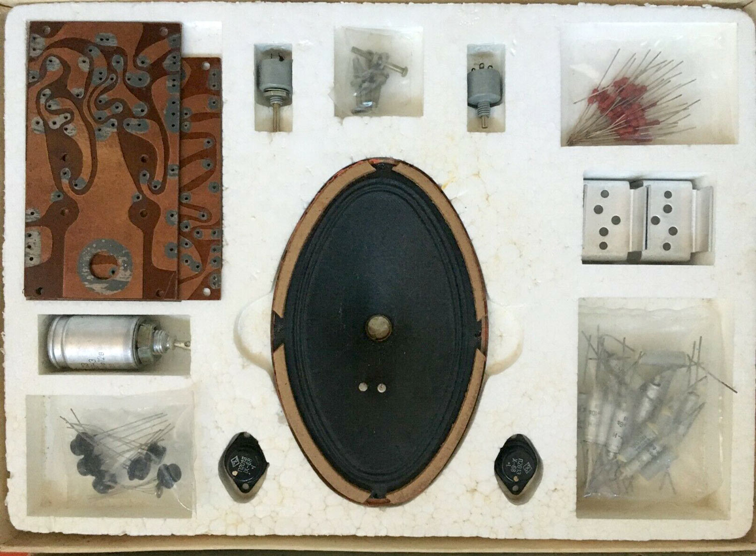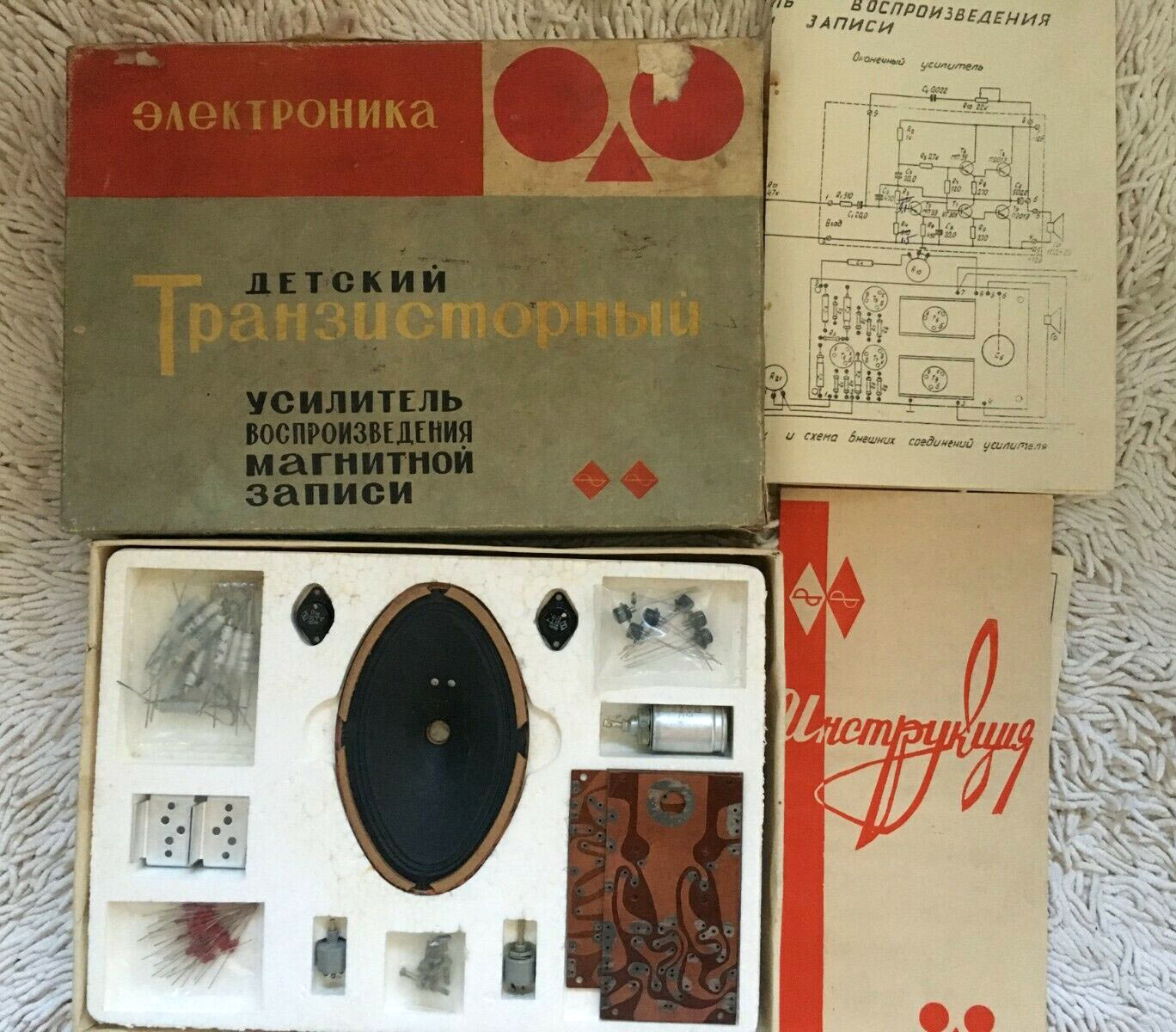 Набор деталей для радиолюбителя (Электроника) *Усилитель воспроизведения магнитной записи* выпускался возможно с 1968 года. Собранный усилитель состоит из 2-х плат усилителей, предварительного и оконечного и предназначен для усиления сигнала с магнитной головки самодельного магнитофона или магнитофонной приставки. Питание от батарей или блока питания с напряжением 12 вольт. Номинальная выходная мощность 1 Вт, максимальная более 2 Вт. Диапазон воспроизводимых звуковых частот по электрическому напряжению без подключения магнитной головки и громкоговорителя - 60...12000 Гц, через громкоговоритель идущий в наборе 1ГД-18 и с акустическим отражателем или стоящим в АС 100...10000 Гц.