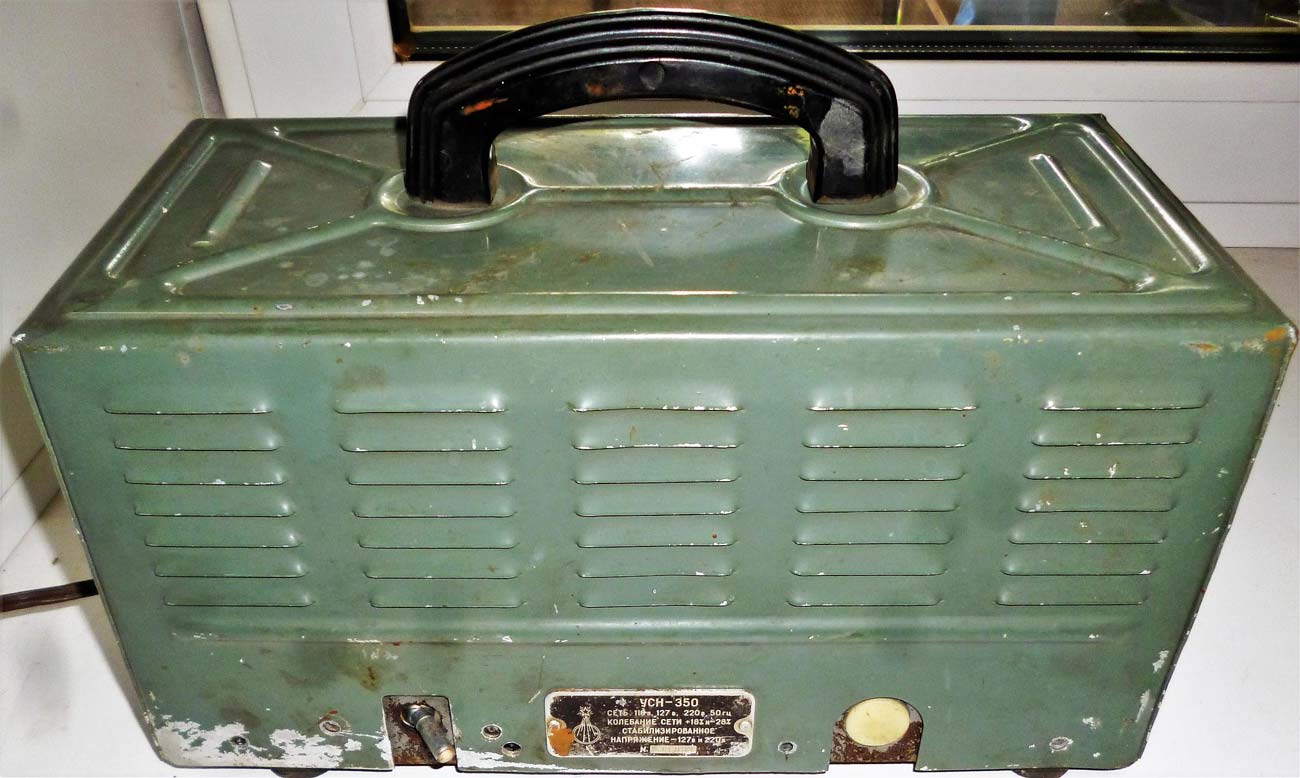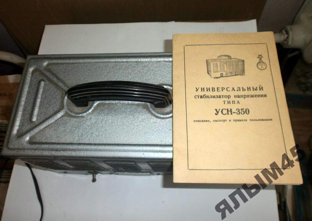 Универсальный стабилизатор напряжения *УСН-350* выпускался с 1954 года. Стабилизатор предназначен для питания стабилизированным наряжением 127 или 220 В различной бытовой аппаратуры с потребляемой мощностью до 350 Вт. Рассчитан на активную и реактивную нагрузку. Габариты 310х140х350 мм. Масса 12 кг.