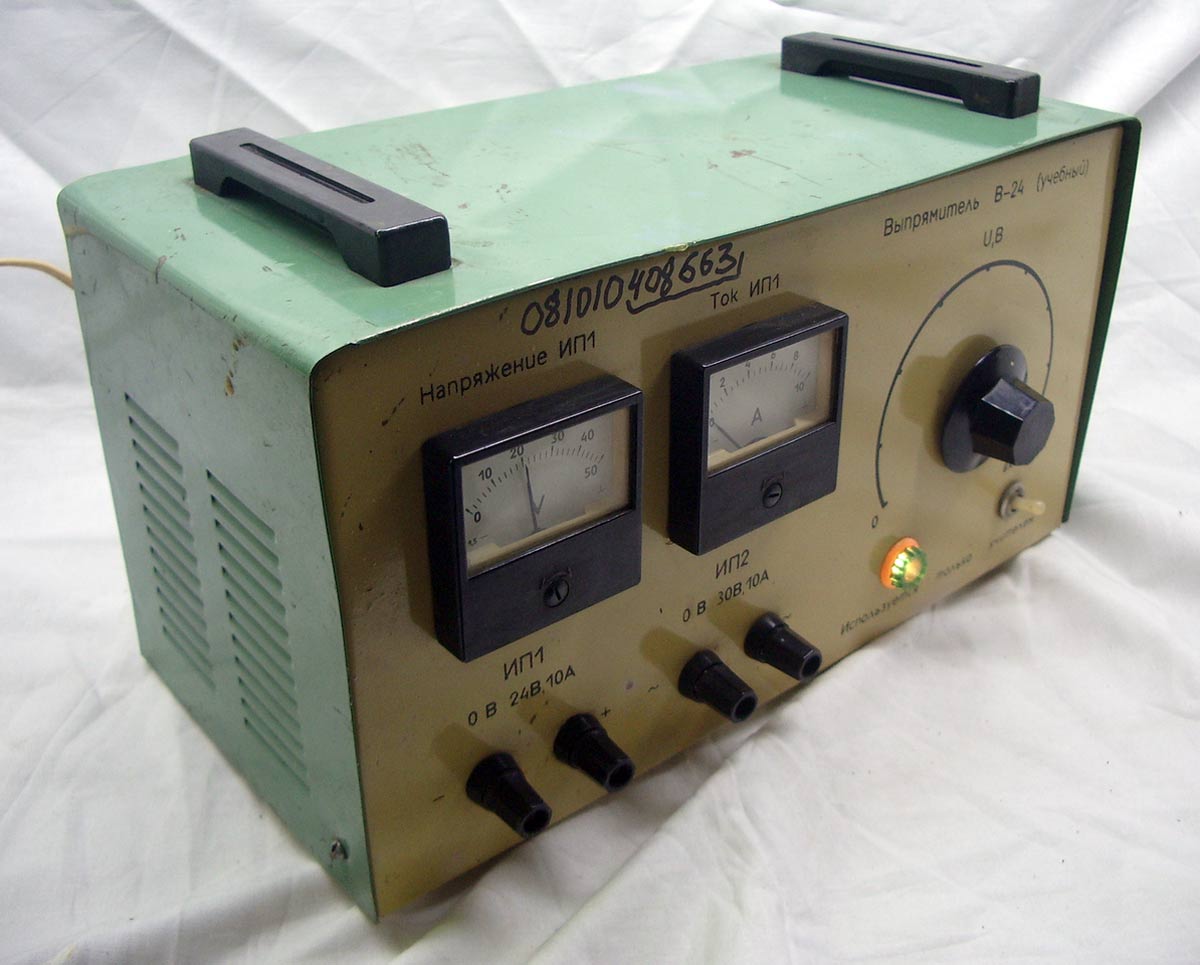Выпрямитель учебный *В-24* выпускался с 1977 года. Предназначен для получения регулируемого напряжения переменного тока от 0 до 30 В и постоянного (пульсирующего) от 0 до 24 В при проведении работ на уроках физики в общеобразовательной школе. Питается от сети переменного тока напряжением 220 или 127 В, частотой 50 Гц. Сила тока в нагрузке до 10 А. Максимальная потребляемая мощность 500 Вт. Габариты выпрямителя 350х200х210 мм. Его масса 8,7 кг.