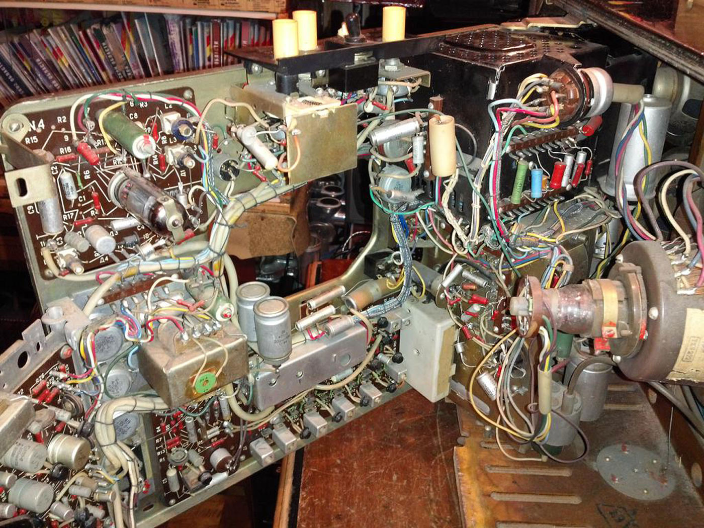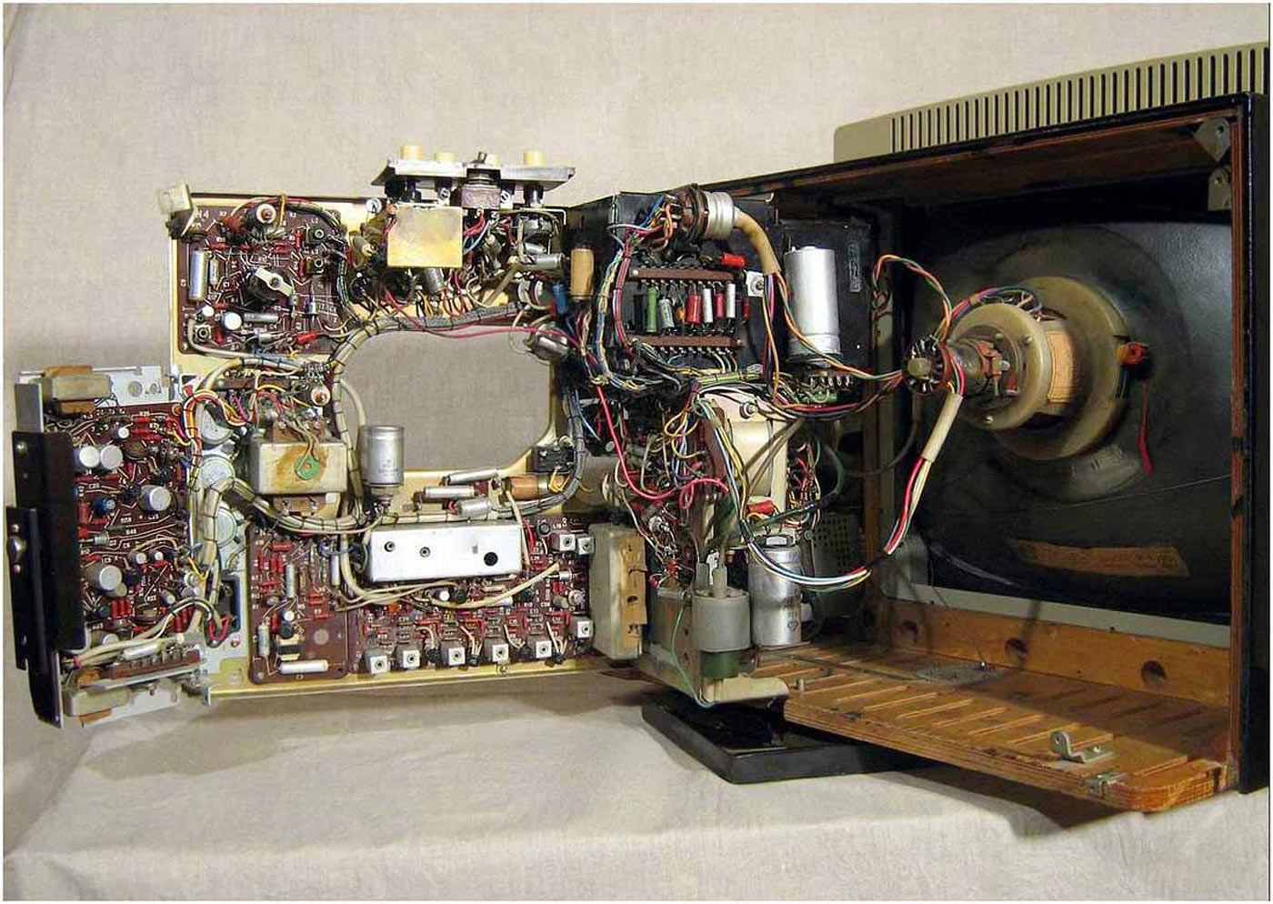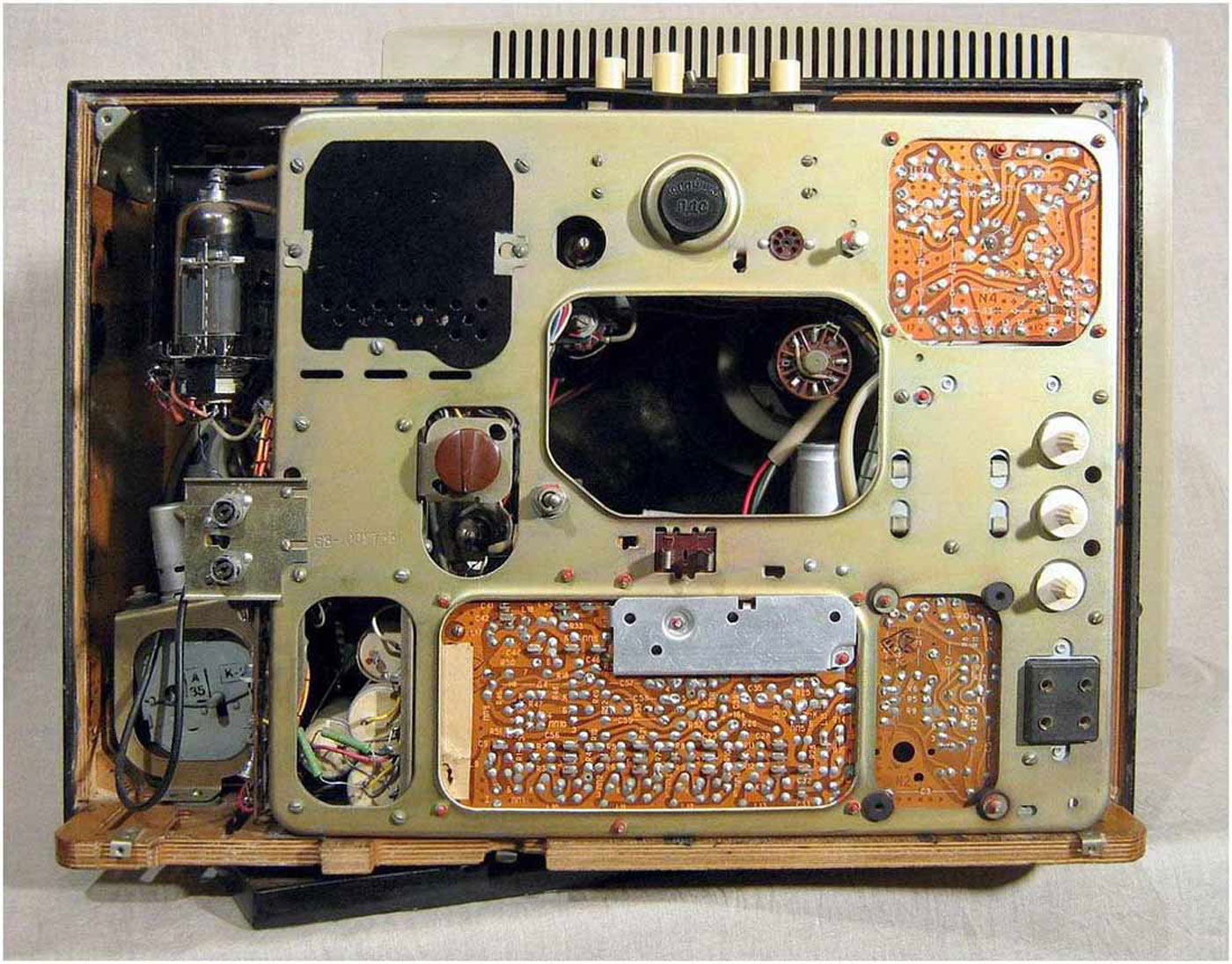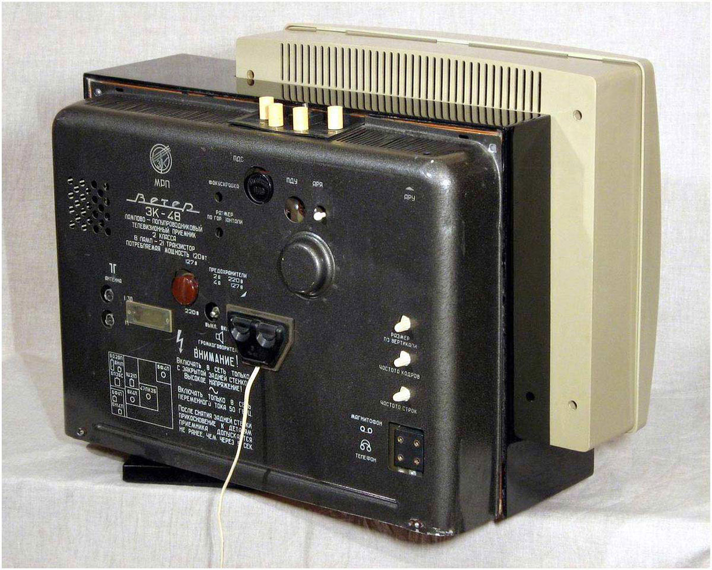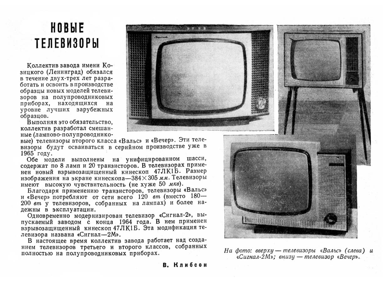 Телевизионный приёмник *Вечер* с 1965 года выпускал Ленинградский завод им. Козицкого. Лампово-полупроводниковый телевизор 2 класса *Вечер* является первым отечественным комбинированным аппаратом. От выпускавшихся ранее, он отличается не только своеобразным видом. Кроме ламп, в нём использованы транзисторы. Ещё особенность, это наличие устройства автоматической регулировки яркости, в зависимости от освещения. К аппарату можно подключить ПДУ и приставку двухречевого сопровождения. Кроме обычных регуляторов, имеется мостовой регулятор тембра по НЧ и ВЧ. Высокая экономичность, надёжность, хорошее качество изображения и звука, вот его отличительные черты. Телевизор имеет 8 ламп, 21 транзистор и 25 диодов. Кинескоп 47ЛК2Б. В АС используется два громкоговорителя 1ГД-19. Количество программ 12. Чувствительность 50 мкВ. Размер изображения 384х305 мм. Чёткость по горизонтали 450, по вертикали 500 линий. Полоса воспроизводимых звуковых частот 100...10000 Гц. Номинальная выходная мощность 1 Вт. Яркость свечения кинескопа 100 нит. Потребляемая мощность 120 Вт. Габариты модели 610х480х340 мм. Вес 25 кг. Паралельно на заводе производился аналогичный по схеме и конструкции но в другом оформлении телевизор **Вальс**, который через непродолжительное время был снят с производства.