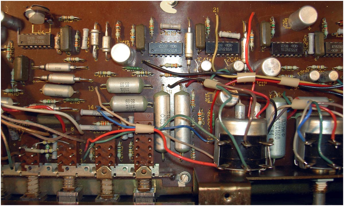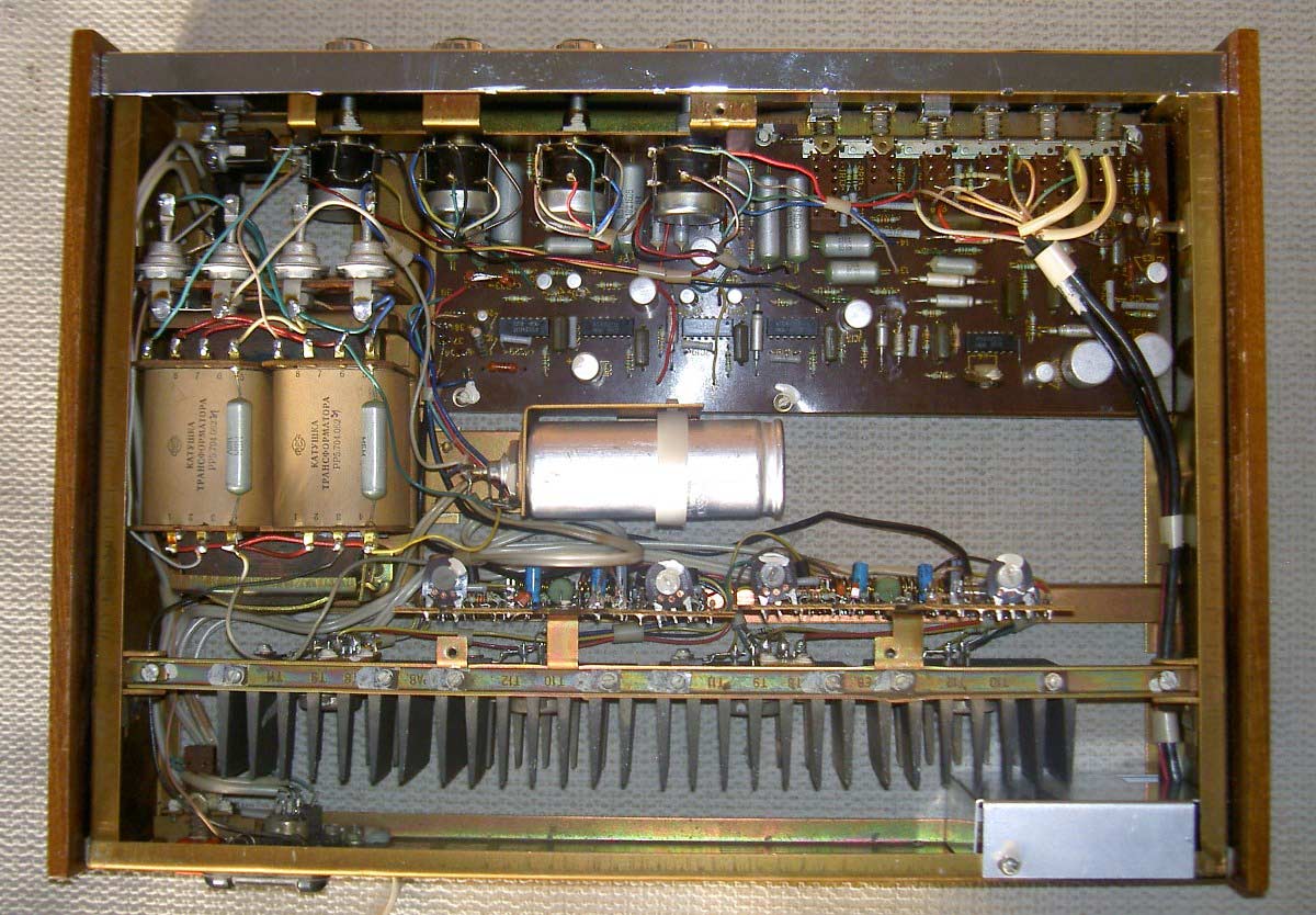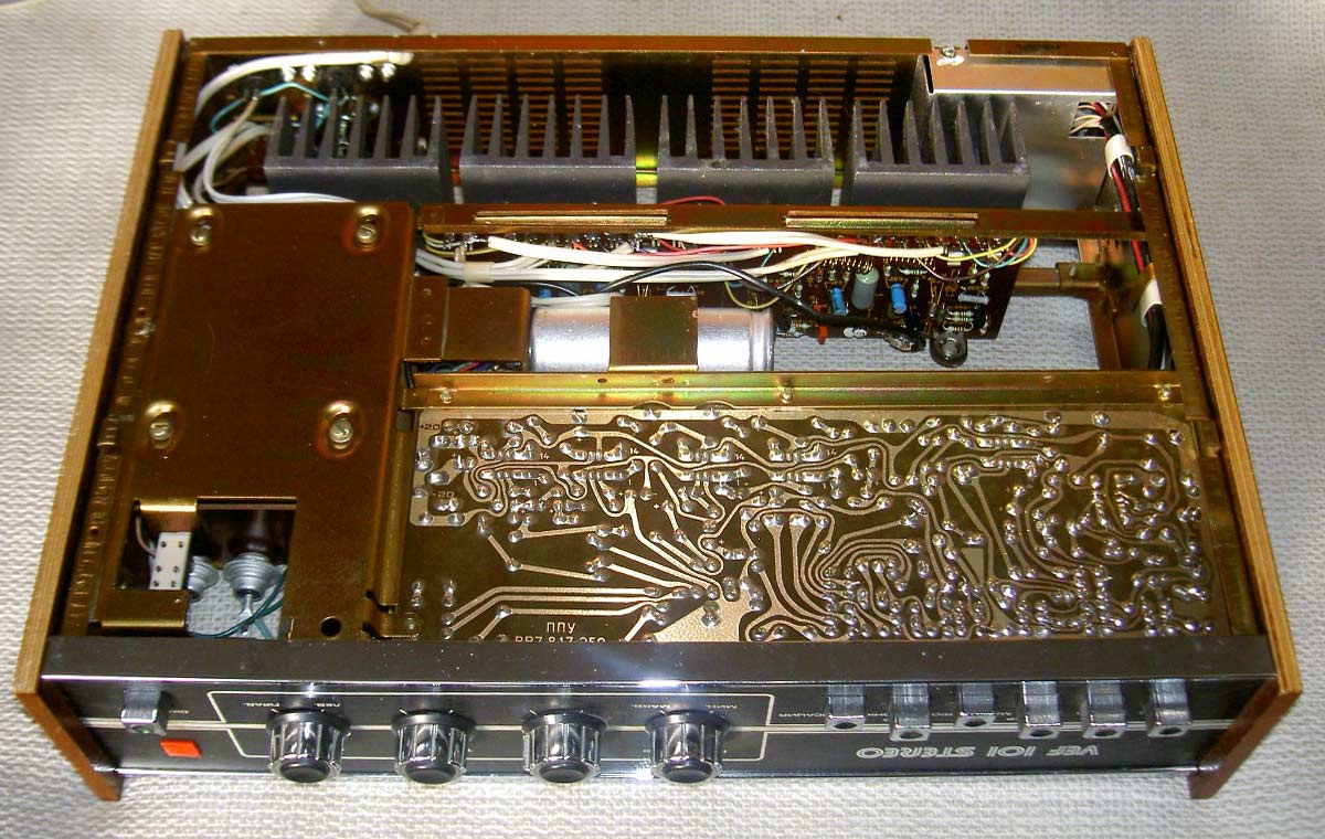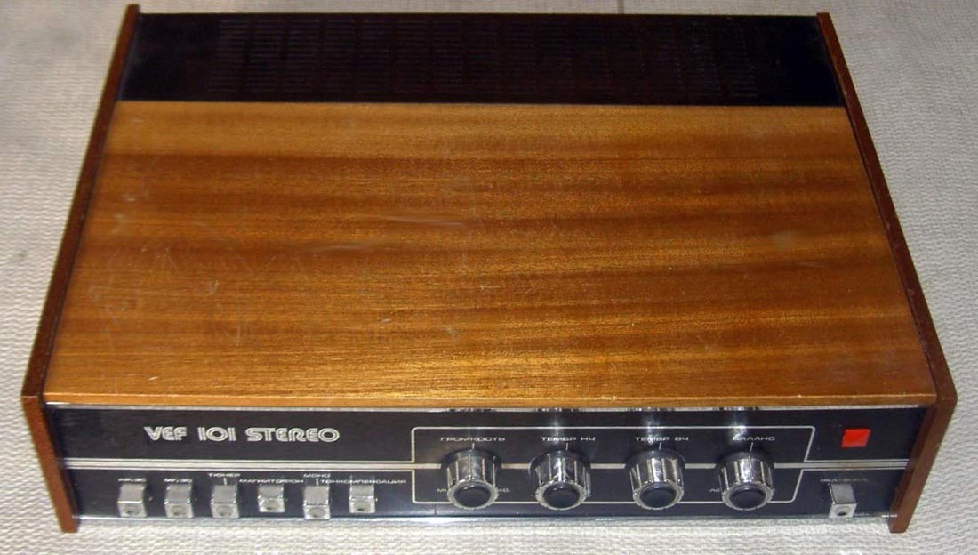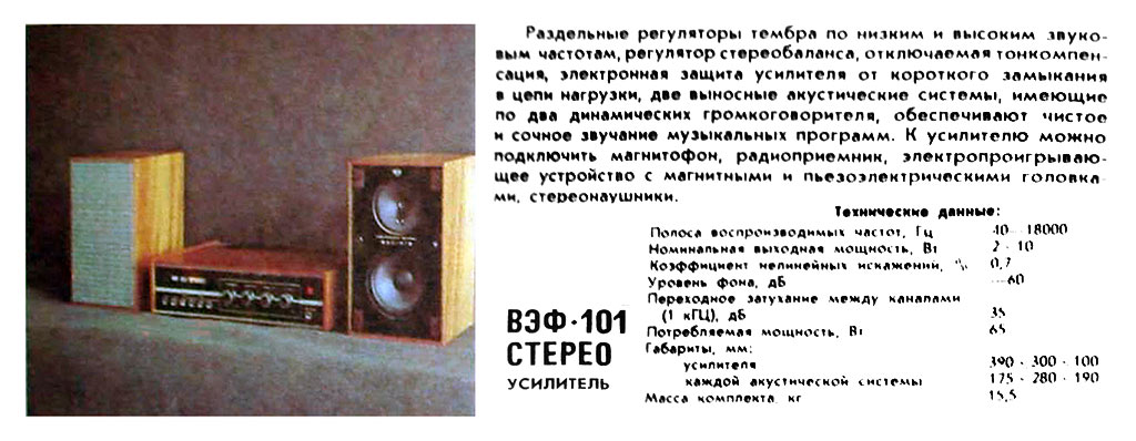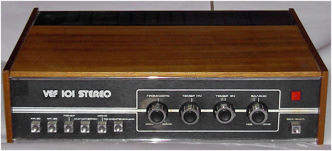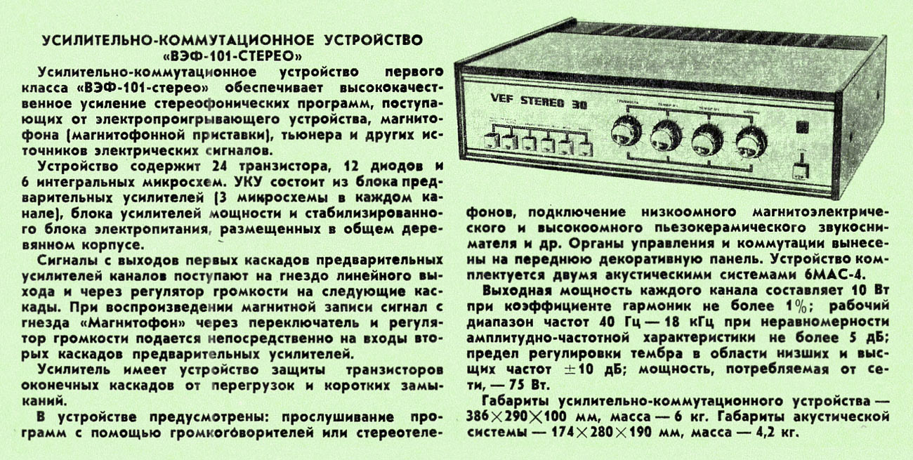 Усилительно-коммутационное устройство *ВЭФ-101-стерео* с 1977 года выпускал Государственный электротехнический завод *ВЭФ*. *ВЭФ-101-стерео* обеспечивает высококачественное усиление моно и стерео фонограм с различных источников. УКУ содержит 24 транзистора, 12 диодов, шесть интегральных микросхем, состоит из блока ПУ, блока УМ, стабилизированного БП. Сигналы с выходов каскадов первых ПУ поступают на разъём линейного выхода. При прослушивании магнитной записи сигнал через переключатель и регулятор громкости подается непосредственно на вход вторых каскадов ПУ. УКУ имеет защиту транзисторов УМ от перегрузок или коротких замыканий. В УКУ возможно прослушивание фонограмм с помощью АС и стереотелефонов, подключение магнитоэлектрического и пьезокерамического звукоснимателя. Ручки управления вынесены на переднюю панель. УКУ комплектуется АС - *6МАС-4*. Номинальная выходная мощность 2х10 Вт; диапазон рабочих частот 40..18000 Гц при неравномерности АЧХ - 5 дБ; потребляемая от сети мощность 75 Вт. Размеры усилителя 386х290х100 мм, вес 6 кг. Габариты АС - 174х280х190 мм. Масса 4,2 кг. Усилитель *ВЭФ-101-стерео* за годы своего производства неоднократно модернизировался.