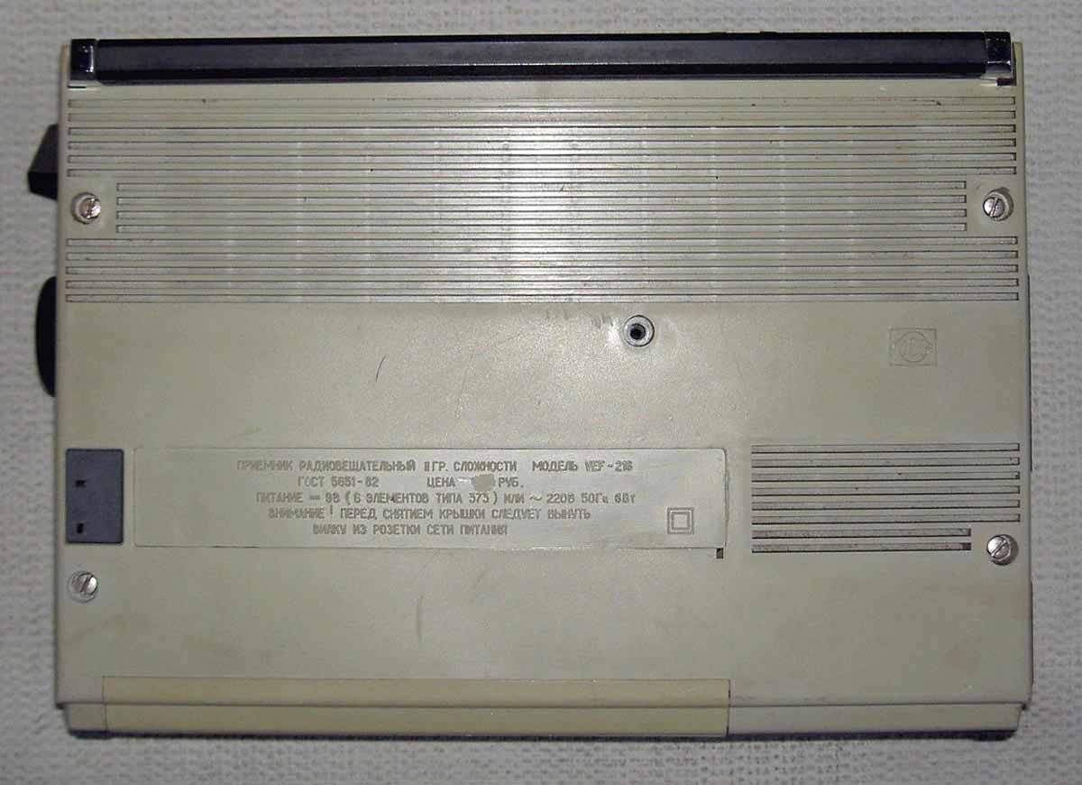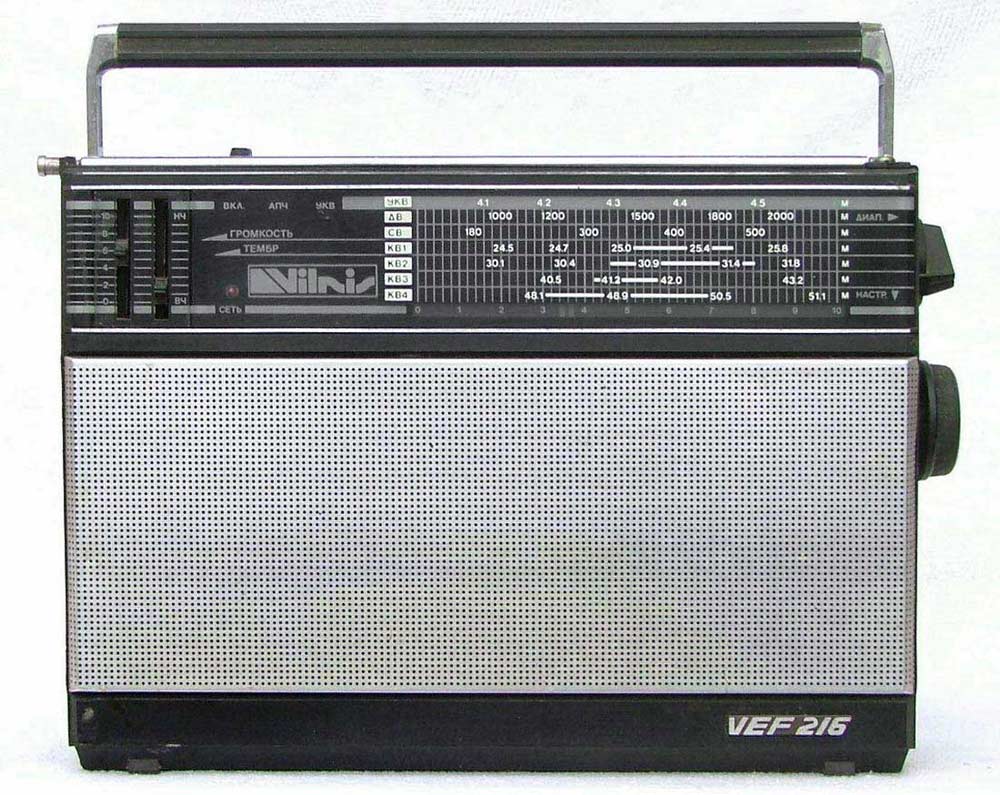 Портативный радиоприёмник *ВЭФ-216* с 1989 года выпускал Рижский радиозавод *ВЭФ*. Радиоприёмник 2-й группы сложности **ВЭФ-216** работает в 7 диапазонах: ДВ, СВ, КВ (4) и УКВ. В нём прдусмотрена АПЧ гетеродина, АРУ, бесшумная настройка, светодиодная индикация настройки на станцию. Предусмотрены гнёзда головного телефона и магнитофона. Чувствительность в диапазонах ДВ 1,5, СВ 0,7, КВ 0,3 мВ/м, УКВ 50 мкВ. Селективность 26 дБ. Полоса воспроизводимых звуковых частот при работе в ЧМ 150...10000 Гц. Номинальная выходная мощность 250 мВт. Питание универсальное, от сети или 6 элементов А-373. Потребляемый ток при отсутствии сигнала 14 мА, а при средней выходной мощности около 40 мА. Комплекта батарей при средней громкости хватит на 100 ч. работы. Габариты модели 297х247х80 мм. Масса без батарей 2,3 кг. Приёмник **ВЭФ-216** выпускали и в экспортном варианте с диапазоном FM: 88...108 МГц. По своей конструкции и электрической схеме радиоприёмник **ВЭФ-216** схож с радиоприёмником **ВЭФ-214**.