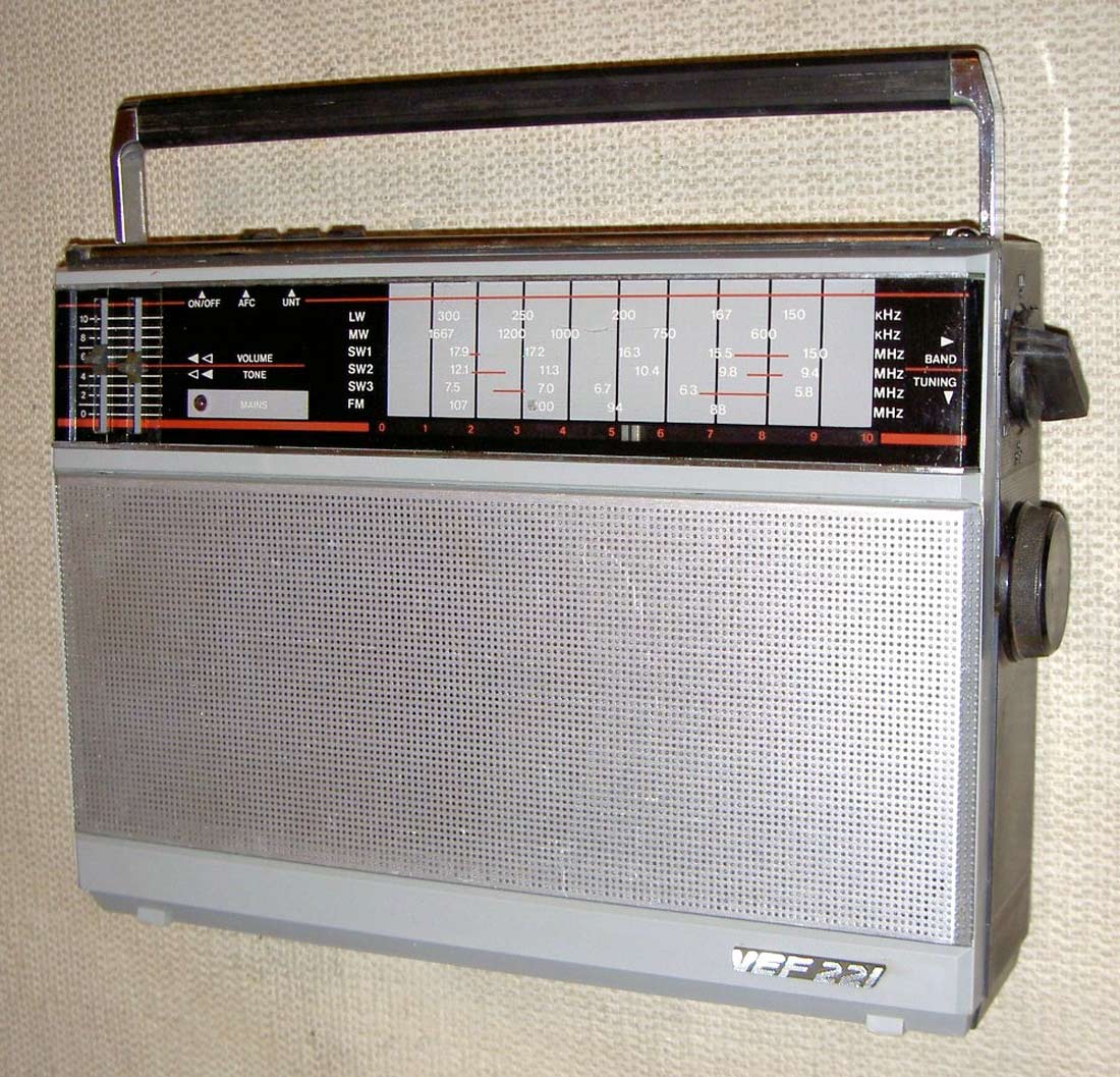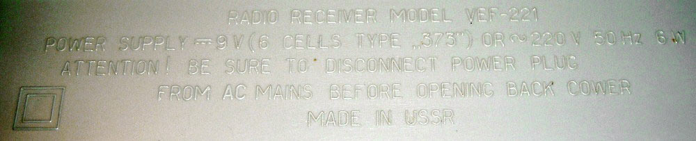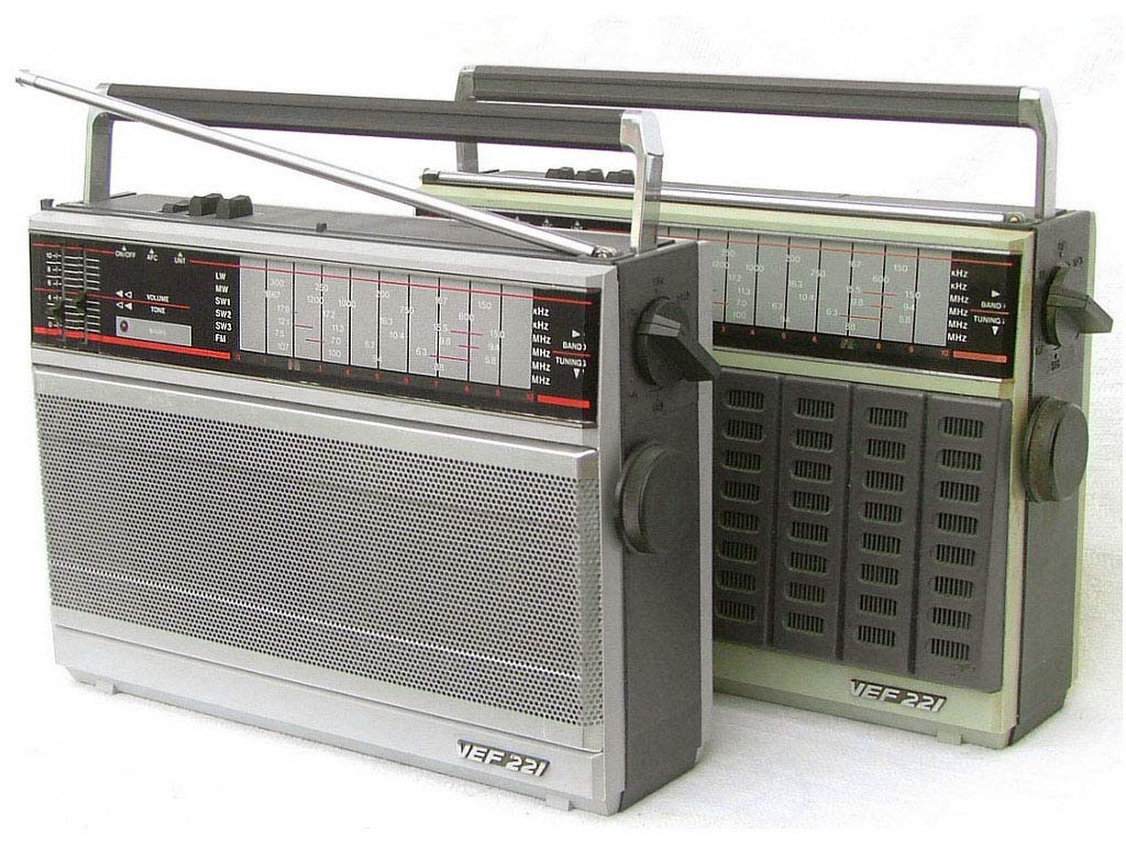 Портативный радиоприёмник *VEF-221* выпускался с 1988 года Рижским ПО *ВЭФ*. Радиоприёмник 2 группы сложности **VEF-221** поставлялся на экспорт. Диапазоны: ДВ, СВ, КВ-1 17,9...15,0 МГц, КВ-2 9,4...12,1 МГц, КВ-3 5,9...7.5 МГц и УКВ 88...108 МГц. В модели имеется система АПЧГ, АРУ, бесшумная настройка. Есть гнездо для головного телефона сопротивлением 50...120 Ом, гнездо магнитофона. Для приёма в диапазонах ДВ, СВ приёмник имеет внутреннюю магнитную антенну, а в диапазонах КВ (SW) выдвижную, телескопическую. Приём может осуществляться и на наружную антенну. Чувствительность в диапазоне ДВ - 1,5 мВ/м, СВ - 0,7мВ.м, КВ - 0,3 мВ/м, УКВ - 50 мкВ. Селективность - 26 дБ. Полоса частот при работе на УКВ - 150...10000 Гц. Номинальная выходная мощность 250 мВт. Питание от сети или 6 элементов 373. Потребляемый ток без сигнала 14 мА. Комплекта батарей при средней громкости хватает на 100 часов. Размер приёмника 297х247х80 мм, масса без батарей 2,3 кг. С 1992 года выпускался радиоприёмник *VEF-221-1*, который кроме наименования полностью аналогичен описанному выше.