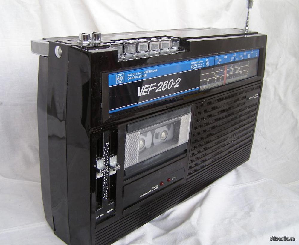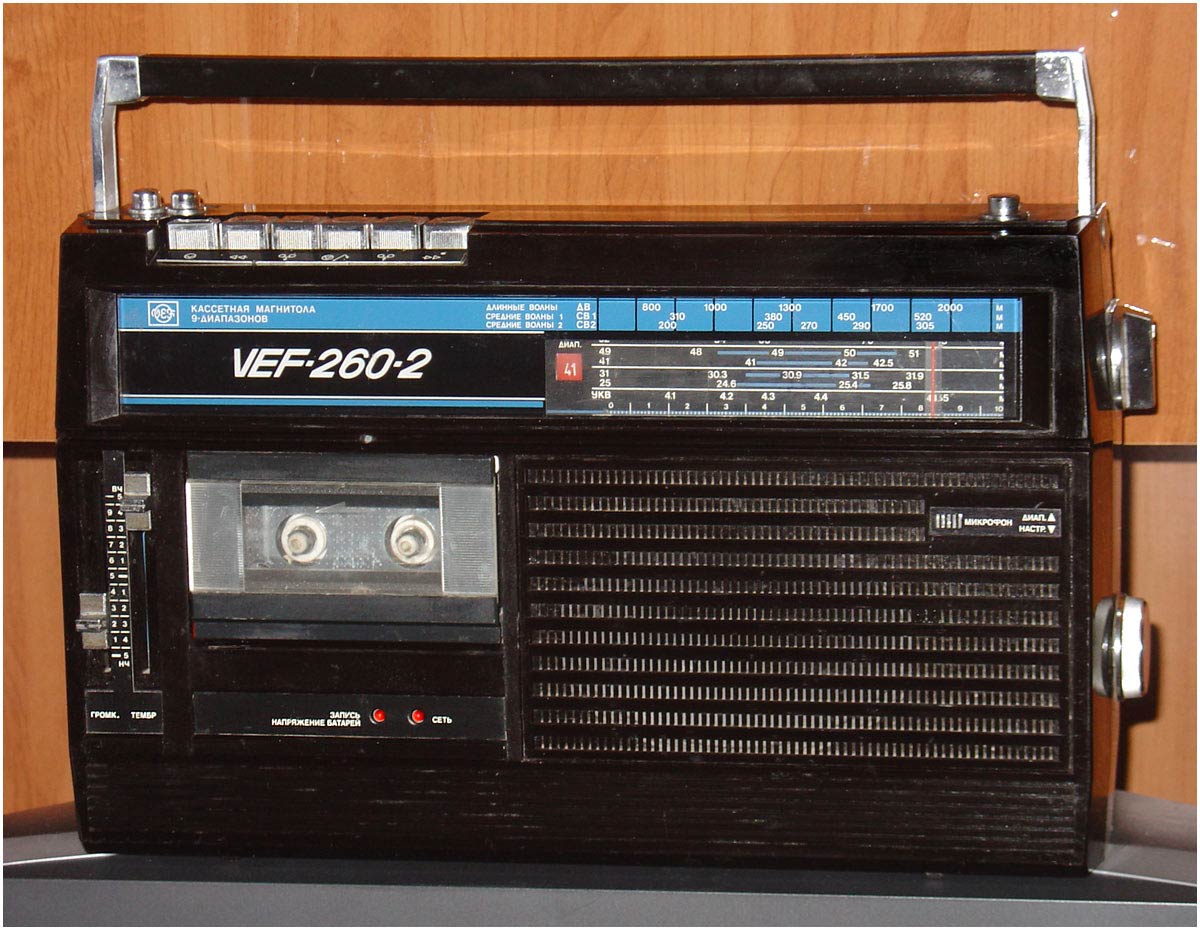 Переносная кассетная магнитола *ВЭФ-260-2* с 1984 года выпускал Рижский Государственный электротехнический завод ВЭФ. Это модернизация магнитолы **Вэф-260**. По конструкции и схеме, кроме оформления магнитолы не отличаются. В магнитоле предусмотрены: Девять диапазонов: ДВ, два СВ, УКВ и пять КВ. АПЧ в УКВ диапазоне. Световой индикатор настройки. Электретный микрофон. АРУЗ. Временная остановки магнитной ленты. Переключатель отстройки от помех при записи с приёмника. Регулятор тембра по ВЧ и НЧ. Питание: сеть или 6 элементов 373. Номинальная выходная мощность 0,5, максимальная 1,2 Вт. Чувствительность в диапазонах ДВ - 2 мВ/м, СВ - 1,5 мВ/м, КВ 0,2 мВ/м, УКВ 0,05 мВ/м. Диапазон частот в АМ - 125...4000 Гц, ЧМ - 125...10000 Гц, записи 60...10000 Гц. Отношение сигнал/шум в канале записи -44 дБ. Коэффициент детонации 0,35%. Габариты магнитолы 417х240х106 мм. Вес с батареями 4,4 кг.