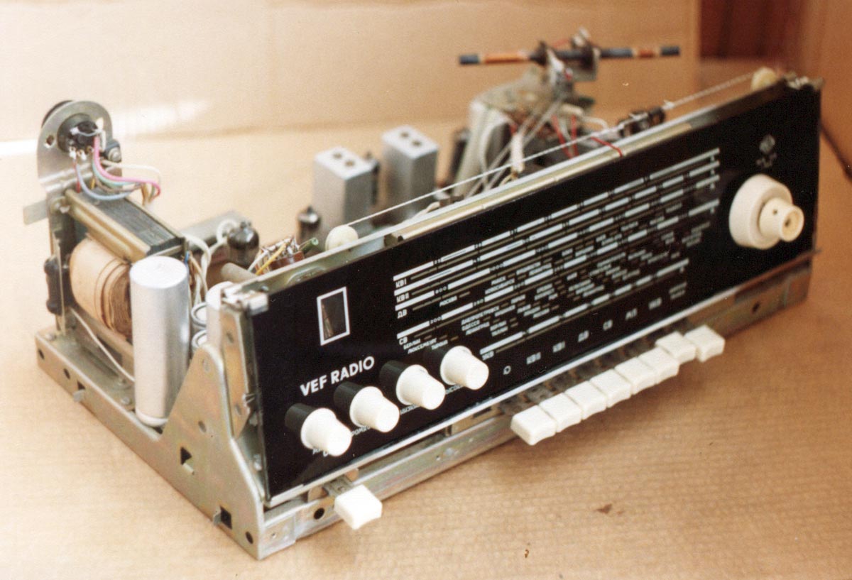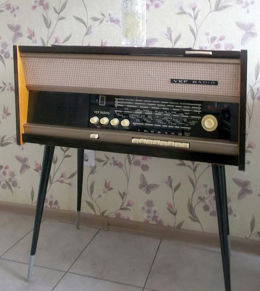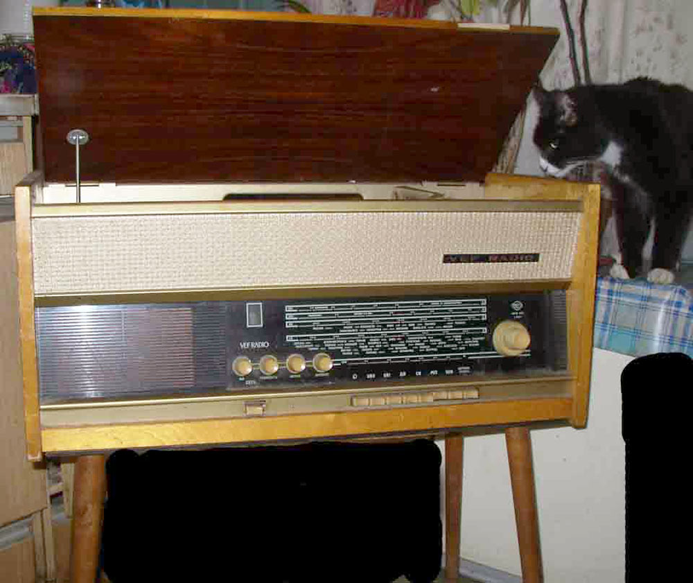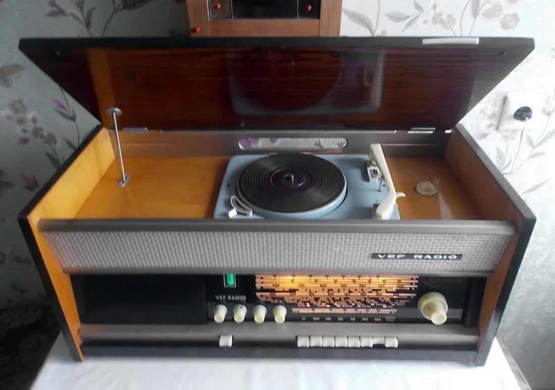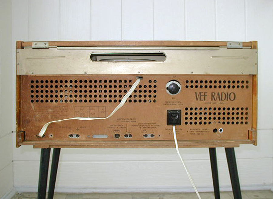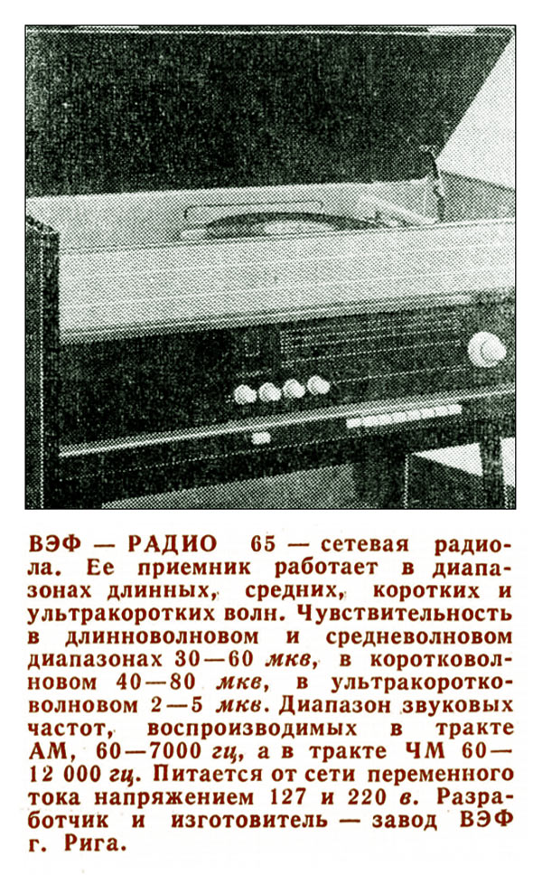 Радиола *Вэф-Радио* (**ВЭФ-Радио-65**) с начала 1965 года выпускалась Рижским электротехническим заводом *ВЭФ*. Радиола состоит из 8-ми лампового супергетеродинного приёмника первого класса и 3-х скоростного электропроигрывающего устройства III-ЭПУ-20 (II-ЭПУ-40). Радиоприёмник рассчитан на приём в диапазонах ДВ, СВ, КВ и УКВ, КВ диапазон разбит на два поддиапазона. В радиоле имеется плавная регулировка тембра по ВЧ и НЧ. Принципиальная схема радиолы схожа со схемой радиолы **Ригонда-моно** за исключением небольших изменений в номиналах элементов в блоке КСДВ-ПЧ и БП и отличается оформлением футляра, который может быть напольным и (или) настольным. АС состоит из громкоговорителя 4ГД-4. Размеры радиолы 740х336х320 мм. Масса 21 кг. Диапазоны: ДВ 150...408 кГц, СВ 525...1605 кГц, КВ-1 3,95...7,4 МГц, КВ-2 9,1...12 МГц и УКВ 65,8...73 МГц. Чувствительность с внешней антенной в диапазонах ДВ, СВ, КВ - 50 мкВ, в диапазоне УКВ 5 мкВ. Чувствительность с магнитной антенной в диапазонах ДВ, СВ 1,5 мВ/м. В тракте AM, ПЧ 465 кГц, ширина полосы пропускания при ослаблении сигнала 6 дБ в положении **узкая полоса** 5 кГц, **широкая полоса** 11 кГц и в положении **местный приём** 15 кГц. В тракте ЧМ, ПЧ 6,5 МГц, полоса пропускания 150 КГц. Избирательность по AM тракту 60 дБ. АРУ обеспечивает изменение сигнала на выходе на 11 дБ при изменении на входе на 40 дБ. Максимальная выходная мощность 3,5 Вт. Диапазон рабочих частот AM тракта 80...6000 Гц, ЧМ тракта 80...12000 Гц, грамзаписи 80..10000 Гц. ЭПУ снабжён автовыключателем и микролифтом и рассчитан на воспроизведение пластинок на скоростях 78, 45 и 33 об/мин. Потреблямая мощность при приёме 60 Вт, а при прослушивании грамзаписи 75 Вт.