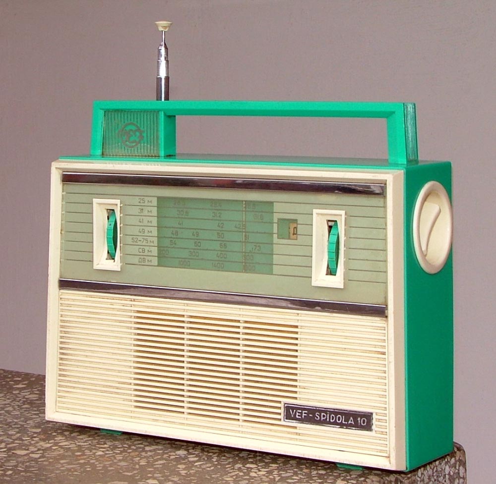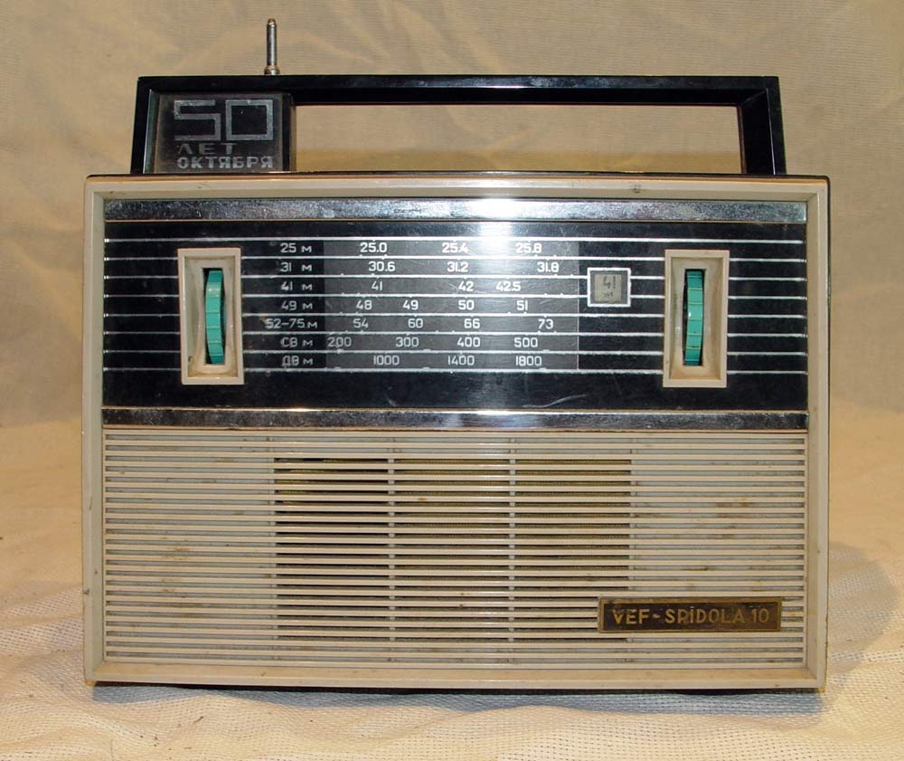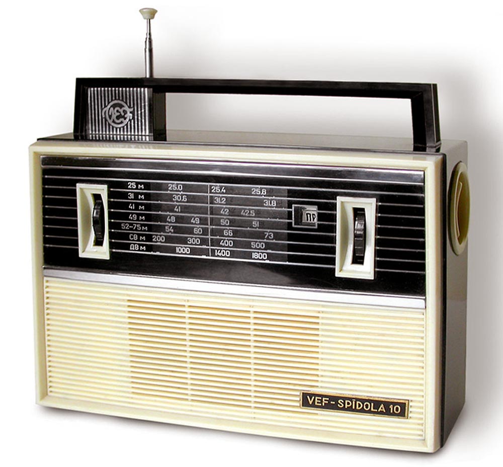 Портативный транзисторный радиоприёмник *ВЭФ-Спидола-10* с 1965 года выпускал Государственный электротехнический завод *ВЭФ*. Радиоприемник *ВЭФ-Спидола-10* (ПМК-65) выпускался совместно с радиоприёмником *ВЭФ-Спидола* для увеличения ассортимента выпускаемой заводом продукции и кроме оформления схож с ним. Он собран на 10 транзисторах и двух диодах и предназначен для приёма радиовещательных станций в диапазонах: ДВ, СВ и КВ. КВ диапазон разбит на 5 поддиапазонов (4 растянутых и 1 полурастянутый). Переключение диапазонов производится при помощи барабанного переключателя. В диапазонах ДВ, СВ приём осуществляется на магнитную антенну, а в диапазоне KB - на выдвижную телескопическую. Максимальная выходная мощность приёмника 250 мВт. Питание от шести элементов Сатурн или двух батарей КБС-Л-0,5. Потребление тока зависит от уровня сигнала в выходном каскаде, при напряжении питания 9 В и выходной мощности 150 мВт оно равно 50 мА. При ежедневной работе приёмника в течение 3-х часов комплекта батарей А-373 хватает на 200 часов. Приёмник имеет эффективную систему АРУ, ручную регулировку уровня громкости, гнёзда для внешнего пьезоэлектрического звукоснимателя, АС, антенны и питания. Габариты радиоприёмника *ВЭФ-Спидола-10* - 275х197х90 мм, масса без батарей - 2,2 кг.