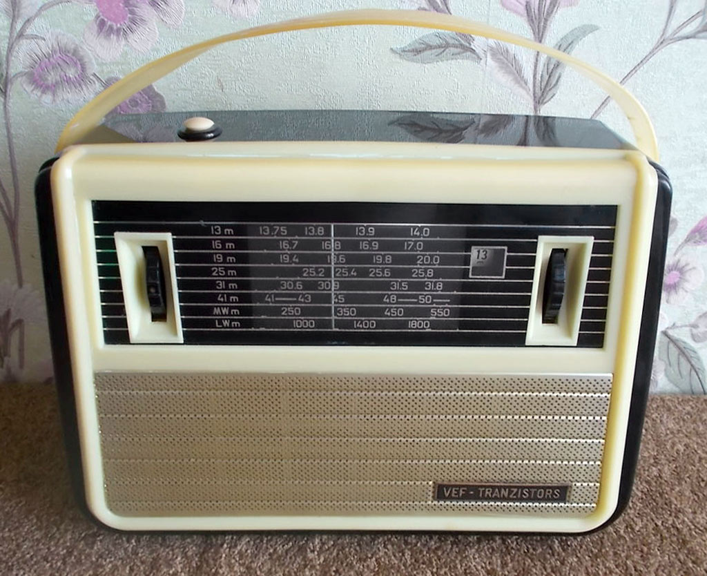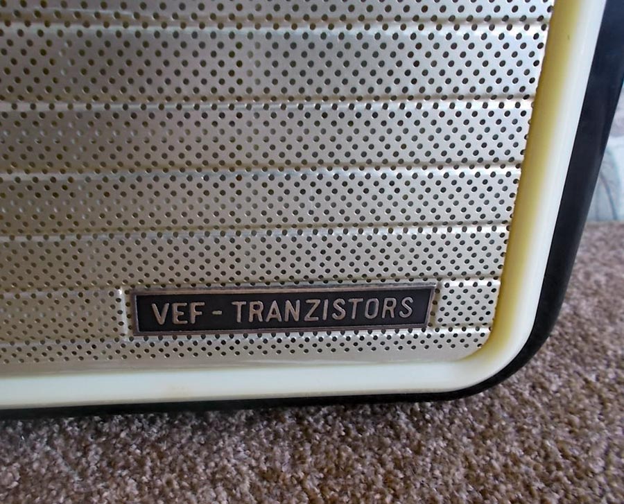 Портативный радиоприёмник *ВЭФ-Транзистор* с 1965 года выпускал Рижский Государственный электротехнический завод *ВЭФ*. **VEF-Transistor** - экспортный вариант серийного радиоприёмника **ВЭФ-Спидола**. Экспортный радиоприёмник это полный аналог базового, за исключением поддиапазонов коротких волн, значения которых соответствуют стандартам принятым в Европейских странах. *VEF-Transistor* - переносный приёмник на 10 транзисторах. Работает он в диапазонах длинных, средних и коротких (поддиапазоны 13, 16, 19, 25, 31 метр и растянутый диапазон 41...52 метра) волн. Для тропических стран был диапазон перекрывающий промежуточные волны от 85 до 200 метров. Чувствительность приёмника с магнитной антенной на ДВ, СВ - 0,5...1,0 мВ/м. На КВ поддиапазонах с штыревой антенной - 50 мкВ. Номинальная выходная мощность 150 мВт. Диапазон воспроизводимых частот 350...4000 Гц. Питание от 2-х батарей КБС-Л-0,5 или от 6-ти Сатурн. Размеры приёмника 280х230х92 мм. Масса 2,4 кг. По общей схеме и конструкции, но в других футлярах и с другими шкально верньерными устройствами завод выпускал модели **Спидола**, **Вэф-Спидола** и **Вэф-Спидола-10**.
