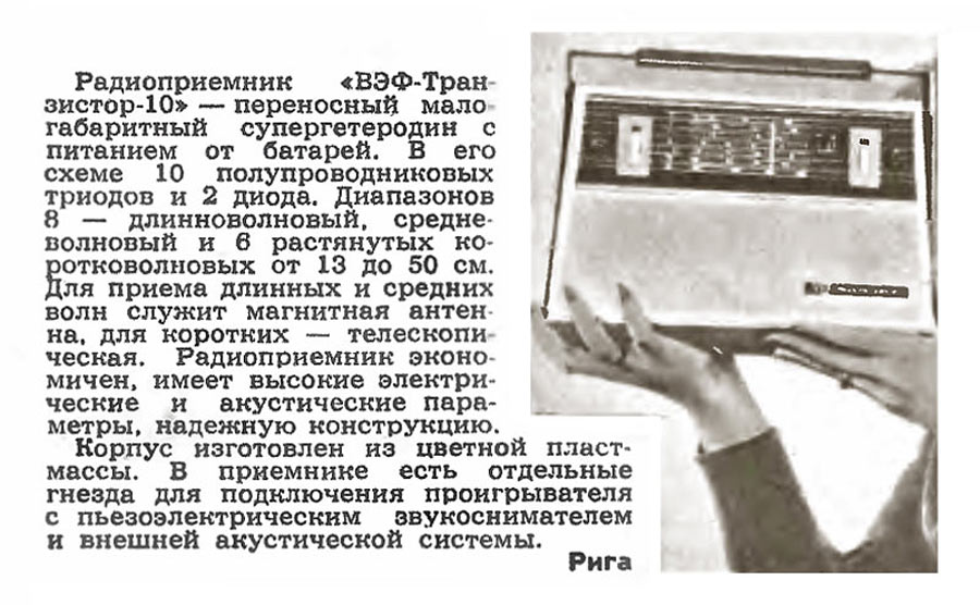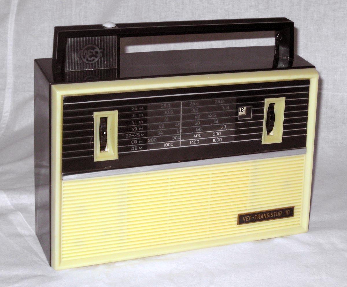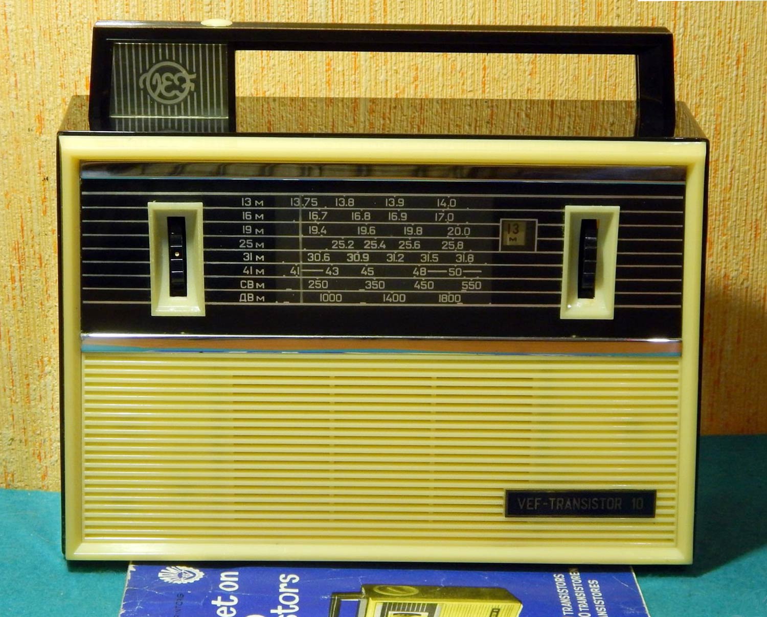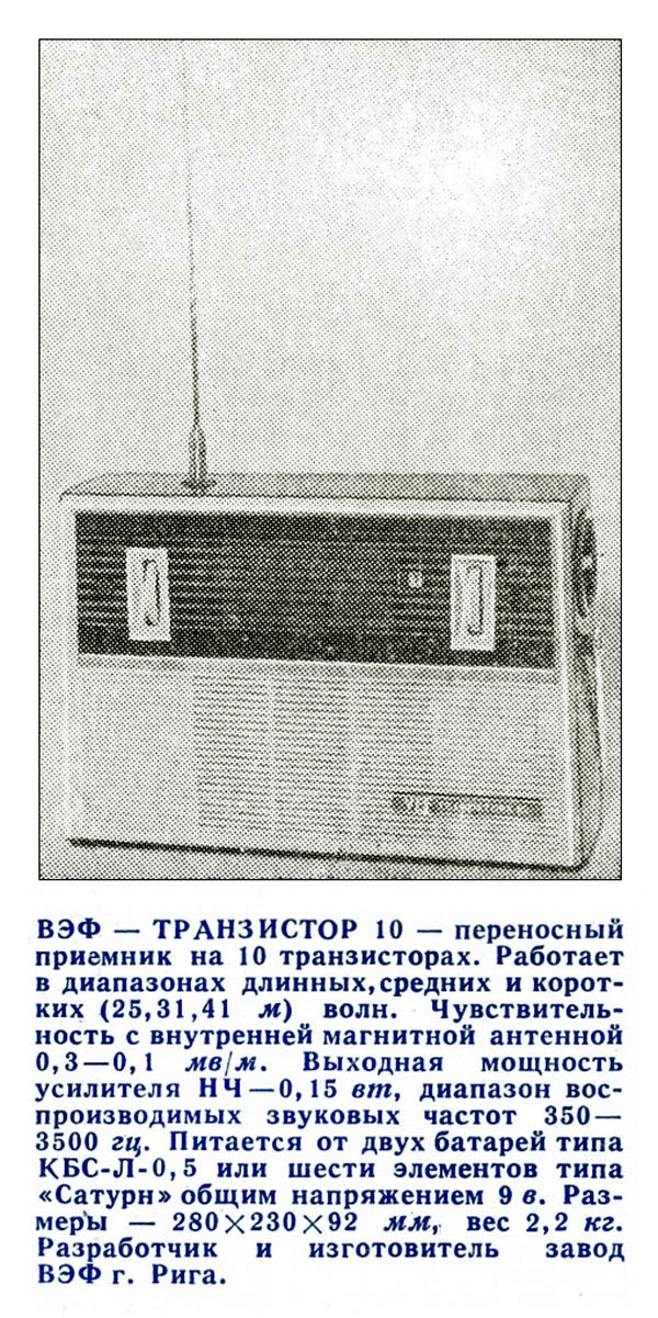 Радиоприёмник *ВЭФ-Транзистор-10* с 1965 года выпускал Рижский Государственный завод *ВЭФ*. **ВЭФ-Транзистор-10** - это переносный радиоприёмник на 10 транзисторах. Он работает в диапазонах: ДВ, СВ и поддиапазонах КВ - 25, 31, 41, 49, 75 метров. Экспортный вариант имел КВ поддиапазоны: 13, 16 и 19 метров, но в нём были убраны поддиапазоны 49 и 75 метров. Были и экспортные варианты приёмники перекрывающие промежуточные волны 85..200 метров. Чувствительность приёмника с магнитной антенной на ДВ, СВ - 1,0...1,5 мВ/м. На КВ поддиапазонах со штыревой антенной - 60 мкВ. Номинальная выходная мощность 150 мВт, диапазон звуковых частот воспроизводимых громкоговорителем 350...3500 Гц. Питается приёмник от 2-х батарей КБС-Л-0,5 или 6-ти элементов Сатурн. Габариты приёмника - 280х230х92 мм, масса 2,4 кг. Для увеличения ассортимента по практически одинаковой электрической схеме и конструкции, за исключением корпусов и шкально верньерных устройств завод выпускал приёмники **ВЭФ-Спидола**, **ВЭФ-Спидола-10**, *ВЭФ-Транзистор* и их экспортные аналоги.