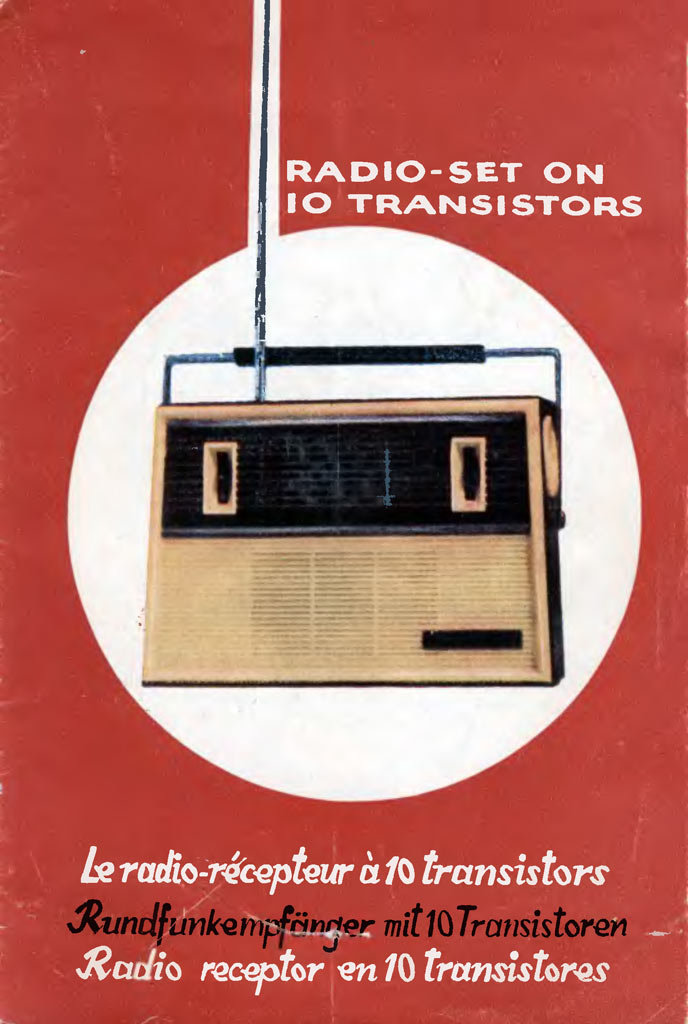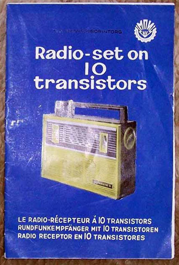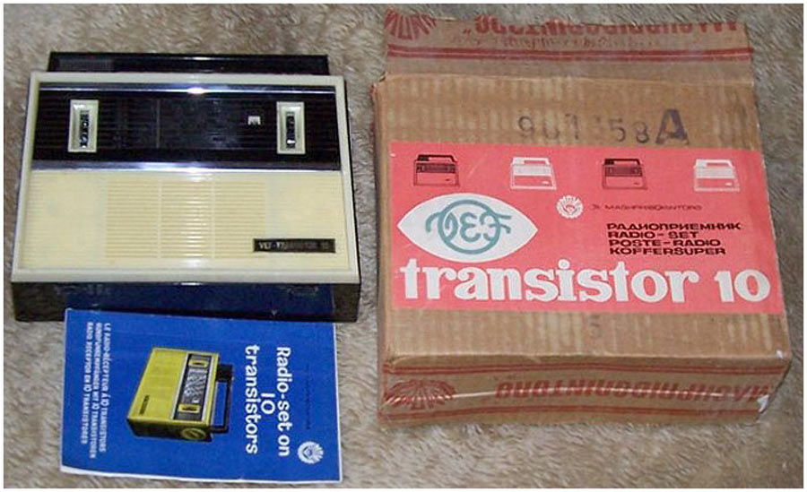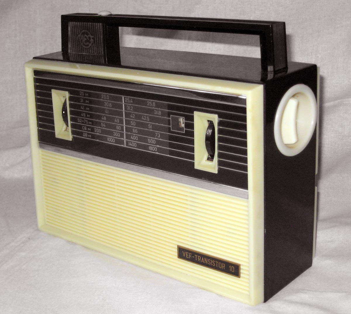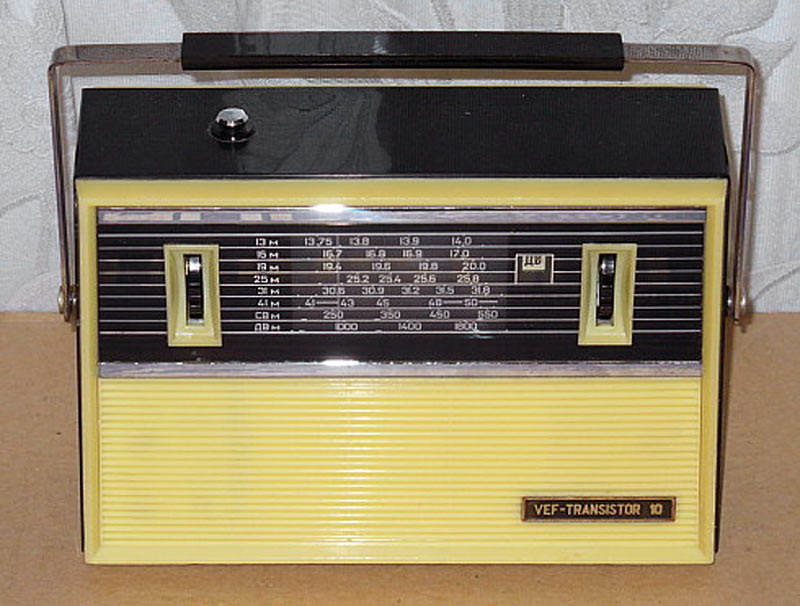 Радиоприёмник *ВЭФ-Транзистор-10* с 1965 года выпускал Рижский Государственный завод *ВЭФ*. **ВЭФ-Транзистор-10** - это переносный радиоприёмник на 10 транзисторах. Он работает в диапазонах: ДВ, СВ и поддиапазонах КВ - 25, 31, 41, 49, 75 метров. Экспортный вариант имел КВ поддиапазоны: 13, 16 и 19 метров, но в нём были убраны поддиапазоны 49 и 75 метров. Были и экспортные варианты приёмники перекрывающие промежуточные волны 85..200 метров. Чувствительность приёмника с магнитной антенной на ДВ, СВ - 1,0...1,5 мВ/м. На КВ поддиапазонах со штыревой антенной - 60 мкВ. Номинальная выходная мощность 150 мВт, диапазон звуковых частот воспроизводимых громкоговорителем 350...3500 Гц. Питается приёмник от 2-х батарей КБС-Л-0,5 или 6-ти элементов Сатурн. Габариты приёмника - 280х230х92 мм, масса 2,4 кг. Для увеличения ассортимента по практически одинаковой электрической схеме и конструкции, за исключением корпусов и шкально верньерных устройств завод выпускал приёмники **ВЭФ-Спидола**, **ВЭФ-Спидола-10**, *ВЭФ-Транзистор* и их экспортные аналоги.