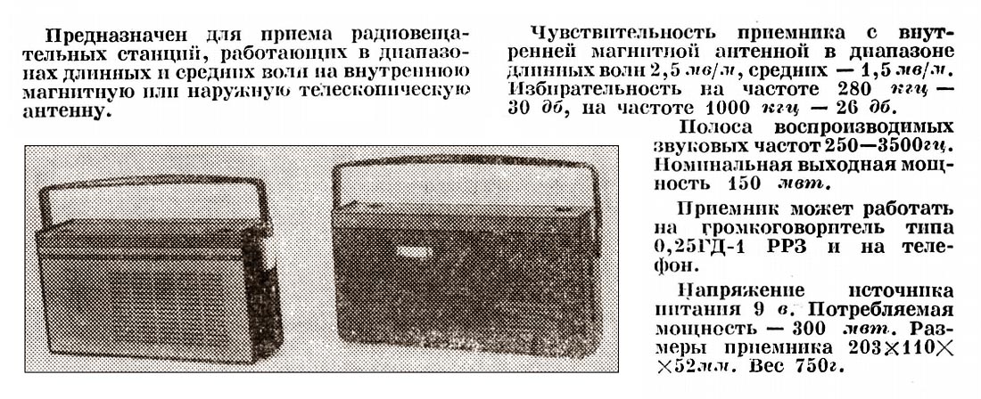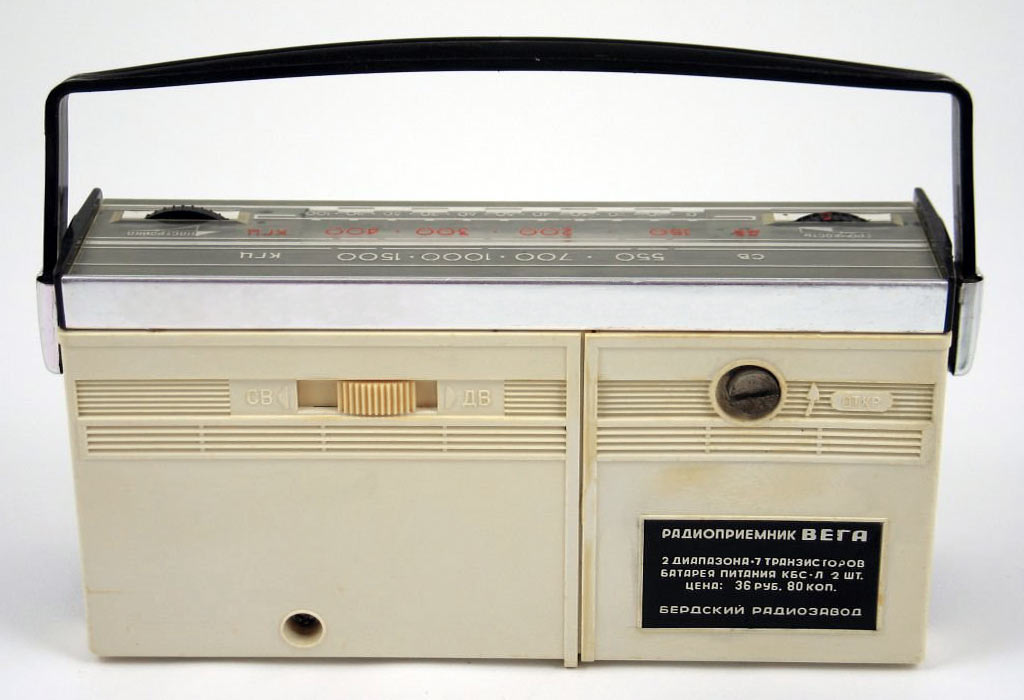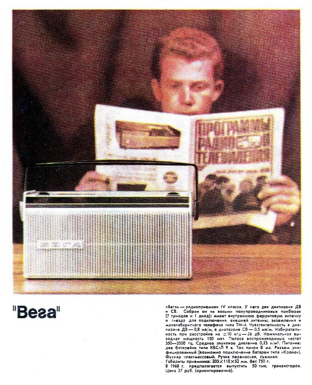 Портативный транзисторный радиоприёмник *Вега* с 1968 по 1972 год выпускал Бердский радиозавод. *Вега* первый портативный транзисторный приёмник Бердского радиозавода. Он создан на базе модели *РИГА-301Б* Рижского завода имени Попова 1966 года выпуска. До конца 1968 года радиоприёмник *Вега* имел схожий с базовой моделью вид. Переносной радиоприёмник 4 класса **Вега** предназначен для приёма радиостанций в диапазонах ДВ, СВ на магнитную антенну. Чувствительность в диапазонах ДВ - 2,5, СВ - 1,5 мВ/м. Избирательность по соседним каналам - 26 дБ. Полоса воспроизводимых звуковых частот - 350...3500 Гц. Номинальная выходная мощность на громкоговорителе 0,25 ГД-1 - 150 мВт. В приёмнике имеются гнёзда для внешнего громкоговорителя, головного телефона, наружной антенны и заземления. Питается радиоприёмник от двух батарей КБСЛ-336, общим напряжением 9 вольт или от батареи Крона. Размеры приёмника 203х110х52 мм, масса без батарей 750 гр. Цена - 36 рублей 80 копеек. Бердский радиозавод закончил производство радиоприёмника **Вега** в ноябре 1971 года заменив его новым радиоприёмником **Вега-402**.
