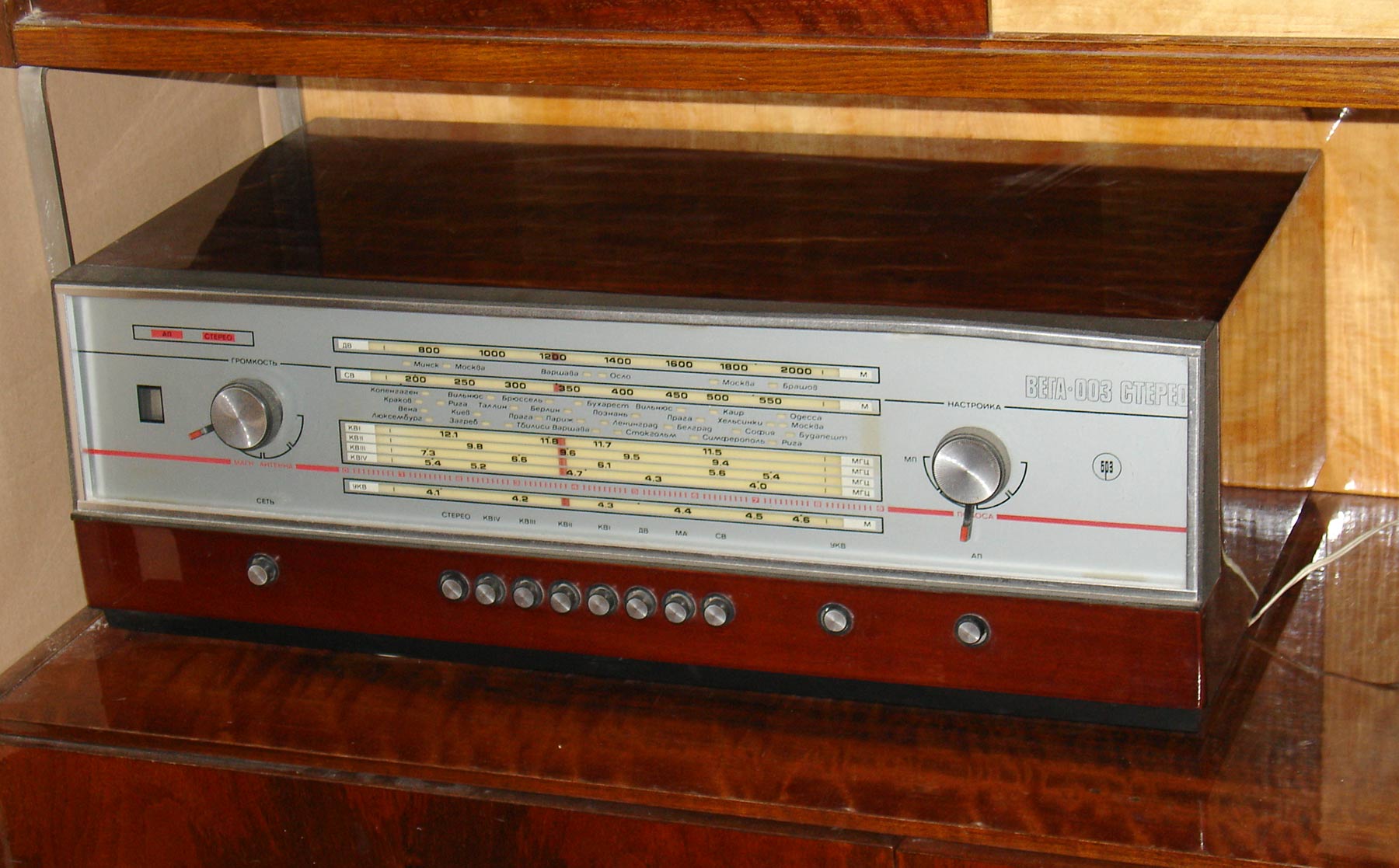 Радиола *Вeгa-003-стерео* с середины 1974 года выпускалась Бердским радиозаводом. Стереофоническая радиола высшего класса **Вега-001-стерео** из-за применённого ЭПУ типа II-ЭПУ-62С Рижского ЭМЗ в электрофоне *Вега ЭПУ-НЧ* (*Вега-103*) не могла быть радиолой высшего класса, поэтому через 5 месяцев радиола была заменена на модель **Вега-003-стерео**, где в качестве ЭПУ и усилителя использовался электрофон **Вега-002-стерео** с ЭПУ высшего класса *Унитра*, он описан отдельно. В тюнере были заменены надписи на шкале и задней стенке. Радиола **Вега-003-стерео** рассчитана на приём в диапазонах ДВ, СВ, KB-1...КВ-5 и с ЧМ в диапазоне УКВ и для приёма стереофонических передач в диапазоне УКВ и проигрывания моно и стереофонических грампластинок всех форматов. Чувствительность с внутренней магнитной антенной в диапазонах ДВ 1,5 мВ/м, СВ 1 мВ/м, а при работе с наружной антенной чувствительность в диапазонах: ДВ, СВ и KB - 50 мкВ, УКВ-ЧМ - 5 мкВ. ВЧ тракт радиолы ламповый, полностью повторяя модель **Вега-001-стерео**. Номинальная выходная мощность УНЧ - 2х6 Вт. Полоса воспроизводимых частот AM тракта - 40...7000 Гц, ЧМ - 40...16000 Гц. Электрофон имеет 4-х или 3-х скоростное ЭПУ с регулировкой скорости вращения диска по стробоскопу. В нём применён тонарм с микролифтом, противовесом регулировки баланса и приведённого веса с электромагнитной головкой. Диапазон частот при прослушивании грамзаписи 40...18000 Гц. АС состоит из 2-х АС *10MAC-1M*. Размеры радиоприёмника 650х215х340 мм. ЭПУ с усилителем (электрофона) 485х341х115 мм.