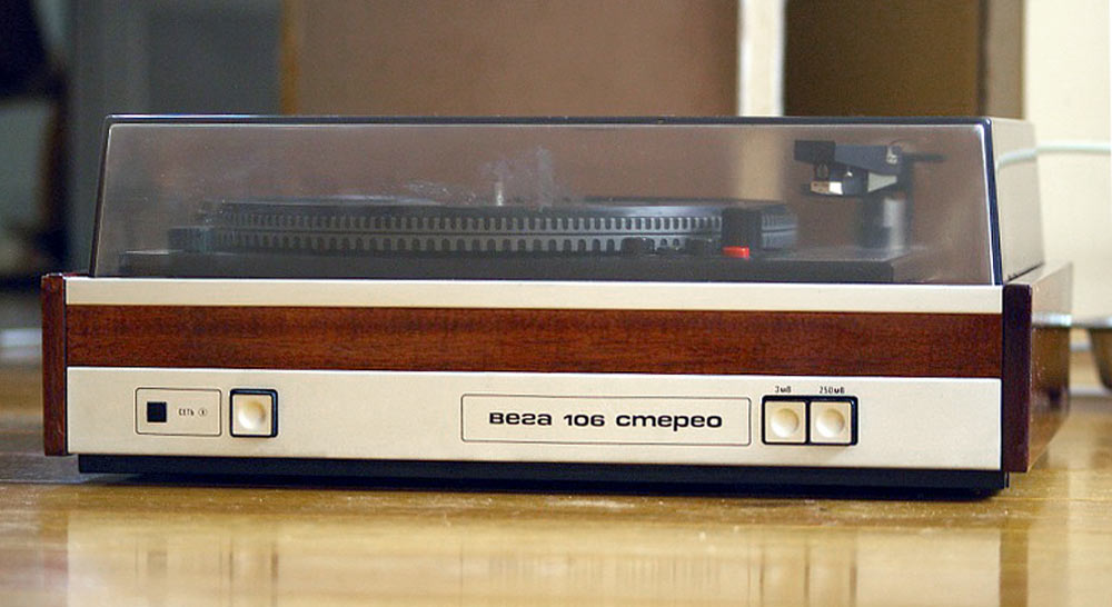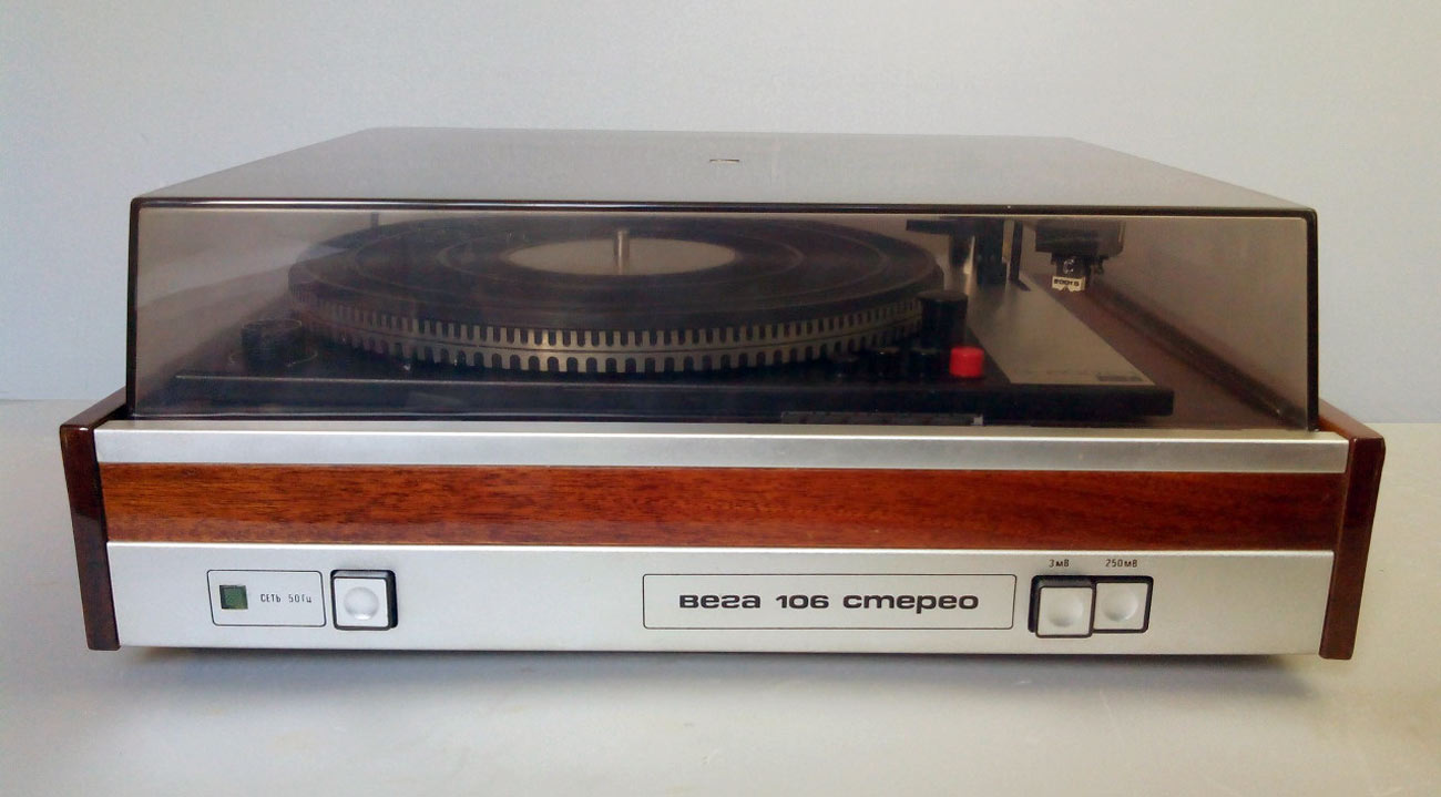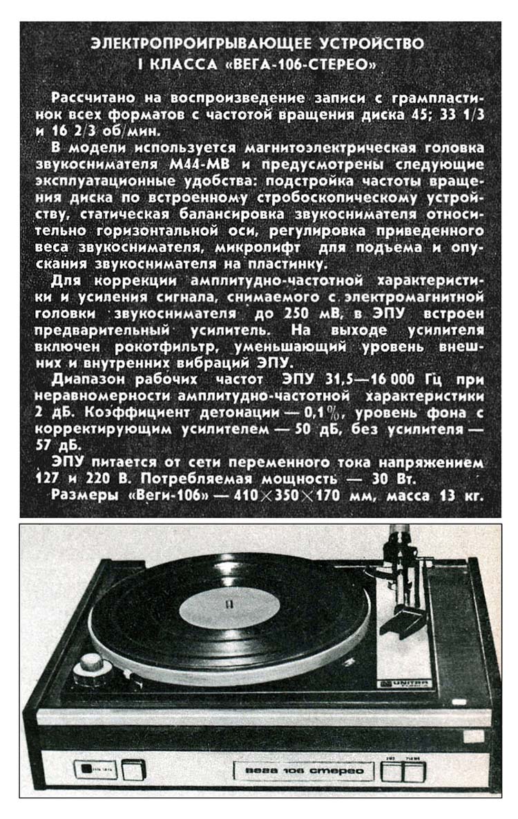Стереофонический электропроигрыватель 1-го класса *Вега-106-стерео* с 1976 года выпускал Бердский радиозавод. Предназначен для проигрывания грампластинок всех форматов на скорости вращения диска 16, 33 и 45 об/мин, позже (с 1978 года) только 33 и 45 об/мин. B проигрывателе применён магнитоэлектрический звукосниматель, есть подстройка частоты вращения диска по стробоскопу, статическая балансировка звукоснимателя, регулировка приведённого веса и микролифт. Диапазон рабочих частот с ЛВ 31,5...16000 Гц. Потребляемая мощность 30 Вт. Размеры ЭП - 410х350х170 мм. Масса 13 кг. Цена 160 рублей. ЭП выпускалась на две скорости с ЭПУ G-600 и G-602, но в первых выпусках ставили даже четырёхскоростное (16, 33, 45 и 78 об/мин) ЭПУ с механическим приводом.